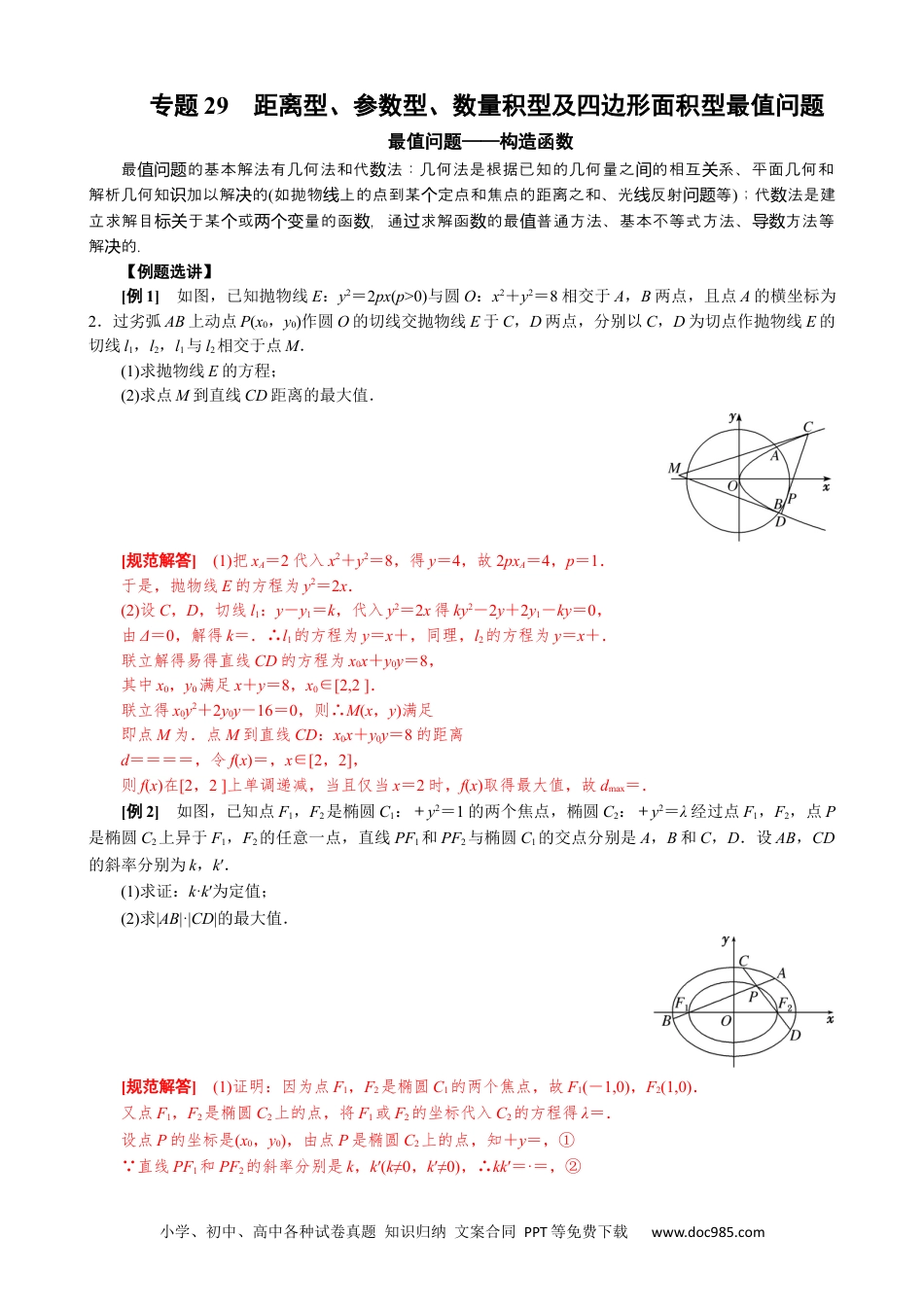 小学、初中、高中各种试卷真题知识归纳文案合同PPT等免费下载www.doc985.com专题29距离型、参数型、数量积型及四边形面积型最值问题最值问题——构造函数最的基本解法有几何法和代法:几何法是根据已知的几何量之的相互系、平面几何和值问题数间关解析几何知加以解的识决(如抛物上的点到某定点和焦点的距离之和、光反射等线个线问题);代法是建数立求解目于某或量的函,通求解函的最普通方法、基本不等式方法、方法等标关个两个变数过数值导数解的.决【例题选讲】[例1]如图,已知抛物线E:y2=2px(p>0)与圆O:x2+y2=8相交于A,B两点,且点A的横坐标为2.过劣弧AB上动点P(x0,y0)作圆O的切线交抛物线E于C,D两点,分别以C,D为切点作抛物线E的切线l1,l2,l1与l2相交于点M.(1)求抛物线E的方程;(2)求点M到直线CD距离的最大值.[规范解答](1)把xA=2代入x2+y2=8,得y=4,故2pxA=4,p=1.于是,抛物线E的方程为y2=2x.(2)设C,D,切线l1:y-y1=k,代入y2=2x得ky2-2y+2y1-ky=0,由Δ=0,解得k=.∴l1的方程为y=x+,同理,l2的方程为y=x+.联立解得易得直线CD的方程为x0x+y0y=8,其中x0,y0满足x+y=8,x0∈[2,2].联立得x0y2+2y0y-16=0,则∴M(x,y)满足即点M为.点M到直线CD:x0x+y0y=8的距离d====,令f(x)=,x∈[2,2],则f(x)在[2,2]上单调递减,当且仅当x=2时,f(x)取得最大值,故dmax=.[例2]如图,已知点F1,F2是椭圆C1:+y2=1的两个焦点,椭圆C2:+y2=λ经过点F1,F2,点P是椭圆C2上异于F1,F2的任意一点,直线PF1和PF2与椭圆C1的交点分别是A,B和C,D.设AB,CD的斜率分别为k,k′.(1)求证:k·k′为定值;(2)求|AB|·|CD|的最大值.[规范解答](1)证明:因为点F1,F2是椭圆C1的两个焦点,故F1(-1,0),F2(1,0).又点F1,F2是椭圆C2上的点,将F1或F2的坐标代入C2的方程得λ=.设点P的坐标是(x0,y0),由点P是椭圆C2上的点,知+y=,① 直线PF1和PF2的斜率分别是k,k′(k≠0,k′≠0),∴kk′=·=,②小学、初中、高中各种试卷真题知识归纳文案合同PPT等免费下载www.doc985.com由①②可得kk′=-,即k·k′为定值.(2)直线PF1的方程可表示为y=k(x+1)(k≠0),与椭圆C1的方程联立,得到方程组消去y得(1+2k2)x2+4k2x+2k2-2=0.设A(x1,y1),B(x2,y2),则x1+x2=-,x1x2=.|AB|=|x1-x2|==.同理可求得|CD|=,则|AB|·|CD|==4≤,当且仅当k=±时等号成立.故|AB|·|CD|的最大值为.[例3]已知椭圆+=1(a>b>0)的离心率e=,左、右焦点分别为F1,F2,且F2与抛物线y2=4x的焦点重合.(1)求椭圆的标准方程;(2)若过F1的直线交椭圆于B,D两点,过F2的直线交椭圆于A,C两点,且AC⊥BD,求|AC|+|BD|的最小值.[规范解答](1)抛物线y2=4x的焦点坐标为(1,0),所以c=1,又因为e===,所以a=,所以b2=2,所以椭圆的标准方程为+=1.(2)①当直线BD的斜率k存在且k≠0时,直线BD的方程为y=k(x+1),代入椭圆方程+=1,并化简得x2+6k2x+3k2-6=0.Δ=36k4-4(3k2+2)(3k2-6)=48(k2+1)>0恒成立.设B(x1,y1),D(x2,y2),则x1+x2=-,x1x2=,|BD|=·|x1-x2|==,由题意知AC的斜率为-,所以|AC|==.|AC|+|BD|=4=≥==.当且仅当3k2+2=2k2+3,即k=±1时,上式取等号,故|AC|+|BD|的最小值为.②当直线BD的斜率不存在或等于零时,可得|AC|+|BD|=>.综上,|AC|+|BD|的最小值为.[题后悟通]题目中未直接告诉我们不等关系,则选择将|AC|+|BD|表示为关于k的函数,再行处理,注意到3k2+2+2k2+3=5(k2+1),所以可以考虑基本不等式,但一定要注意等号是否能够成立.当然这里也可以利用换元法.令k2+1=t(t≥1),将原式转化为来处理,但稍微比较复杂一些.[例4]已知椭圆E:+=1(a>b>0)的一个焦点为F2(1,0),且该椭圆过定点M.(1)求椭圆E的标准方程;(2)设点Q(2,0),过点F2作直线l与椭圆E交于A,B两点,且F2A=λF2B,λ∈[-2,-1],以QA,QB为邻边作平行四边形QACB,求对角线QC长度的最小值.小学、初中、高中各种试卷真题知识归纳文案合同PPT等免费下载www.doc985.com[规范解答](1)由题易...