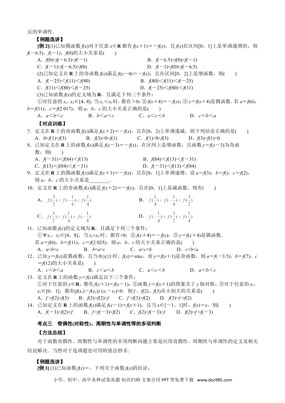 专题九函数的奇偶性、周期性与单调性的综合问题函数的奇偶性、周期性及单调性是函数的三大性质,在高考中常常将它们综合在一起命题,解题时,往往需要借助函数的奇偶性和周期性来确定另一区间上的单调性,即实现区间的转换,再利用单调性解决相关问题.主要题型有奇偶性、周期性及单调性的判断,比较大小以及多结论的正误判断等.考点一奇偶性、周期性与单调性的判断【方法总结】对于函数奇偶性、周期性与单调性的判断问题主要是应用奇偶性、周期性与单调性的定义及相关结论解决.当然对于选填题也可用特值法秒杀.【例题选讲】[例1](1)已知函数f(x)=则下列结论正确的是()A.f(x)是偶函数B.f(x)是增函数C.f(x)是周期函数D.f(x)的值域为[-1,+∞)(2)已知函数f(x)=loga(ax+1)+x(a>0且a≠1),则()A.f(x)图象关于原点对称B.f(x)图象关于y轴对称C.f(x)在R上单调递增D.f(x)在R上单调递减【对点训练】1.定义在R上的函数f(x)满足f(x)=f(-x),且f(x)=f(x+6),当x∈[0,3]时,f(x)单调递增,则f(x)在下列哪个区间上单调递减()A.[3,7]B.[4,5]C.[5,8]D.[6,10]2.定义在R上的奇函数f(x)满足f=f(x),当x∈时,f(x)=(1-x),则f(x)在区间内是()A.减函数且f(x)>0B.减函数且f(x)<0C.增函数且f(x)>0D.增函数且f(x)<03.已知函数f(x)=ex-1-e-x+1,则下列说法正确的是()A.函数f(x)的最小正周期是1B.函数f(x)是单调递减函数C.函数f(x)的图象关于直线x=1轴对称D.函数f(x)的图象关于(1,0)中心对称4.已知函数f(x)是定义域为R的偶函数,且f(x+1)=,若f(x)在[-1,0]上是减函数,那么f(x)在[2,3]上是()A.增函数B.减函数C.先增后减的函数D.先减后增的函数5.定义在R上的奇函数f(x)满足f(x+1)=f(-x),当x∈(0,1)时,f(x)=则f(x)在区间内是()A.增函数且f(x)>0B.增函数且f(x)<0C.减函数且f(x)>0D.减函数且f(x)<06.已知函数f(x)=则下列结论正确的是()A.函数f(x)是偶函数B.函数f(x)是减函数C.函数f(x)是周期函数D.函数f(x)的值域为[-1,+∞)考点二比较函数值的大小【方法总结】比较函数值大小的思路:比较函数值的大小时,若自变量的值不在同一个单调区间内,要利用其函数性质,转化到同一个单调区间上进行比较,对于选择题、填空题能数形结合的尽量用图象法求解.同时要充分利用奇函数在关于原点对称的两个区间上具有相同的单调性,偶函数在关于原点对称的两个区间上具有相小学、初中、高中各种试卷真题知识归纳文案合同PPT等免费下载www.doc985.com反的单调性.【例题选讲】[例2](1)已知偶函数f(x)对于任意x∈R都有f(x+1)=-f(x),且f(x)在区间[0,1]上是单调递增的,则f(-6.5),f(-1),f(0)的大小关系是()A.f(0)<f(-6.5)<f(-1)B.f(-6.5)<f(0)<f(-1)C.f(-1)<f(-6.5)<f(0)D.f(-1)<f(0)<f(-6.5)(2)已知定义在R上的奇函数f(x)满足f(x-4)=-f(x),且在区间[0,2]上是增函数,则()A.f(-25)<f(11)<f(80)B.f(80)<f(11)<f(-25)C.f(11)<f(80)<f(-25)D.f(-25)<f(80)<f(11)(3)已知函数f(x)的定义域为R,且满足下列三个条件:①对任意的x1,x2∈[4,8],当x1<x2时,都有>0;②f(x+4)=-f(x);③y=f(x+4)是偶函数.若a=f(6),b=f(11),c=f(2017),则a,b,c的大小关系正确的是()A.a<b<cB.b<a<cC.a<c<bD.c<b<a【对点训练】7.定义在R上的奇函数f(x)满足f(x+2)=-f(x),且在[0,2)上单调递减,则下列结论正确的是()A.0<f(1)<f(3)B.f(3)<0<f(1)C.f(1)<0<f(3)D.f(3)<f(1)<08.已知定义在R上的函数f(x)满足f(x-3)=-f(x),在区间上是增函数,且函数y=f(x-3)为奇函数,则()A.f(-31)<f(84)<f(13)B.f(84)<f(13)<f(-31)C.f(13)<f(84)<f(-31)D.f(-31)<f(13)<f(84)9.定义在R上的偶函数f(x)满足f(x+1)=-f(x),且在[0,1]上单调递增,设a=f(3),b=f(),c=f(2),则a,b,c的大小关系是________.10.定义在R上的奇函数f(x)满足f(x+2)=-f(x),且在[0,1]上是减函数,则有()A.B.C.D.11.已知函数f(x)的定义域为R,且满足下列三个条件:①∀x1,x2∈[4,8],当x1<x2时,...