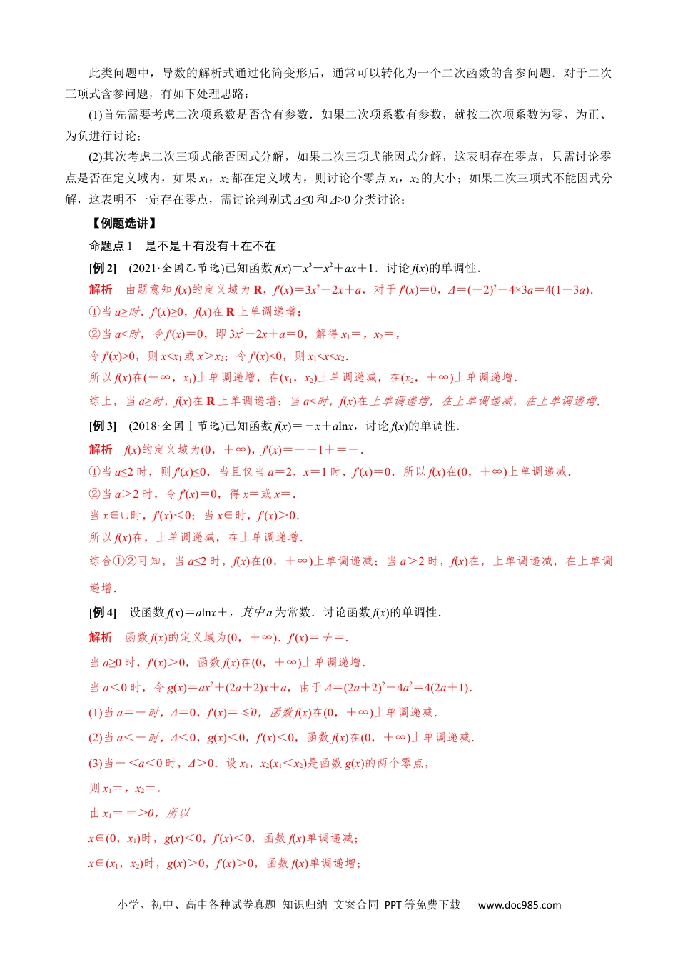 小学、初中、高中各种试卷真题知识归纳文案合同PPT等免费下载www.doc985.com专题05含参函数的单调性讨论【方法总结】分类讨论思想研究函数的单调性讨论含参函数的单调性,其本质就是讨论导函数符号的变化情况,所以讨论的关键是抓住导函数解析式中的符号变化部分,即导数的主要部分,简称导主.讨论时要考虑参数所在的位置及参数取值对导函数符号的影响,一般来说需要进行四个层次的分类:(1)最高次幂的系数是否为0,即“是不是”;(2)导函数是否有变号零点,即“有没有”;(3)导函数的变号零点是否在函数定义域或指定区间内,即“在不在”;(4)导函数的变号零点之间的大小关系,即“大不大”.牢记:十二字方针“是不是,有没有,在不在,大不大”.考点一导主一次型【例题选讲】[例1]已知函数f(x)=x-alnx(a∈R),讨论函数f(x)的单调性.解析f(x)的定义域为(0,+∞),f′(x)=1-=,令f′(x)=0,得x=a,①当a≤0时,f′(x)>0在(0,+∞)上恒成立,∴f(x)在(0,+∞)上单调递增,②当a>0时,x∈(0,a)时,f′(x)<0,x∈(a,+∞)时,f′(x)>0,综上,当a≤0时,f(x)在(0,+∞)上单调递增,当a>0时,f(x)在(0,a)上单调递减,在(a,+∞)上单调递增.【对点训练】1.已知函数f(x)=alnx-ax-3(a∈R).讨论函数f(x)的单调性.1.解析函数f(x)的定义域为(0,+∞),且f′(x)=,令f′(x)=0,得x=1,当a>0时,f(x)在(0,1)上单调递增,在(1,+∞)上单调递减;当a<0时,f(x)在(1,+∞)上单调递增,在(0,1)上单调递减;当a=0时,f(x)为常函数.2.已知函数f(x)=lnx-ax(a∈R),讨论函数f(x)的单调性.2.解析f(x)的定义域为(0,+∞),f′(x)=-a=(x>0),①当a≤0时,f′(x)=-a>0,即函数f(x)在(0,+∞)上单调递增.②当a>0时,令f′(x)=-a==0,可得x=,当0<x<时,f′(x)=>0;当x>时,f′(x)=<0,故函数f(x)在上单调递增,在上单调递减.综上,当a≤0时,f(x)在(0,+∞)上单调递增;当a>0时,f(x)在上单调递增,在上单调递减.考点二导主二次型【方法总结】小学、初中、高中各种试卷真题知识归纳文案合同PPT等免费下载www.doc985.com此类问题中,导数的解析式通过化简变形后,通常可以转化为一个二次函数的含参问题.对于二次三项式含参问题,有如下处理思路:(1)首先需要考虑二次项系数是否含有参数.如果二次项系数有参数,就按二次项系数为零、为正、为负进行讨论;(2)其次考虑二次三项式能否因式分解,如果二次三项式能因式分解,这表明存在零点,只需讨论零点是否在定义域内,如果x1,x2都在定义域内,则讨论个零点x1,x2的大小;如果二次三项式不能因式分解,这表明不一定存在零点,需讨论判别式Δ≤0和Δ>0分类讨论;【例题选讲】命题点1是不是+有没有+在不在[例2](2021·全国乙节选)已知函数f(x)=x3-x2+ax+1.讨论f(x)的单调性.解析由题意知f(x)的定义域为R,f′(x)=3x2-2x+a,对于f′(x)=0,Δ=(-2)2-4×3a=4(1-3a).①当a≥时,f′(x)≥0,f(x)在R上单调递增;②当a<时,令f′(x)=0,即3x2-2x+a=0,解得x1=,x2=,令f′(x)>0,则x<x1或x>x2;令f′(x)<0,则x1<x<x2.所以f(x)在(-∞,x1)上单调递增,在(x1,x2)上单调递减,在(x2,+∞)上单调递增.综上,当a≥时,f(x)在R上单调递增;当a<时,f(x)在上单调递增,在上单调递减,在上单调递增.[例3](2018·全国Ⅰ节选)已知函数f(x)=-x+alnx,讨论f(x)的单调性.解析f(x)的定义域为(0,+∞),f′(x)=--1+=-.①当a≤2时,则f′(x)≤0,当且仅当a=2,x=1时,f′(x)=0,所以f(x)在(0,+∞)上单调递减.②当a>2时,令f′(x)=0,得x=或x=.当x∈∪时,f′(x)<0;当x∈时,f′(x)>0.所以f(x)在,上单调递减,在上单调递增.综合①②可知,当a≤2时,f(x)在(0,+∞)上单调递减;当a>2时,f(x)在,上单调递减,在上单调递增.[例4]设函数f(x)=alnx+,其中a为常数.讨论函数f(x)的单调性.解析函数f(x)的定义域为(0,+∞).f′(x)=+=.当a≥0时,f′(x)>0,函数f(x)在(0,+∞)上单调递增.当a<0时,令g(x)=ax2+(2a+2)x+a,由于Δ=(2a+2)2-...
