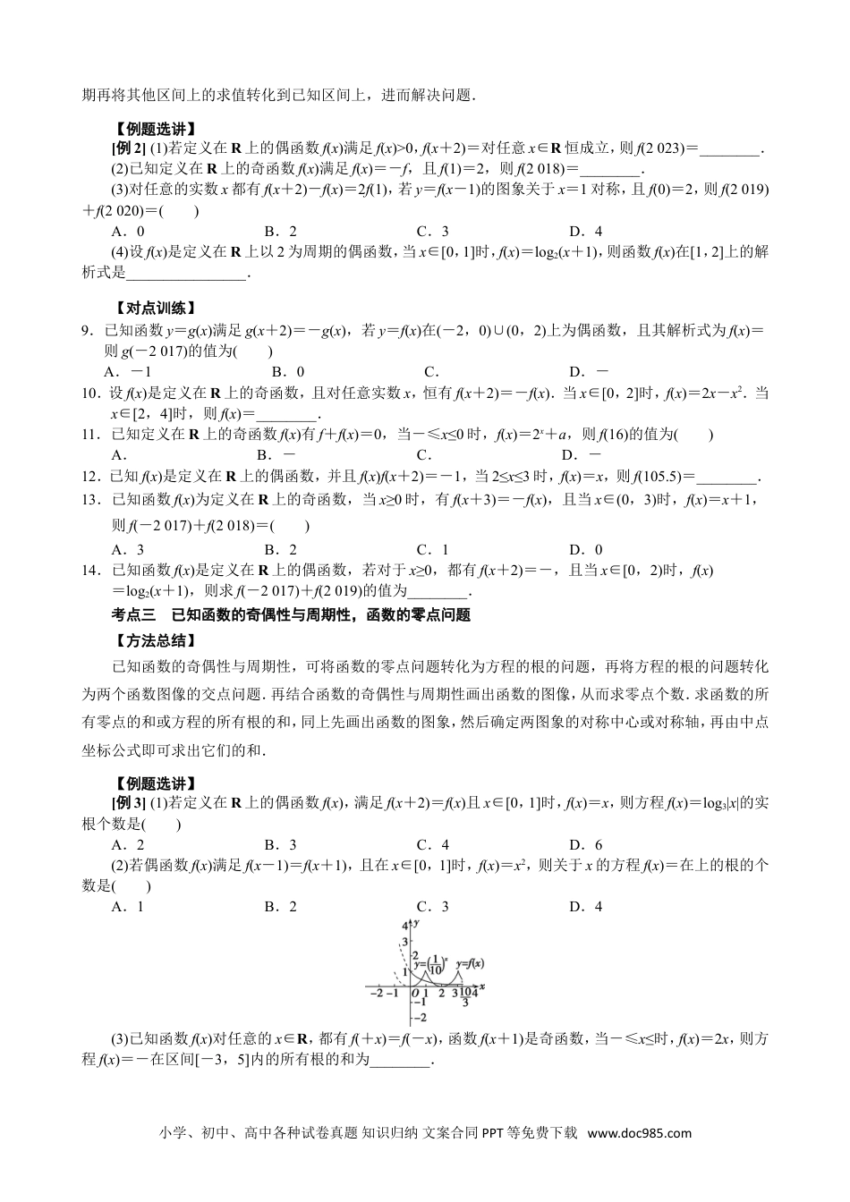 专题七函数奇偶性与周期性的综合问题周期性与奇偶性结合.此类问题多考查求值,把未知区间上的函数性质转化为已知区间上的函数性质求解.常利用奇偶性及周期性进行交换,即将所求函数值的自变量转化到已知解析式的函数定义域内求解.考点一已知函数的奇偶性与周期性,求函数值【方法总结】已知函数的奇偶性与周期性(显性),可利用奇偶性与周期性,将其他区间上的求值转化到已知区间上,进而解决问题.【例题选讲】[例1](1)设f(x)是周期为2的奇函数,当0≤x≤1时,f(x)=2x(1-x),则f=________.(2)已知f(x)是定义在R上周期为4的奇函数,当x∈(0,2]时,f(x)=2x+log2x,则f(2019)=()A.5B.C.2D.-2(3)设f(x)是定义在R上周期为4的奇函数,若在区间[-2,0)∪(0,2]上,f(x)=则f(2021)=________.(4)已知f(x)在R上是奇函数,且满足f(x+4)=f(x),当x∈(-2,0)时,f(x)=2x2,则f(2019)等于()A.-2B.2C.-98D.98(5)定义在R上的函数f(x)满足f(-x)=-f(x),f(x)=f(x+4),且当x∈(-1,0)时,f(x)=2x+,则f(log220)=()A.1B.C.-1D.-(6)(2017·山东)已知f(x)是定义在R上的偶函数,且f(x+4)=f(x-2).若当x∈[-3,0]时,f(x)=6-x,则f(919)=________.(7)(2016·四川)若函数f(x)是定义在R上的周期为2的奇函数,当0<x<1时,f(x)=4x,则+f(2)=__________.(8)若函数f(x)(x∈R)是周期为4的奇函数,且在[0,2]上的解析式为f(x)=则f+f=________.【对点训练】1.设f(x)是周期为4的奇函数,当0≤x≤1时,f(x)=x(1+x),则f=()A.-B.-C.D.2.已知函数f(x)是定义在R上的奇函数,其最小正周期为4,且当x∈时,f(x)=log2(-3x+1),则f(2021)等于()A.4B.2C.-2D.log273.已知f(x)是定义在R上以3为周期的偶函数,若f(1)<1,f(5)=2a-3,则实数a的取值范围为____.4.已知定义在R上的奇函数f(x)满足f(x+5)=f(x),且当x∈时,f(x)=x3-3x,则f(2018)=()A.2B.-18C.18D.-25.已知函数f(x)是定义在R上的奇函数,且对于任意x∈R,恒有f(x-1)=f(x+1)成立,当x∈[-1,0]时,f(x)=2x-1,则f(2019)=________.6.已知函数f(x)是定义在R上的周期为2的奇函数,当0<x<1时,f(x)=4x,则f+f(1)=________.7.已知定义在R上的函数f(x)是奇函数,且是以2为周期的周期函数,则f(1)+f(4)+f(7)=()A.-1B.0C.1D.48.设定义在R上的函数f(x)同时满足以下条件:①f(x)+f(-x)=0;②f(x)=f(x+2);③当0≤x<1时,f(x)=2x-1.则f+f(1)+f+f(2)+f=________.考点二已知函数的奇偶性,周期性(隐性),求函数值【方法总结】已知函数的奇偶性与周期性(隐性),可利用函数的奇偶性与周期性的性质结论1到结论9,先明确了周小学、初中、高中各种试卷真题知识归纳文案合同PPT等免费下载www.doc985.com期再将其他区间上的求值转化到已知区间上,进而解决问题.【例题选讲】[例2](1)若定义在R上的偶函数f(x)满足f(x)>0,f(x+2)=对任意x∈R恒成立,则f(2023)=________.(2)已知定义在R上的奇函数f(x)满足f(x)=-f,且f(1)=2,则f(2018)=________.(3)对任意的实数x都有f(x+2)-f(x)=2f(1),若y=f(x-1)的图象关于x=1对称,且f(0)=2,则f(2019)+f(2020)=()A.0B.2C.3D.4(4)设f(x)是定义在R上以2为周期的偶函数,当x∈[0,1]时,f(x)=log2(x+1),则函数f(x)在[1,2]上的解析式是________________.【对点训练】9.已知函数y=g(x)满足g(x+2)=-g(x),若y=f(x)在(-2,0)∪(0,2)上为偶函数,且其解析式为f(x)=则g(-2017)的值为()A.-1B.0C.D.-10.设f(x)是定义在R上的奇函数,且对任意实数x,恒有f(x+2)=-f(x).当x∈[0,2]时,f(x)=2x-x2.当x∈[2,4]时,则f(x)=________.11.已知定义在R上的奇函数f(x)有f+f(x)=0,当-≤x≤0时,f(x)=2x+a,则f(16)的值为()A.B.-C.D.-12.已知f(x)是定义在R上的偶函数,并且f(x)f(x+2)=-1,当2≤x≤3时,f(x)=x,则f(105.5)=________.13.已知函数f(x)为定义在R上的奇函数,当x≥0时,有f(x+3)=-f(x),且当x∈(0,3)时,f(x)=x+1,则f(-2017)+f(201...