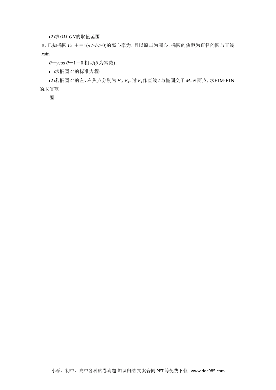 专题25面积与数量积型取值范围模型【例题选讲】[例1]已知椭圆C:+=1(a>b>0)与双曲线-y2=1的离心率互为倒数,且直线x-y-2=0经过椭圆的右顶点.(1)求椭圆C的标准方程;(2)设不过原点O的直线与椭圆C交于M,N两点,且直线OM,MN,ON的斜率依次成等比数列,求△OMN面积的取值范围.[例2](2018·浙江)如图,已知点P是y轴左侧(不含y轴)一点,抛物线C:y2=4x上存在不同的两点A,B满足PA,PB的中点均在C上.(1)设AB中点为M,证明:PM垂直于y轴;(2)若P是半椭圆x2+=1(x<0)上的动点,求△PAB面积的取值范围.[例3]已知A,B是x轴正半轴上两点(A在B的左侧),且|AB|=a(a>0),过A,B分别作x轴的垂线,与抛物线y2=2px(p>0)在第一象限分别交于D,C两点.(1)若a=p,点A与抛物线y2=2px的焦点重合,求直线CD的斜率;(2)若O为坐标原点,记△OCD的面积为S1,梯形ABCD的面积为S2,求的取值范围.[例4]如图,椭圆C:+=1(a>b>0)的右顶点为A(2,0),左、右焦点分别为F1,F2,过点A且斜率为的直线与y轴交于点P,与椭圆交于另一个点B,且点B在x轴上的射影恰好为点F1.(1)求椭圆C的标准方程;(2)过点P且斜率大于的直线与椭圆交于M,N两点(|PM|>|PN|),若S△PAM∶S△PBN=λ,求实数λ的取值范围.[例5](2016·全国乙)设圆x2+y2+2x-15=0的圆心为A,直线l过点B(1,0)且与x轴不重合,l交圆A于C,D两点,过B作AC的平行线交AD于点E.(1)证明|EA|+|EB|为定值,并写出点E的轨迹方程;(2)设点E的轨迹为曲线C1,直线l交C1于M,N两点,过B且与l垂直的直线与圆A交于P,Q两点,求四边形MPNQ面积的取值范围.[例6]已知圆心为H的圆x2+y2+2x-15=0和定点A(1,0),B是圆上任意一点,线段AB的中垂线l和直线BH相交于点M,当点B在圆上运动时,点M的轨迹记为曲线C.(1)求C的方程;(2)过点A作两条相互垂直的直线分别与曲线C相交于P,Q和E,F,求PE·QF的取值范围.[例7]已知椭圆C1:+=1(a>b>0)与抛物线C2:x2=2py(p>0)有一个公共焦点,抛物线C2的准线l与椭圆C1有一交点坐标是(,-2).(1)求椭圆C1与抛物线C2的方程;(2)若点P是直线l上的动点,过点P作抛物线的两条切线,切点分别为A,B,直线AB与椭圆C1分别交于点E,F,求OE·OF的取值范围.[例8]已知椭圆C:+=1(a>b>0)的左、右顶点分别为A,B,且长轴长为8,T为椭圆上任意一点,直线TA,TB的斜率之积为-.(1)求椭圆C的方程;(2)设O为坐标原点,过点M(0,2)的动直线与椭圆C交于P,Q两点,求OP·OQ+小学、初中、高中各种试卷真题知识归纳文案合同PPT等免费下载www.doc985.comMP·MQ的取值范围.【对点训练】1.已知抛物线C:y2=2px(p>0),点F为抛物线C的焦点,点A(1,m)(m>0)在抛物线C上,且|FA|=2,过点F作斜率为k的直线l与抛物线C交于P,Q两点.(1)求抛物线C的方程;(2)求△APQ面积的取值范围.2.已知中心在原点,焦点在y轴上的椭圆C,其上一点P到两个焦点F1,F2的距离之和为4,离心率为.(1)求椭圆C的方程;(2)若直线y=kx+1与曲线C交于A,B两点,求△OAB面积的取值范围.3.已知M(-1,0),F(1,0),|MR|=2,FR=2FQ,MP=λMR(λ∈R),且PQ·FR=0.(1)当R在该坐标平面上运动时,求点P运动的轨迹C的方程;(2)经过点H(2,0)作不过F点且斜率存在的直线l,若直线l与轨迹C相交于A,B两点.①探究:直线FA,FB的斜率之和是否为定值?若是,求出该定值;若不是,请说明理由;②求△FAB面积的取值范围.4.已知抛物线C:y2=4x的焦点为F,直线l:y=kx-4(1<k<2)与y轴、抛物线C相交于点P,A,B(自下而上),记△PAF,△PBF的面积分别为S1,S2.(1)求AB中点M到y轴的距离d的取值范围;(2)求的取值范围.5.在平面直角坐标系xOy中,圆x2+y2+2x-15=0的圆心为M.已知点N(1,0),且T为圆M上的动点,线段TN的垂直平分线交TM于点P.(1)求点P的轨迹方程;(2)设点P的轨迹为曲线C1,抛物线C2:y2=2px的焦点为N.l1,l2是过点N互相垂直的两条直线,直线l1与曲线C1交于A,C两点,直线l2与曲线C2交于B,D两点,求四边形ABCD面积的取值范围.6.已知点M在椭圆C:+=1(a>b>0)上,且点M到椭圆C的左、右焦点的距离之和为2.(1)求椭圆C的方程;(2)设O为...