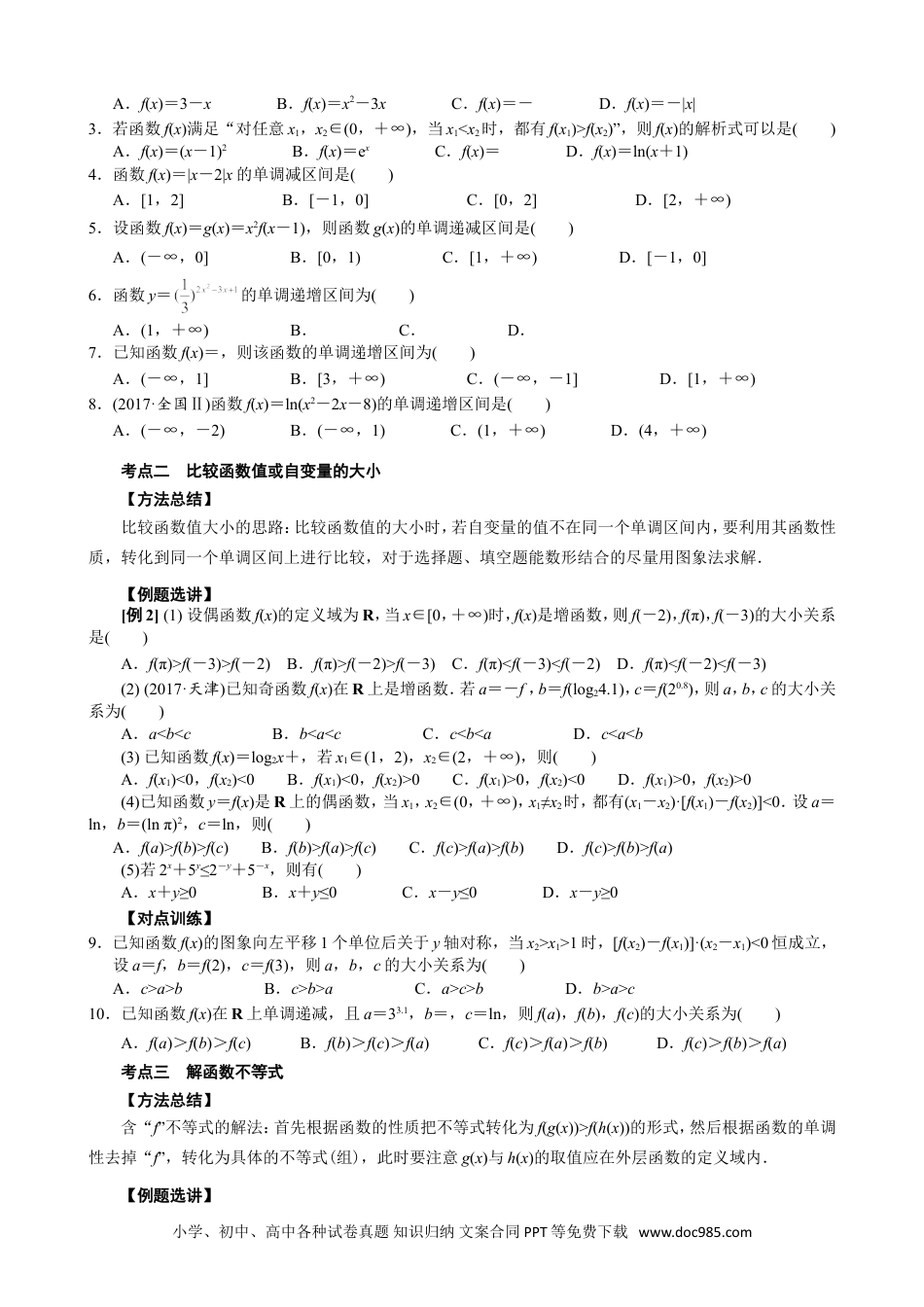 专题三函数的单调性1.增函数、减函数的定义增函数减函数定义一般地,设函数f(x)的定义域为I,如果对于定义域I内某个区间D上的任意两个自变量的值x1,x2当x1<x2时,都有f(x1)<f(x2),那么就说函数f(x)在区间D上是增函数当x1<x2时,都有f(x1)>f(x2),那么就说函数f(x)在区间D上是减函数图象描述自左向右看图象是上升的自左向右看图象是下降的2.单调性、单调区间的定义若函数y=f(x)在区间D上是增函数或减函数,则称函数y=f(x)在这一区间上具有(严格的)单调性,区间D叫做函数y=f(x)的单调区间.单调区间是定义域的子集,故求单调区间时应树立“定义域优先”的原则.单调区间只能用区间表示,不能用集合或不等式表示;如有多个单调区间应分开写,不能用并集符号“∪”连接,也不能用“或”连接,只能用“,”或“和”隔开.2.常用结论结论1:增函数与减函数形式的等价变形y=f(x)在区间D上是增函数⇔对∀x1<x2,都有f(x1)<f(x2)⇔(x1-x2)[f(x1)-f(x2)]>0⇔>0;y=f(x)在区间D上是减函数⇔对∀x1<x2,都有f(x1)>f(x2)⇔(x1-x2)[f(x1)-f(x2)]<0⇔<0.结论2:单调性的运算性质(1)函数y=f(x)与函数y=f(x)+C(C为常数)具有相同的单调性.(2)若k>0,则kf(x)与f(x)单调性相同;若k<0,则kf(x)与f(x)单调性相反.(3)在公共定义域内,函数y=f(x)(f(x)>0)与和具有相同的单调性.(4)在公共定义域内,函数y=f(x)(f(x)≠0)与y=单调性相反.(5)若f(x),g(x)均为区间A上的增(减)函数,则f(x)+g(x)也是区间A上的增(减)函数.(6)若f(x),g(x)均为区间A上的增(减)函数,且f(x)>0,g(x)>0,则f(x)•g(x)也是区间A上的增(减)函数.结论3:复合函数的单调性复合函数y=f[g(x)]的单调性与y=f(u)和u=g(x)的单调性有关.若两个简单函数的单调性相同,则它们的复合函数为增函数;若两个简单函数的单调性相反,则它们的复合函数为减函数.简记:“同增异减”.结论4:奇函数与偶函数的单调性奇函数在其关于原点对称的区间上单调性相同,偶函数在其关于原点对称的区间上单调性相反.结论5:对勾函数与飘带函数的单调性对勾函数:f(x)=ax+(ab>0)xya>0,b>0-babaOxya<0,b<0-babaO小学、初中、高中各种试卷真题知识归纳文案合同PPT等免费下载www.doc985.com(1)当a>0,b>0时,f(x)在(-∞,-],[,+∞)上是增函数,在[-,0),(0,]上是减函数;(2)当a<0,b<0时,f(x)在(-∞,-],[,+∞)上是减函数,在[-,0),(0,]上是增函数;飘带函数:f(x)=ax+(ab<0)xya>0,b<0--ba-baOxya<0,b>0--ba-baO(1)当a>0,b<0时,f(x)在(-∞,0),(0,+∞)上都是增函数;(2)当a<0,b>0时,f(x)在(-∞,0),(0,+∞)上都是减函数;考点一确定函数的单调性或单调区间【方法总结】确定函数的单调性或单调区间的常用方法(1)利用已知函数的单调性,即转化为已知函数的和、差或复合函数确定函数的单调性或单调区间.(2)定义法:先求定义域,再利用单调性的定义确定函数的单调性或单调区间.(3)图象法:如果f(x)是以图象形式给出的,或者f(x)的图象易作出,可由图象的直观性确定函数的单调性或单调区间.【例题选讲】[例1](1)下列函数中,在区间(0,+∞)内单调递减的是()A.y=-xB.y=x2-xC.y=lnx-xD.y=ex-x(2)下列函数中,满足“∀x1,x2∈(0,+∞)且x1≠x2,(x1-x2)·[f(x1)-f(x2)]<0”的是()A.f(x)=2xB.f(x)=|x-1|C.f(x)=-xD.f(x)=ln(x+1)(3)函数f(x)=|x2-3x+2|的单调递增区间是()A.B.和[2,+∞)C.(-∞,1]和D.和[2,+∞)(4)函数y=的单调递增区间为__________,单调递减区间为____________.(5)函数y=(x2-3x+2)的单调递增区间为__________,单调递减区间为____________.【对点训练】1.给定函数①y=x,②y=log(x+1),③y=|x-1|,④y=2x+1.其中在区间(0,1)上单调递减的函数序号是()A.①②B.②③C.③④D.①④2.下列四个函数中,在x∈(0,+∞)上为增函数的是()小学、初中、高中各种试卷真题知识归纳文案合同PPT等免费下载www.doc985.comA.f(x)=3-xB.f(x)=x2-3xC.f(x)=-D.f(x)=-|x|3.若函数f(x)满足“对任意...