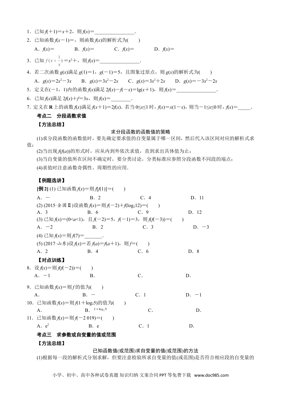 专题二函数的解析式与分段函数1.函数的表示方法函数的表示方法有三种,分别为解析法、列表法和图象法.同一个函数可以用不同的方法表示.2.应用三种方法表示函数的注意事项(1)解析法:一般情况下,必须注明函数的定义域;(2)列表法:选取的自变量要有代表性,应能反映定义域的特征;(3)图象法:注意定义域对图象的影响.与x轴垂直的直线与其最多有一个公共点.3.函数的三种表示方法的优缺点优点缺点解析法简明扼要,规范准确(1)有些函数关系很难或不能用解析式表示;(2)求x与y的对应关系时需逐个计算,比较繁杂列表法能鲜明地显示自变量与函数值之间的数量关系只能列出部分自变量及其对应的函数值,难以反映函数变化的全貌图象法形象直观,能清晰地呈现函数的增减变化、点的对称关系、最大(小)值等性质作出的图象是近似的、局部的,且根据图象确定的函数值往往有误差4.分段函数若函数在其定义域内,对于定义域内的不同取值区间,有着不同的对应关系,这样的函数通常叫做分段函数.5.分段函数的相关结论(1)分段函数虽由几个部分组成,但它表示的是一个函数.(2)分段函数的定义域等于各段函数的定义域的并集,值域等于各段函数的值域的并集.(3)各段函数的定义域不可以相交.考点一求函数的解析式【方法总结】函数解析式的常见求法(1)配凑法:已知f(h(x))=g(x),求f(x)的问题,往往把右边的g(x)整理或配凑成只含h(x)的式子,然后用x将h(x)代换.(2)换元法:已知f(h(x))=g(x),求f(x)时,往往可设h(x)=t,从中解出x,代入g(x)进行换元.应用换元法时要注意新元的取值范围.(3)待定系数法:已知函数的类型(如一次函数、二次函数)可用待定系数法,比如二次函数f(x)可设为f(x)=ax2+bx+c(a≠0),其中a,b,c是待定系数,根据题设条件,列出方程组,解出a,b,c即可.(4)解方程组法:已知f(x)满足某个等式,这个等式除f(x)是未知量外,还有其他未知量,如f(或f(-x))等,可根据已知等式再构造其他等式组成方程组,通过解方程组求出f(x).【例题选讲】[例1](1)已知=+,则f(x)=__________;(2)已知=lgx,则f(x)=__________;(3)已知f(x)是二次函数,且f(0)=2,f(x+1)=f(x)+x+3,则f(x)=__________;(4)已知函数f(x)满足f(-x)+2f(x)=2x,则f(x)=__________;(5)若函数f(x)满足方程af(x)+f=ax,x∈R,且x≠0,a为常数,a≠±1,且a≠0,则f(x)=________.【对点训练】小学、初中、高中各种试卷真题知识归纳文案合同PPT等免费下载www.doc985.com1.已知f(+1)=x+2,则f(x)=________________.2.已知函数f(x-1)=,则函数f(x)的解析式为()A.f(x)=B.f(x)=C.f(x)=D.f(x)=3.已知=x2+,则f(x)=________________.4.若二次函数g(x)满足g(1)=1,g(-1)=5,且图象过原点,则g(x)的解析式为()A.g(x)=2x2-3xB.g(x)=3x2-2xC.g(x)=3x2+2xD.g(x)=-3x2-2x5.定义在(-1,1)内的函数f(x)满足2f(x)-f(-x)=lg(x+1),则f(x)=________________.6.已知f(x)满足2f(x)+f=3x,则f(x)=________.7.定义在R上的函数f(x)满足f(x+1)=2f(x).若当0≤x≤1时,f(x)=x(1-x),则当-1≤x≤0时,f(x)=_____.考点二分段函数求值【方法总结】求分段函数的函数值的策略(1)求分段函数的函数值时,要先确定要求值的自变量属于哪一区间,然后代入该区间对应的解析式求值;(2)当出现f(f(a))的形式时,应从内到外依次求值,直到求出具体值为止;(3)当自变量的值所在区间不确定时,要分类讨论,分类标准应参照分段函数不同段的端点;(4)求值时注意函数奇偶性、周期性的应用.【例题选讲】[例2](1)已知函数f(x)=则f[f(1)]=()A.-B.2C.4D.11(2)(2015·全国Ⅱ)设函数f(x)=则f(-2)+f(log212)=()A.3B.6C.9D.12(3)已知f(x)=(0<a<1),且f(-2)=5,f(-1)=3,则f(f(-3))=()A.-2B.2C.3D.-3(4)已知f(x)=则f(7)=_______.(5)(2017·山东)设f(x)=若f(a)=f(a+1),则f=()A.2B.4C.6D.8【对点训练】8.设f(x)=则f(f(-2))=()A.-1B.C.D.9.已知函数f(x)=则f的值为()A.B.-C.1D.-110.已知函数f(x)=则f(1+log25)的值为()A...
