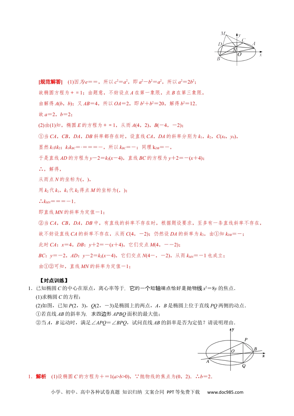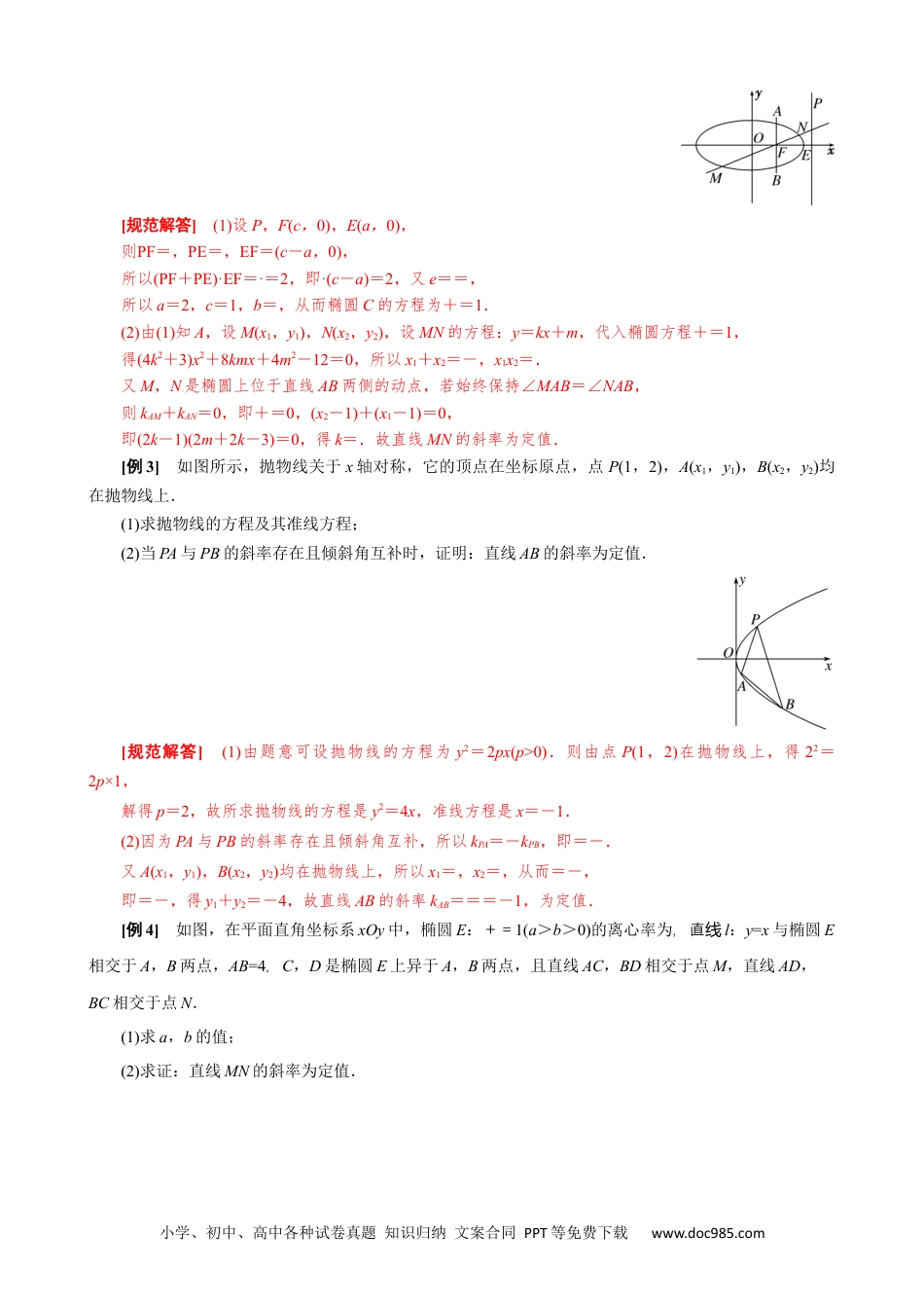 小学、初中、高中各种试卷真题知识归纳文案合同PPT等免费下载www.doc985.com专题18斜率型定值型问题定值问题——巧妙消参定就是明一量其中的化因素无,些化的因素可能是直的斜率、截距,也可值问题证个与变关这变线能是点的坐等,的一般解法是使用化的量表求目,通算求目的取动标这类问题变达证标过运证标值与变化的量无.使用直的斜率和截距表直方程,在解程中要注意建立斜率和截距之的关当线达线时题过间关系,把化解.双参数问题为单参数问题决题型一斜率问题【例题选讲】[例1]已知椭圆C:+=1(a>b>0)的离心率为,且点过A(2,1).(1)求椭圆C的方程;(2)若P,Q是椭圆C上的两个动点,且使∠PAQ的角平分线总垂直于x轴,试判断直线PQ的斜率是否为定值?若是,求出该值;若不是,说明理由.[规范解答](1)因为椭圆C的离心率为,且过点A(2,1),所以+=1,=.因为a2=c2+b2,解得b2=2,a2=8所以椭圆C的方程为+=1.(2)因为∠PAQ的角平分线总垂直于x轴,所以PA与AQ所在直线关于直线x=2对称.设直线PA的斜率为k,则直线AQ的斜率为-k.所以直线PA的方程为y-1=k(x-2),直线AQ的方程为y-1=-k(x-2).设点P(x1,y1),Q(x2,y2),由消去y得(1+4k2)x2-8(2k2-k)x+16k2-16k-4=0,①因为点A(2,1)在椭圆C上,所以x=2是方程①的一个根,2x1=,即x1=.同理x2=.所以x1-x2=-.又y1-y2=k(x1+x2)-4k=k·-4k=-,所以直线PQ的斜率为kPQ==.所以直线PQ的斜率为定值,该值为.[例2]已知椭圆C:+=1(a>b>0)的离心率为,右焦点为F,右顶点为E,P为直线x=a上的任意一点,且(PF+PE)·EF=2.(1)求椭圆C的方程;(2)过F且垂直于x轴的直线AB与椭圆交于A,B两点(点A在第一象限),动直线l与椭圆C交于M,N两点,且M,N位于直线AB的两侧,若始终保持∠MAB=∠NAB,求证:直线MN的斜率为定值.小学、初中、高中各种试卷真题知识归纳文案合同PPT等免费下载www.doc985.com[规范解答](1)设P,F(c,0),E(a,0),则PF=,PE=,EF=(c-a,0),所以(PF+PE)·EF=·=2,即·(c-a)=2,又e==,所以a=2,c=1,b=,从而椭圆C的方程为+=1.(2)由(1)知A,设M(x1,y1),N(x2,y2),设MN的方程:y=kx+m,代入椭圆方程+=1,得(4k2+3)x2+8kmx+4m2-12=0,所以x1+x2=-,x1x2=.又M,N是椭圆上位于直线AB两侧的动点,若始终保持∠MAB=∠NAB,则kAM+kAN=0,即+=0,(x2-1)+(x1-1)=0,即(2k-1)(2m+2k-3)=0,得k=.故直线MN的斜率为定值.[例3]如图所示,抛物线关于x轴对称,它的顶点在坐标原点,点P(1,2),A(x1,y1),B(x2,y2)均在抛物线上.(1)求抛物线的方程及其准线方程;(2)当PA与PB的斜率存在且倾斜角互补时,证明:直线AB的斜率为定值.[规范解答](1)由题意可设抛物线的方程为y2=2px(p>0).则由点P(1,2)在抛物线上,得22=2p×1,解得p=2,故所求抛物线的方程是y2=4x,准线方程是x=-1.(2)因为PA与PB的斜率存在且倾斜角互补,所以kPA=-kPB,即=-.又A(x1,y1),B(x2,y2)均在抛物线上,所以x1=,x2=,从而=-,即=-,得y1+y2=-4,故直线AB的斜率kAB===-1,为定值.[例4]如图,在平面直角坐标系xOy中,椭圆E:+=1(a>b>0)的离心率为,直线l:y=x与椭圆E相交于A,B两点,AB=4,C,D是椭圆E上异于A,B两点,且直线AC,BD相交于点M,直线AD,BC相交于点N.(1)求a,b的值;(2)求证:直线MN的斜率为定值.小学、初中、高中各种试卷真题知识归纳文案合同PPT等免费下载www.doc985.com[规范解答](1)因为e==,所以c2=a2,即a2-b2=a2,所以a2=2b2;故椭圆方程为+=1;由题意,不妨设点A在第一象限,点B在第三象限,由解得A(b,b);又AB=4,所以OA=2,即b2+b2=20,解得b2=12.故a=2,b=2;(2)由(1)知,椭圆E的方程为+=1,从而A(4,2),B(-4,-2);①当CA,CB,DA,DB斜率都存在时,设直线CA,DA的斜率分别为k1,k2,C(x0,y0),显然k1≠k2;k1kBC=·===-,所以kBC=-;同理kDB=-,于是直线AD的方程为y-2=k2(x-4),直线BC的方程为y+2=-(x+4);∴,解得,从而点N的坐标为(,),用k2代k1,k1代k2得点...