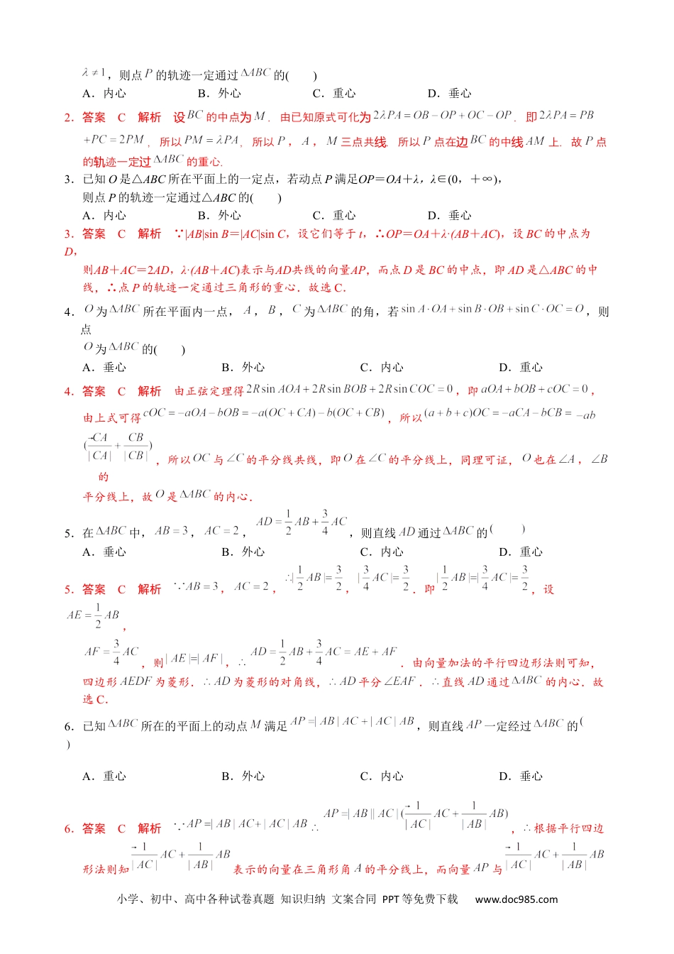 小学、初中、高中各种试卷真题知识归纳文案合同PPT等免费下载www.doc985.com专题十平面向量与三角形的四心三角形四心的向量式三角形“四心”向量形式的充要条件设O为△ABC所在平面上一点,内角A,B,C所对的边分别为a,b,c,则(1)O为△ABC的重心⇔OA+OB+OC=0.(2)O为△ABC的外心⇔|OA|=|OB|=|OC|=⇔sin2A·OA+sin2B·OB+sin2C·OC=0.(3)O为△ABC的内心⇔aOA+bOB+cOC=0⇔sinA·OA+sinB·OB+sinC·OC=0.(4)O为△ABC的垂心⇔OA·OB=OB·OC=OC·OA⇔tanA·OA+tanB·OB+tanC·OC=0.关于四心的概念及性质:(1)重心:三角形的重心是三角形三条中线的交点.性质:①重心到顶点的距离与重心到对边中点的距离之比为2∶1.②重心和三角形3个顶点组成的3个三角形面积相等.③在平面直角坐标系中,重心的坐标是顶点坐标的算术平均数.即G为△ABC的重心,A(x1,y1),B(x2,y2),C(x3,y3),则G.④重心到三角形3个顶点距离的平方和最小.(2)垂心:三角形的垂心是三角形三边上的高的交点.性质:锐角三角形的垂心在三角形内,直角三角形的垂心在直角顶点上,钝角三角形的垂心在三角形外.(3)内心:三角形的内心是三角形三条内角平分线的交点(或内切圆的圆心).性质:①三角形的内心到三边的距离相等,都等于内切圆半径r.②,特别地,在Rt△ABC中,∠C=90°,.(4)外心:三角形三边的垂直平分线的交点(或三角形外接圆的圆心).性质:外心到三角形各顶点的距离相等.考点一三角形四心的判断【例题选讲】[例1](1)已知A,B,C是平面上不共线的三点,O为坐标原点,动点P满足OP=[(1-λ)OA+(1-λ)OB+(1+2λ)·OC],λ∈R,则点P的轨迹一定经过()A.△ABC的内心B.△ABC的垂心C.△ABC的重心D.AB边的中点答案C解析取AB的中点D,则2OD=OA+OB, OP=[(1-λ)OA+(1-λ)OB+(1+2λ)OC],∴OP=[2(1-λ)OD+(1+2λ)OC]=OD+OC,而+=1,∴P,C,D三点共,线∴点P的迹一定轨经过△ABC的重心.(2)已知O是平面上的一定点,A,B,C是平面上不共线的三个动点,若动点P满足OP=OA+λ,λ∈(0,+∞),则点P的轨迹一定通过△ABC的________.答案心内解析由件,得条OP-OA=λ,即AP=λ,而和分表示平行于别AB,AC的位向量,单故+平分∠BAC,即AP平分∠BAC,所以点P的迹必轨过△ABC的心.内(3)在△ABC中,设AC2-AB2=2AM·BC,那么动点M的轨迹必经过△ABC的()A.垂心B.内心C.外心D.重心答案C解析设BC中点边为D, AC2-AB2=2AM·BC,∴(AC+AB)·(AC-AB)=2小学、初中、高中各种试卷真题知识归纳文案合同PPT等免费下载www.doc985.comAM·BC,即AD·BC=AM·BC,∴MD·BC=0,则MD⊥BC,即MD⊥BC,∴MD为BC的垂直平分,线∴点动M的迹必轨经过△ABC的外心,故选C.(4)已知O是平面上的一个定点,A,B,C是平面上不共线的三个点,动点P满足OP=OA+λ(+),λ∈(0,+∞),则动点P的轨迹一定通过△ABC的()A.重心B.垂心C.外心D.内心答案B解析因为OP=OA+λ(+),所以AP=OP-OA=λ(+),所以BC·AP=BC·λ(+)=λ(-|BC|+|BC|)=0,所以BC⊥AP,所以点P在BC的高上,即点线动P的迹一定通轨过△ABC的垂心.(5)已知的内角、、的对边分别为、、,为内一点,若分别满足下列四个条件:①,②,③,④则点分别为的A.外心、内心、垂心、重心B.内心、外心、垂心、重心C.垂心、内心、重心、外心D.内心、垂心、外心、重心答案D(6)下列叙述正确的是________.①为的重心.②为的垂心.③为的外心.④为的内心.答案①②解析①为的重心,①正确;②由,同理,,②正确;③.,角与的平分平行,线必然落在角的角平分上,线③;错误④为的外心,④.错误正确的述是叙①②.故答案:为①②.【对点训练】1.已知O是平面上的一定点,A,B,C是平面上不共线的三个动点,若动点P满足OP=OA+λ(AB+AC),λ∈(0,+∞),则点P的轨迹一定通过△ABC的()A.内心B.外心C.重心D.垂心1.答案C解析由原等式,得OP-OA=λ(AB+AC),即AP=λ(AB+AC),根据平行四形法,知边则AB+AC是△ABC的中线AD(D为BC的中点)所向量对应AD的2倍,所以点P的迹必轨过△ABC的重心.2.是平面上一定...