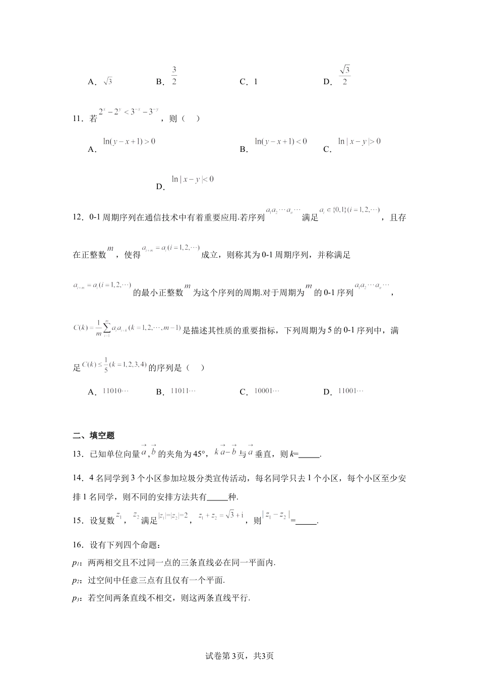 试卷第1页,共3页2020年全国统一高考数学试卷(理科)(新课标Ⅱ)学校:___________姓名:___________班级:___________考号:___________一、单选题1.已知集合U={−2,−1,0,1,2,3},A={−1,0,1},B={1,2},则()A.{−2,3}B.{−2,2,3}C.{−2,−1,0,3}D.{−2,−1,0,2,3}2.若α为第四象限角,则()A.cos2α>0B.cos2α<0C.sin2α>0D.sin2α<03.在新冠肺炎疫情防控期间,某超市开通网上销售业务,每天能完成1200份订单的配货,由于订单量大幅增加,导致订单积压.为解决困难,许多志愿者踊跃报名参加配货工作.已知该超市某日积压500份订单未配货,预计第二天的新订单超过1600份的概率为0.05,志愿者每人每天能完成50份订单的配货,为使第二天完成积压订单及当日订单的配货的概率不小于0.95,则至少需要志愿者()A.10名B.18名C.24名D.32名4.北京天坛的圜丘坛为古代祭天的场所,分上、中、下三层,上层中心有一块圆形石板(称为天心石),环绕天心石砌9块扇面形石板构成第一环,向外每环依次增加9块,下一层的第一环比上一层的最后一环多9块,向外每环依次也增加9块,已知每层环数相同,且下层比中层多729块,则三层共有扇面形石板(不含天心石)()A.3699块B.3474块C.3402块D.3339块试卷第2页,共3页5.若过点(2,1)的圆与两坐标轴都相切,则圆心到直线的距离为()A.B.C.D.6.数列中,,对任意,若,则()A.2B.3C.4D.57.如图是一个多面体的三视图,这个多面体某条棱的一个端点在正视图中对应的点为,在俯视图中对应的点为,则该端点在侧视图中对应的点为()A.B.C.D.8.设为坐标原点,直线与双曲线的两条渐近线分别交于两点,若的面积为8,则的焦距的最小值为()A.4B.8C.16D.329.设函数,则f(x)()A.是偶函数,且在单调递增B.是奇函数,且在单调递减C.是偶函数,且在单调递增D.是奇函数,且在单调递减10.已知△ABC是面积为的等边三角形,且其顶点都在球O的球面上.若球O的表面积为16π,则O到平面ABC的距离为()试卷第3页,共3页A.B.C.1D.11.若,则()A.B.C.D.12.0-1周期序列在通信技术中有着重要应用.若序列满足,且存在正整数,使得成立,则称其为0-1周期序列,并称满足的最小正整数为这个序列的周期.对于周期为的0-1序列,是描述其性质的重要指标,下列周期为5的0-1序列中,满足的序列是()A.B.C.D.二、填空题13.已知单位向量,的夹角为45°,与垂直,则k=.14.4名同学到3个小区参加垃圾分类宣传活动,每名同学只去1个小区,每个小区至少安排1名同学,则不同的安排方法共有种.15.设复数,满足,,则=.16.设有下列四个命题:p1:两两相交且不过同一点的三条直线必在同一平面内.p2:过空间中任意三点有且仅有一个平面.p3:若空间两条直线不相交,则这两条直线平行.试卷第4页,共3页p4:若直线l平面α,直线m⊥平面α,则m⊥l.则下述命题中所有真命题的序号是.①②③④三、解答题17.中,sin2A-sin2B-sin2C=sinBsinC.(1)求A;(2)若BC=3,求周长的最大值.18.某沙漠地区经过治理,生态系统得到很大改善,野生动物数量有所增加.为调查该地区某种野生动物的数量,将其分成面积相近的200个地块,从这些地块中用简单随机抽样的方法抽取20个作为样区,调查得到样本数据(xi,yi)(i=1,2,…,20),其中xi和yi分别表示第i个样区的植物覆盖面积(单位:公顷)和这种野生动物的数量,并计算得,,,,.(1)求该地区这种野生动物数量的估计值(这种野生动物数量的估计值等于样区这种野生动物数量的平均数乘以地块数);(2)求样本(xi,yi)(i=1,2,…,20)的相关系数(精确到0.01);(3)根据现有统计资料,各地块间植物覆盖面积差异很大.为提高样本的代表性以获得该地区这种野生动物数量更准确的估计,请给出一种你认为更合理的抽样方法,并说明理由.附:相关系数r=,≈1.414.19.已知椭圆C1:(a>b>0)的右焦点F与抛物线C2的焦点重合,C1的中心与C2试卷第5页,共3页的顶点重合.过F且与x轴垂直的直线交C1于A,B两点,交C2于C,D两点,且|CD|=|AB|.(1)求C1的离心率;(2)设M是C1与C2的公共点,若|MF...