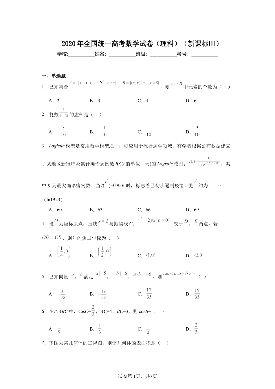 试卷第1页,共3页2020年全国统一高考数学试卷(理科)(新课标Ⅲ)学校:___________姓名:___________班级:___________考号:___________一、单选题1.已知集合,,则中元素的个数为()A.2B.3C.4D.62.复数的虚部是()A.B.C.D.3.Logistic模型是常用数学模型之一,可应用于流行病学领域.有学者根据公布数据建立了某地区新冠肺炎累计确诊病例数I(t)(t的单位:天)的Logistic模型:,其中K为最大确诊病例数.当I()=0.95K时,标志着已初步遏制疫情,则约为()(ln19≈3)A.60B.63C.66D.694.设为坐标原点,直线与抛物线C:交于,两点,若,则的焦点坐标为()A.B.C.D.5.已知向量,满足,,,则()A.B.C.D.6.在△ABC中,cosC=,AC=4,BC=3,则cosB=()A.B.C.D.7.下图为某几何体的三视图,则该几何体的表面积是()试卷第2页,共3页A.6+4B.4+4C.6+2D.4+28.已知2tanθ–tan(θ+)=7,则tanθ=()A.–2B.–1C.1D.29.若直线l与曲线y=和x2+y2=都相切,则l的方程为()A.y=2x+1B.y=2x+C.y=x+1D.y=x+10.设双曲线C:(a>0,b>0)的左、右焦点分别为F1,F2,离心率为.P是C上一点,且F1P⊥F2P.若△PF1F2的面积为4,则a=()A.1B.2C.4D.811.已知55<84,134<85.设a=log53,b=log85,c=log138,则()A.a<b<cB.b<a<cC.b<c<aD.c<a<b二、填空题12.若x,y满足约束条件,则z=3x+2y的最大值为.13.的展开式中常数项是(用数字作答).14.已知圆锥的底面半径为1,母线长为3,则该圆锥内半径最大的球的体积为.15.关于函数f(x)=有如下四个命题:试卷第3页,共3页①f(x)的图象关于y轴对称.②f(x)的图象关于原点对称.③f(x)的图象关于直线x=对称.④f(x)的最小值为2.其中所有真命题的序号是.三、解答题16.设数列{an}满足a1=3,.(1)计算a2,a3,猜想{an}的通项公式并加以证明;(2)求数列{2nan}的前n项和Sn.17.某学生兴趣小组随机调查了某市100天中每天的空气质量等级和当天到某公园锻炼的人次,整理数据得到下表(单位:天):锻炼人次空气质量等级[0,200](200,400](400,600]1(优)216252(良)510123(轻度污染)6784(中度污染)720(1)分别估计该市一天的空气质量等级为1,2,3,4的概率;(2)求一天中到该公园锻炼的平均人次的估计值(同一组中的数据用该组区间的中点值为代表);(3)若某天的空气质量等级为1或2,则称这天“空气质量好”;若某天的空气质量等级为3或4,则称这天“空气质量不好”.根据所给数据,完成下面的2×2列联表,并根据列联表,判断是否有95%的把握认为一天中到该公园锻炼的人次与该市当天的空气质量有关?人次≤400人次>400试卷第4页,共3页空气质量好空气质量不好附:,P(K2≥k)0.0500.0100.001k3.8416.63510.82818.如图,在长方体中,点分别在棱上,且,.(1)证明:点在平面内;(2)若,,,求二面角的正弦值.19.已知椭圆的离心率为,,分别为的左、右顶点.(1)求的方程;(2)若点在上,点在直线上,且,,求的面积.20.设函数,曲线在点(,f())处的切线与y轴垂直.(1)求b.(2)若有一个绝对值不大于1的零点,证明:所有零点的绝对值都不大于1.试卷第5页,共3页21.在直角坐标系xOy中,曲线C的参数方程为(t为参数且t≠1),C与坐标轴交于A,B两点.(1)求||:(2)以坐标原点为极点,x轴正半轴为极轴建立极坐标系,求直线AB的极坐标方程.22.设a,b,cR,a+b+c=0,abc=1.(1)证明:ab+bc+ca<0;(2)用max{a,b,c}表示a,b,c中的最大值,证明:max{a,b,c}≥.答案第1页,共2页《2020年全国统一高考数学试卷(理科)(新课标Ⅲ)》参考答案题号12345678910答案CDCBDACDDA题号11答案A1.C【分析】采用列举法列举出中元素的即可.【详解】由题意,中的元素满足,且,由,得,所以满足的有,故中元素的个数为4.故选:C.【点晴】本题主要考查集合的交集运算,考查学生对交集定义的理解,是一道容易题.2.D【分析】利用复数的除法运算求出z即可.【详解】因为,所以复数的虚部为.故选:D.【点晴】本题主要考查复数的除法运算,涉及到复数的虚部的定义,是一道基础题....