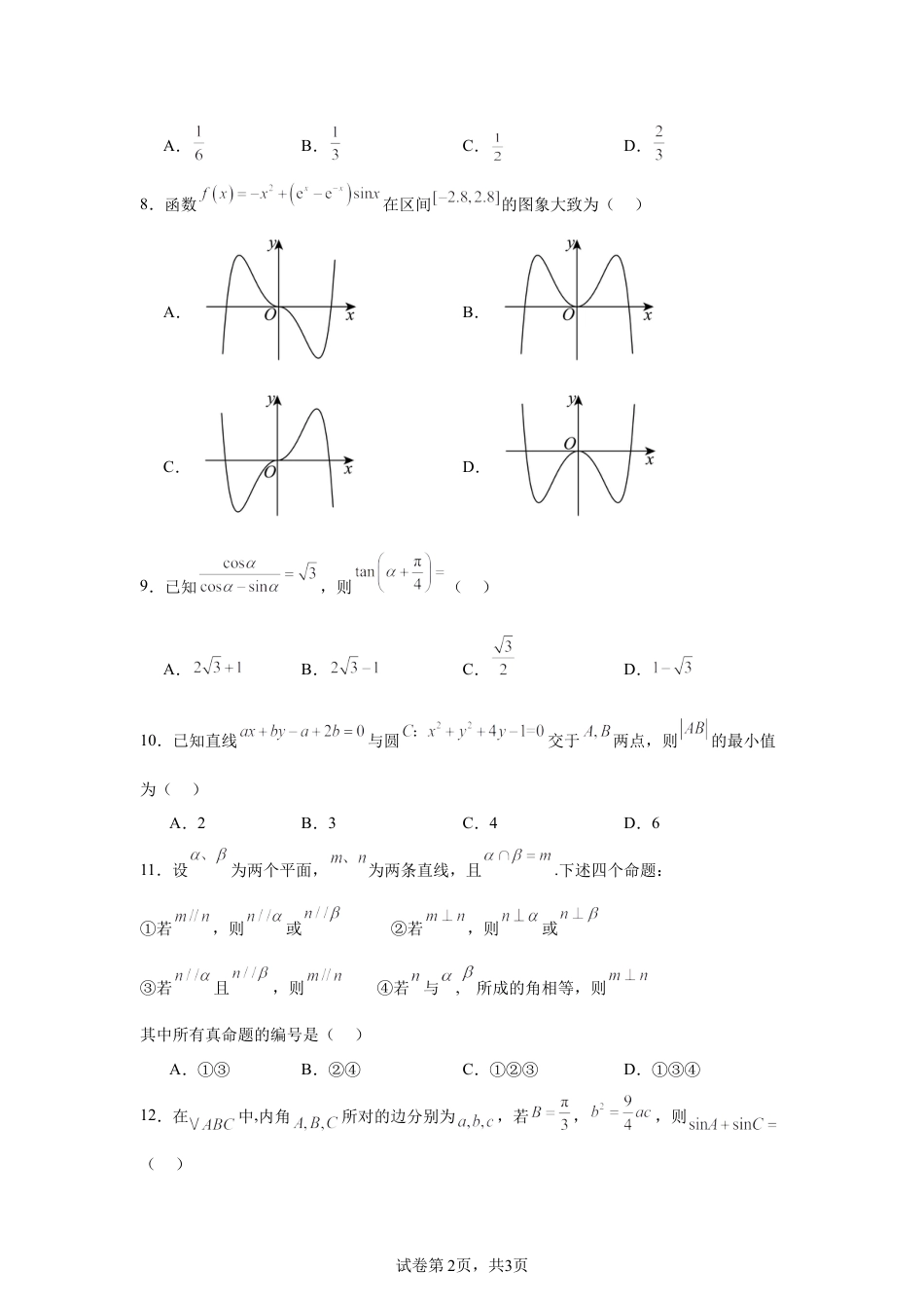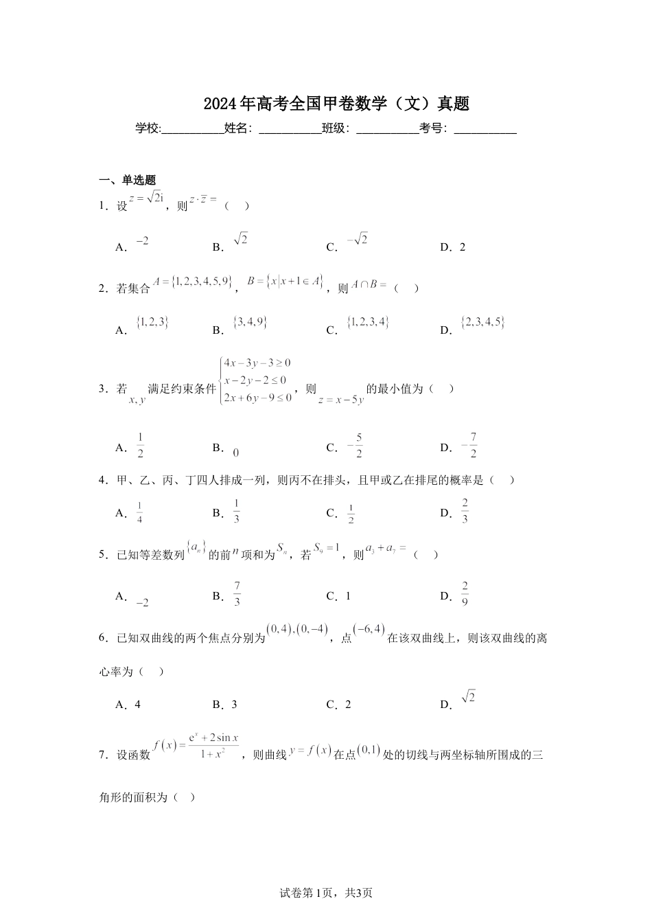 试卷第1页,共3页2024年高考全国甲卷数学(文)真题学校:___________姓名:___________班级:___________考号:___________一、单选题1.设,则()A.B.C.D.22.若集合,,则()A.B.C.D.3.若满足约束条件,则的最小值为()A.B.C.D.4.甲、乙、丙、丁四人排成一列,则丙不在排头,且甲或乙在排尾的概率是()A.B.C.D.5.已知等差数列的前项和为,若,则()A.B.C.1D.6.已知双曲线的两个焦点分别为,点在该双曲线上,则该双曲线的离心率为()A.4B.3C.2D.7.设函数,则曲线在点处的切线与两坐标轴所围成的三角形的面积为()试卷第2页,共3页A.B.C.D.8.函数在区间的图象大致为()A.B.C.D.9.已知,则()A.B.C.D.10.已知直线与圆交于两点,则的最小值为()A.2B.3C.4D.611.设为两个平面,为两条直线,且.下述四个命题:①若,则或②若,则或③若且,则④若与,所成的角相等,则其中所有真命题的编号是()A.①③B.②④C.①②③D.①③④12.在中,内角所对的边分别为,若,,则()试卷第3页,共3页A.B.C.D.二、填空题13.函数在上的最大值是.14.已知圆台甲、乙的上底面半径均为,下底面半径均为,圆台的母线长分别为,,则圆台甲与乙的体积之比为.15.已知且,则.16.曲线与在上有两个不同的交点,则的取值范围为.三、解答题17.已知等比数列的前项和为,且.(1)求的通项公式;(2)求数列的前n项和.18.某工厂进行生产线智能化升级改造,升级改造后,从该工厂甲、乙两个车间的产品中随机抽取150件进行检验,数据如下:优级品合格品不合格品总计甲车间2624050乙车70282100试卷第4页,共3页间总计96522150(1)填写如下列联表:优级品非优级品甲车间乙车间能否有的把握认为甲、乙两车间产品的优级品率存在差异?能否有的把握认为甲,乙两车间产品的优级品率存在差异?(2)已知升级改造前该工厂产品的优级品率,设为升级改造后抽取的n件产品的优级品率.如果,则认为该工厂产品的优级品率提高了,根据抽取的150件产品的数据,能否认为生产线智能化升级改造后,该工厂产品的优级品率提高了?()附:0.0500.0100.001k3.8416.63510.82819.如图,,,,试卷第5页,共3页,为的中点.(1)证明:平面;(2)求点到的距离.20.已知函数.(1)求的单调区间;(2)当时,证明:当时,恒成立.21.已知椭圆的右焦点为,点在上,且轴.(1)求的方程;(2)过点的直线交于两点,为线段的中点,直线交直线于点,证明:轴.22.在直角坐标系中,以坐标原点为极点,轴正半轴为极轴建立极坐标系,曲线的极坐标方程为.(1)写出的直角坐标方程;(2)设直线l:(为参数),若与l相交于两点,若,求.23.已知实数满足.试卷第6页,共3页(1)证明:;(2)证明:.答案第1页,共2页《2024年高考全国甲卷数学(文)真题》参考答案题号12345678910答案DCDBDCABBC题号1112答案AC1.D【分析】先根据共轭复数的定义写出,然后根据复数的乘法计算.【详解】依题意得,,故.故选:D2.C【分析】根据集合的定义先算出具体含有的元素,然后根据交集的定义计算.【详解】依题意得,对于集合中的元素,满足,则可能的取值为,即,于是.故选:C3.D【分析】画出可行域后,利用的几何意义计算即可得.【详解】实数满足,作出可行域如图:由可得,即的几何意义为的截距的,则该直线截距取最大值时,有最小值,答案第2页,共2页此时直线过点,联立,解得,即,则.故选:D.4.B【分析】解法一:画出树状图,结合古典概型概率公式即可求解.解法二:分类讨论甲乙的位置,结合得到符合条件的情况,然后根据古典概型计算公式进行求解.【详解】解法一:画出树状图,如图,由树状图可得,甲、乙、丙、丁四人排成一列,共有24种排法,其中丙不在排头,且甲或乙在排尾的排法共有8种,故所求概率.解法二:当甲排在排尾,乙排第一位,丙有种排法,丁就种,共种;当甲排在排尾,乙排第二位或第三位,丙有种排法,丁就种,共种;于是甲排在排尾共种方法,同理乙排在排尾共种方法,于是共种排法符合题意;基本事件总数显然是,答案第3页,共2页根据古典概型的计算公式,丙不在排头,甲或乙在排尾的概率为...