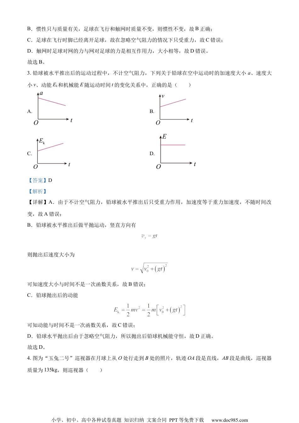 小学、初中、高中各种试卷真题知识归纳文案合同PPT等免费下载www.doc985.com绝密★启用前2023年6月浙江省普通高校招生选考科目考试物理考生注意:1.答题前,请务必将自己的姓名,准考证号用黑色字迹的签字笔或钢笔分别填写在试题卷和答题纸规定的位置上。2.答题时,请按照答题纸上“注意事项”的要求,在答题纸相应的位置上规范作答,在本试题卷上的作答一律无效。3.非选择题的答案必须使用黑色字迹的签字笔或钢笔写在答题纸上相应区域内,作图时可先使用2B铅笔,确定后必须使用黑色字迹的签字笔或钢笔描黑。4.可能用到的相关参数:重力加速度g取10m/s2。选择题部分一、选择题Ⅰ(本题共13小题,每小题3分,共39分。每小题列出的四个备选项中只有一个是符合题目要求的,不选、多选、错选均不得分)1.下列四组物理量中均为标量的是()A.电势电场强度B.热量功率C.动量动能D.速度加速度【答案】B【解析】【详解】A.电势只有大小没有方向,是标量;电场强度既有大小又有方向,是矢量,故A错误;B.热量和功率都是只有大小没有方向,都是标量,故B正确;C.动量既有大小又有方向,是矢量;动能只有大小没有方向,是标量,故C错误;D.速度和加速度都是既有大小又有方向的物理量,是矢量,故D错误。故选B。2.在足球运动中,足球入网如图所示,则()A.踢香蕉球时足球可视为质点B.足球在飞行和触网时惯性不变C.足球在飞行时受到脚的作用力和重力D.触网时足球对网的力大于网对足球的力【答案】B【解析】【详解】A.在研究如何踢出“香蕉球”时,需要考虑踢在足球上的位置与角度,所以不可以把足球看作质点,故A错误;小学、初中、高中各种试卷真题知识归纳文案合同PPT等免费下载www.doc985.comB.惯性只与质量有关,足球在飞行和触网时质量不变,则惯性不变,故B正确;C.足球在飞行时脚已经离开足球,故在忽略空气阻力的情况下只受重力,故C错误;D.触网时足球对网的力与网对足球的力是相互作用力,大小相等,故D错误。故选B。3.铅球被水平推出后的运动过程中,不计空气阻力,下列关于铅球在空中运动时的加速度大小a、速度大小v、动能Ek和机械能E随运动时间t的变化关系中,正确的是()A.B.C.D.【答案】D【解析】【详解】A.由于不计空气阻力,铅球被水平推出后只受重力作用,加速度等于重力加速度,不随时间改变,故A错误;B.铅球被水平推出后做平抛运动,竖直方向有则抛出后速度大小为可知速度大小与时间不是一次函数关系,故B错误;C.铅球抛出后的动能可知动能与时间不是一次函数关系,故C错误;D.铅球水平抛出后由于忽略空气阻力,所以抛出后铅球机械能守恒,故D正确。故选D。4.图为“玉兔二号”巡视器在月球上从O处行走到B处的照片,轨迹OA段是直线,AB段是曲线,巡视器质量为135kg,则巡视器()小学、初中、高中各种试卷真题知识归纳文案合同PPT等免费下载www.doc985.comA.受到月球的引力为1350NB.在AB段运动时一定有加速度C.OA段与AB段的平均速度方向相同D.从O到B的位移大小等于OAB轨迹长度【答案】B【解析】【详解】A.在月球上的g与地球不同,故质量为135kg的巡视器受到月球的引力不是1350N,故A错误;B.由于在AB段运动时做曲线运动,速度方向一定改变,一定有加速度,故B正确;C.平均速度的方向与位移方向相同,由图可知OA段与AB段位移方向不同,故平均速度方向不相同,故C错误;D.根据位移的定义可知从O到B的位移大小等于OB的连线长度,故D错误。故选B。5.“玉兔二号”装有核电池,不惧漫长寒冷的月夜。核电池将衰变释放的核能一部分转换成电能。的衰变方程为,则()A.衰变方程中的X等于233B.的穿透能力比γ射线强C.比的比结合能小D.月夜的寒冷导致的半衰期变大【答案】C【解析】【详解】A.根据质量数和电荷数守恒可知,衰变方程为即衰变方程中的X=234,故A错误;B.是α粒子,穿透能力比γ射线弱,故B错误;C.比结合能越大越稳定,由于衰变成为了,故比稳定,即比的比结合能小,故C正确;小学、初中、高中各种试卷真题知识归纳文案合同PPT等免费下载www.doc985.comD.半衰期由原子核本身决定的,与温度等外部因素无关,故D错误。故选C。6.如图所示,水平面上...