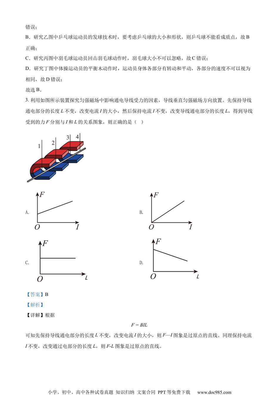 小学、初中、高中各种试卷真题知识归纳文案合同PPT等免费下载www.doc985.com2022年1月浙江省普通高校招生选考科目考试物理试题选择题部分一、选择题Ⅰ(本题共13小题,每小题3分,共39分。每小题列出的四个备选项中只有一个是符合题目要求的,不选、多选、错选均不得分)1.单位为J/m的物理量是()A.力B.功C.动能D.电场强度【答案】A【解析】【详解】根据功的定义式可知则有因N是力的单位,故单位为J/m的物理量是力。故选A。2.下列说法正确的是()A.研究甲图中排球运动员扣球动作时,排球可以看成质点B.研究乙图中乒乓球运动员的发球技术时,乒乓球不能看成质点C.研究丙图中羽毛球运动员回击羽毛球动作时,羽毛球大小可以忽略D.研究丁图中体操运动员的平衡木动作时,运动员身体各部分的速度可视为相同【答案】B【解析】【详解】A.研究甲图中排球运动员扣球动作时,排球的形状和大小不能忽略,故不可以看成质点,故A小学、初中、高中各种试卷真题知识归纳文案合同PPT等免费下载www.doc985.com错误;B.研究乙图中乒乓球运动员的发球技术时,要考虑乒乓球的大小和形状,则乒乓球不能看成质点,故B正确;C.研究丙图中羽毛球运动员回击羽毛球动作时,羽毛球大小不可以忽略,故C错误;D.研究丁图中体操运动员的平衡木动作时,运动员身体各部分有转动和平动,各部分的速度不可以视为相同,故D错误;故选B。3.利用如图所示装置探究匀强磁场中影响通电导线受力的因素,导线垂直匀强磁场方向放置。先保持导线通电部分的长度L不变,改变电流I的大小,然后保持电流I不变,改变导线通电部分的长度L,得到导线受到的力F分别与I和L的关系图象,则正确的是()A.B.C.D.【答案】B【解析】【详解】根据F=BIL可知先保持导线通电部分的长度L不变,改变电流I的大小,则F—I图象是过原点的直线。同理保持电流I不变,改变通过电部分的长度L,则F-L图象是过原点的直线。小学、初中、高中各种试卷真题知识归纳文案合同PPT等免费下载www.doc985.com故选B。4.如图所示,公园里有一仿制我国古代欹器的U形水桶,桶可绕水平轴转动,水管口持续有水流出,过一段时间桶会翻转一次,决定桶能否翻转的主要因素是()A.水桶自身重力的大小B.水管每秒出水量的大小C.水流对桶撞击力的大小D.水桶与水整体的重心高低【答案】D【解析】【详解】水管口持续有水流出而过一段时间桶会翻转一次,说明主要原因是装的水到一定量之后,导致水桶与水整体的重心往上移动,竖直向下的重力作用线偏离中心转轴,导致水桶不能稳定平衡,发生翻转,故选D。5.如图所示,学校门口水平地面上有一质量为m的石墩,石墩与水平地面间的动摩擦因数为,工作人员用轻绳按图示方式匀速移动石墩时,两平行轻绳与水平面间的夹角均为,则下列说法正确的是()A.轻绳的合拉力大小为B.轻绳的合拉力大小为小学、初中、高中各种试卷真题知识归纳文案合同PPT等免费下载www.doc985.comC.减小夹角,轻绳的合拉力一定减小D.轻绳的合拉力最小时,地面对石墩的摩擦力也最小【答案】B【解析】【详解】AB.对石墩受力分析,由平衡条件可知联立解得故A错误,B正确;C.拉力的大小为其中,可知当时,拉力有最小值,即减小夹角,轻绳的合拉力不一定减小,故C错误;D.摩擦力大小为可知增大夹角,摩擦力一直减小,当趋近于90°时,摩擦力最小,故轻绳的合拉力最小时,地面对石墩的摩擦力不是最小,故D错误;故选B。6.图甲中的装置水平放置,将小球从平衡位置O拉到A后释放,小球在O点附近来回振动;图乙中被细绳拴着的小球由静止释放后可绕固定点来回摆动。若将上述装置安装在太空中的我国空间站内进行同样操作,下列说法正确的是()小学、初中、高中各种试卷真题知识归纳文案合同PPT等免费下载www.doc985.comA.甲图中的小球将保持静止B.甲图中的小球仍将来回振动C.乙图中的小球仍将来回摆动D.乙图中的小球将做匀速圆周运动【答案】B【解析】【详解】AB.空间站中的物体处于完全失重状态,甲图中的小球所受的弹力不受失重的影响,则小球仍将在弹力的作用下来回振动,A错误,B正确;CD.图乙中的小球在地面上由静止释放时,所受的回复力是重力的分量,而在空间站中处...