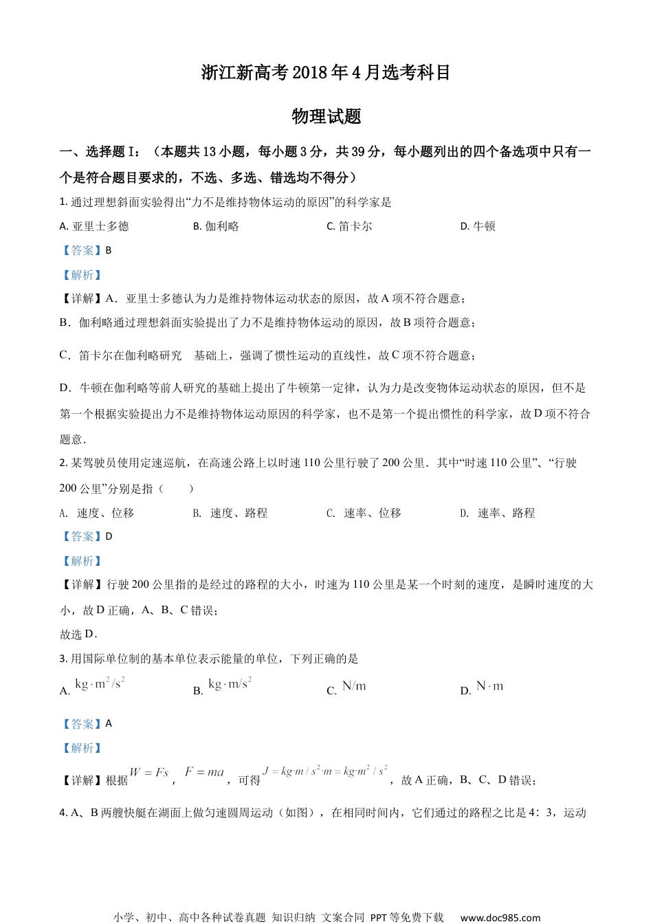 小学、初中、高中各种试卷真题知识归纳文案合同PPT等免费下载www.doc985.com浙江新高考2018年4月选考科目物理试题一、选择题I:(本题共13小题,每小题3分,共39分,每小题列出的四个备选项中只有一个是符合题目要求的,不选、多选、错选均不得分)1.通过理想斜面实验得出“力不是维持物体运动的原因”的科学家是A.亚里士多德B.伽利略C.笛卡尔D.牛顿【答案】B【解析】【详解】A.亚里士多德认为力是维持物体运动状态的原因,故A项不符合题意;B.伽利略通过理想斜面实验提出了力不是维持物体运动的原因,故B项符合题意;C.笛卡尔在伽利略研究的基础上,强调了惯性运动的直线性,故C项不符合题意;D.牛顿在伽利略等前人研究的基础上提出了牛顿第一定律,认为力是改变物体运动状态的原因,但不是第一个根据实验提出力不是维持物体运动原因的科学家,也不是第一个提出惯性的科学家,故D项不符合题意.2.某驾驶员使用定速巡航,在高速公路上以时速110公里行驶了200公里.其中“时速110公里”“、行驶200公里”分别是指()A.速度、位移B.速度、路程C.速率、位移D.速率、路程【答案】D【解析】【详解】行驶200公里指的是经过的路程的大小,时速为110公里是某一个时刻的速度,是瞬时速度的大小,故D正确,A、B、C错误;故选D.3.用国际单位制的基本单位表示能量的单位,下列正确的是A.B.C.D.【答案】A【解析】【详解】根据,,可得,故A正确,B、C、D错误;4.A、B两艘快艇在湖面上做匀速圆周运动(如图),在相同时间内,它们通过的路程之比是4:3,运动小学、初中、高中各种试卷真题知识归纳文案合同PPT等免费下载www.doc985.com方向改变的角度之比是3:2,则它们()A.线速度大小之比为4:3B.角速度大小之比为3:4C.圆周运动的半径之比为2:1D.向心加速度大小之比为1:2【答案】A【解析】【详解】A、因为相同时间内他们通过的路程之比是4:3,根据,则A、B的线速度之比为4:3,故A正确;B、运动方向改变的角度之比为3:2,根据,则角速度之比为3:2,故B错误;C、根据可得圆周运动的半径之比为,故C错误;D、根据a=vω得,向心加速度之比为,故D错误;故选A.5.杭州市正将主干道上的部分高压钠灯换成LED灯,已知高压钠灯功率为400W,LED灯功率为180W,若更换4000盏,则一个月可节约的电能约为A.B.C.D.【答案】B【解析】【详解】一个月可节省的电能最接近,故B正确,ACD错误;故选B.小学、初中、高中各种试卷真题知识归纳文案合同PPT等免费下载www.doc985.com6.真空中两个完全相同、带等量同种电荷的金属小球A和B(可视为点电荷),分别固定在两处,它们之间的静电力为F,用一个不带电的同样金属球C先后与A、B球接触,然后移开球C,此时A、B球间的静电力为A.B.C.D.【答案】C【解析】【详解】真空中两个静止点电荷间的静电力大小为:,不带电的同样的金属小球C先与A接触:,带同种电荷的金属小球C再与B接触:,则两点电荷间的静电力大小为:,故C正确,ABD错误.【点睛】由库仑定律可知,在真空是必须确保电荷量不变,且电荷间距要大是能将带电量看成点来处理.同时两球带同种电荷,所以当与A球接触后的小球C与B球接触时,则先出现电荷中和,然后再平分电荷.7.处于磁场B中的矩形金属线框可绕轴转动,当线框中通以电流I时,如图所示,此时线框左右两边受到安培力F的方向正确的是A.B.C.D.【答案】D小学、初中、高中各种试卷真题知识归纳文案合同PPT等免费下载www.doc985.com【解析】【详解】由图可知:磁场的方向水平向左,由左手定则可知:左边受到的安培力方向竖直向上,右边受到的安培力方向竖直向下,故D正确,A、B、C错误;故选D.8.如图所示,小芳在体重计上完成下蹲动作,下列F-t图像能反应体重计示数随时间变化的是A.B.C.D.【答案】C【解析】【详解】对人的运动过程分析可知,人下蹲的过程可以分成两段:人在加速下蹲的过程中,有向下的加速度,处于失重状态,此时人对传感器的压力小于人的重力的大小;在减速下蹲的过程中,加速度方向向上,处于超重状态,此时人对传感器的压力大于人的重力的大小,故C正确,A、B、D错误;故选C.【点睛】人在加速下蹲的过程中,有向下的加速...