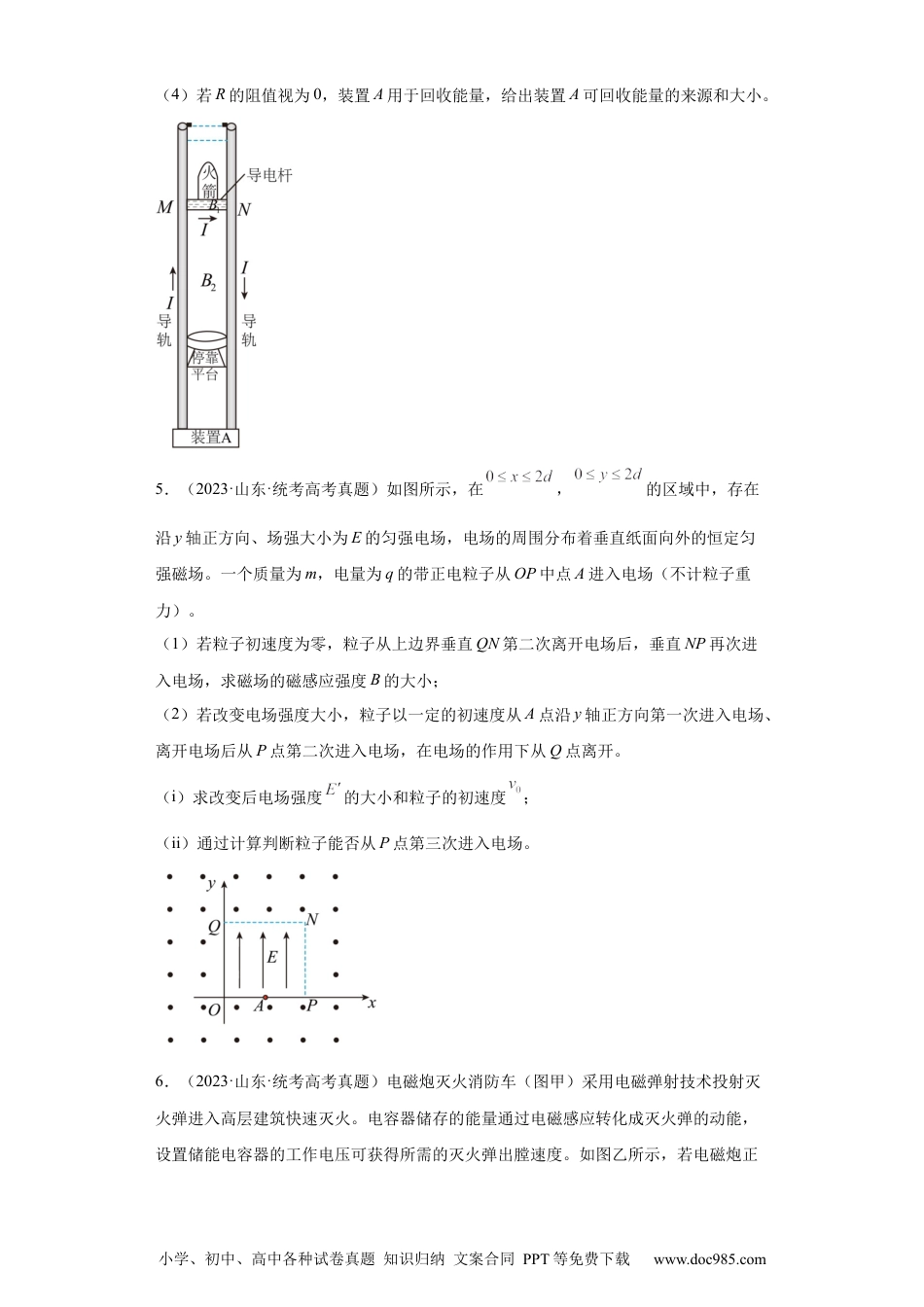 小学、初中、高中各种试卷真题知识归纳文案合同PPT等免费下载www.doc985.com专题20电学综合计算题一、解答题1.(2023·全国·统考高考真题)如图,水平桌面上固定一光滑U型金属导轨,其平行部分的间距为,导轨的最右端与桌子右边缘对齐,导轨的电阻忽略不计。导轨所在区域有方向竖直向上的匀强磁场,磁感应强度大小为。一质量为、电阻为、长度也为的金属棒P静止在导轨上。导轨上质量为的绝缘棒Q位于P的左侧,以大小为的速度向P运动并与P发生弹性碰撞,碰撞时间很短。碰撞一次后,P和Q先后从导轨的最右端滑出导轨,并落在地面上同一地点。P在导轨上运动时,两端与导轨接触良好,P与Q始终平行。不计空气阻力。求(1)金属棒P滑出导轨时的速度大小;(2)金属棒P在导轨上运动过程中产生的热量;(3)与P碰撞后,绝缘棒Q在导轨上运动的时间。2.(2023·全国·统考高考真题)如图,等边三角形位于竖直平面内,AB边水平,顶点C在AB边上方,3个点电荷分别固定在三角形的三个顶点上。已知AB边中点M处的电场强度方向竖直向下,BC边中点N处的电场强度方向竖直向上,A点处点电荷的电荷量的绝对值为q,求(1)B点处点电荷的电荷量的绝对值并判断3个点电荷的正负;(2)C点处点电荷的电荷量。3.(2023·天津·统考高考真题)如图,有一正方形线框,质量为m,电阻为R,边长小学、初中、高中各种试卷真题知识归纳文案合同PPT等免费下载www.doc985.com为l,静止悬挂着,一个三角形磁场垂直于线框所在平面,磁感线垂直纸面向里,且线框中磁区面积为线框面积一半,磁感应强度变化B=kt(k>0),己知重力加速度g,求:(1)感应电动势E;(2)线框开始向上运动的时刻t0;4.(2023·浙江·统考高考真题)某兴趣小组设计了一种火箭落停装置,简化原理如图所示,它由两根竖直导轨、承载火箭装置(简化为与火箭绝缘的导电杆MN)和装置A组成,并形成闭合回路。装置A能自动调节其输出电压确保回路电流I恒定,方向如图所示。导轨长度远大于导轨间距,不论导电杆运动到什么位置,电流I在导电杆以上空间产生的磁场近似为零,在导电杆所在处产生的磁场近似为匀强磁场,大小(其中k为常量),方向垂直导轨平面向里;在导电杆以下的两导轨间产生的磁场近似为匀强磁场,大小,方向与B1相同。火箭无动力下降到导轨顶端时与导电杆粘接,以速度v0进入导轨,到达绝缘停靠平台时速度恰好为零,完成火箭落停。已知火箭与导电杆的总质量为M,导轨间距,导电杆电阻为R。导电杆与导轨保持良好接触滑行,不计空气阻力和摩擦力,不计导轨电阻和装置A的内阻。在火箭落停过程中,(1)求导电杆所受安培力的大小F和运动的距离L;(2)求回路感应电动势E与运动时间t的关系;(3)求装置A输出电压U与运动时间t的关系和输出的能量W;小学、初中、高中各种试卷真题知识归纳文案合同PPT等免费下载www.doc985.com(4)若R的阻值视为0,装置A用于回收能量,给出装置A可回收能量的来源和大小。5.(2023·山东·统考高考真题)如图所示,在,的区域中,存在沿y轴正方向、场强大小为E的匀强电场,电场的周围分布着垂直纸面向外的恒定匀强磁场。一个质量为m,电量为q的带正电粒子从OP中点A进入电场(不计粒子重力)。(1)若粒子初速度为零,粒子从上边界垂直QN第二次离开电场后,垂直NP再次进入电场,求磁场的磁感应强度B的大小;(2)若改变电场强度大小,粒子以一定的初速度从A点沿y轴正方向第一次进入电场、离开电场后从P点第二次进入电场,在电场的作用下从Q点离开。(i)求改变后电场强度的大小和粒子的初速度;(ii)通过计算判断粒子能否从P点第三次进入电场。6.(2023·山东·统考高考真题)电磁炮灭火消防车(图甲)采用电磁弹射技术投射灭火弹进入高层建筑快速灭火。电容器储存的能量通过电磁感应转化成灭火弹的动能,设置储能电容器的工作电压可获得所需的灭火弹出膛速度。如图乙所示,若电磁炮正小学、初中、高中各种试卷真题知识归纳文案合同PPT等免费下载www.doc985.com对高楼,与高楼之间的水平距离,灭火弹出膛速度,方向与水平面夹角,不计炮口离地面高度及空气阻力,取重力加速度大小,。(1)求灭火弹击中高楼位置距...