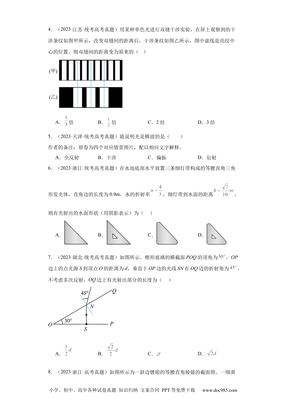 小学、初中、高中各种试卷真题知识归纳文案合同PPT等免费下载www.doc985.com专题14光学一、单选题1.(2023·山东·统考高考真题)如图所示为一种干涉热膨胀仪原理图。G为标准石英环,C为待测柱形样品,C的上表面与上方标准平面石英板之间存在劈形空气层。用单色平行光垂直照射上方石英板,会形成干涉条纹。已知C的膨胀系数小于G的膨胀系数,当温度升高时,下列说法正确的是()A.劈形空气层的厚度变大,条纹向左移动B.劈形空气层的厚度变小,条纹向左移动C.劈形空气层的厚度变大,条纹向右移动D.劈形空气层的厚度变小,条纹向右移动2.(2023·北京·统考高考真题)阳光下的肥皂膜呈现彩色条纹,这种现象属于光的()A.偏振现象B.衍射现象C.干涉现象D.全反射现象3.(2023·江苏·统考高考真题)地球表面附近空气的折射率随高度降低而增大,太阳光斜射向地面的过程中会发生弯曲。下列光路图中能描述该现象的是()A.B.C.D.小学、初中、高中各种试卷真题知识归纳文案合同PPT等免费下载www.doc985.com4.(2023·江苏·统考高考真题)用某种单色光进行双缝干涉实验,在屏上观察到的干涉条纹如图甲所示,改变双缝间的距离后,干涉条纹如图乙所示,图中虚线是亮纹中心的位置。则双缝间的距离变为原来的()A.倍B.倍C.2倍D.3倍5.(2023·天津·统考高考真题)能说明光是横波的是()作者的备注:原卷为四个对应情景图片,配以相应文字解释。A.全反射B.干涉C.偏振D.衍射6.(2023·浙江·统考高考真题)在水池底部水平放置三条细灯带构成的等腰直角三角形发光体,直角边的长度为0.9m,水的折射率,细灯带到水面的距离,则有光射出的水面形状(用阴影表示)为()A.B.C.D.7.(2023·湖北·统考高考真题)如图所示,楔形玻璃的横截面POQ的顶角为,OP边上的点光源S到顶点O的距离为d,垂直于OP边的光线SN在OQ边的折射角为。不考虑多次反射,OQ边上有光射出部分的长度为()A.B.C.D.8.(2023·浙江·高考真题)如图所示为一斜边镀银的等腰直角棱镜的截面图。一细黄小学、初中、高中各种试卷真题知识归纳文案合同PPT等免费下载www.doc985.com光束从直角边以角度入射,依次经和两次反射,从直角边出射。出射光线相对于入射光线偏转了角,则()A.等于B.大于C.小于D.与棱镜的折射率有关9.(2022·海南·高考真题)如图为一用透明材料做成的中心是空的球,其中空心部分半径与球的半径之比为1:3。当细光束以的入射角射入球中,其折射光线刚好与内壁相切,则该透明材料的折射率为()A.B.1.5C.D.210.(2022·北京·高考真题)下列现象能说明光是横波的是()A.光的衍射现象B.光的折射现象C.光的偏振现象D.光的干涉现象11.(2022·辽宁·高考真题)完全失重时,液滴呈球形,气泡在液体中将不会上浮。2021年12月,在中国空间站“天宫课堂”的水球光学实验中,航天员向水球中注入空气形成了一个内含气泡的水球。如图所示,若气泡与水球同心,在过球心O的平面内,用单色平行光照射这一水球。下列说法正确的是()A.此单色光从空气进入水球,频率一定变大B.此单色光从空气进入水球,频率一定变小C.若光线1在M处发生全反射,光线2在N处一定发生全反射小学、初中、高中各种试卷真题知识归纳文案合同PPT等免费下载www.doc985.comD.若光线2在N处发生全反射,光线1在M处一定发生全反射12.(2022·浙江·统考高考真题)如图所示,王亚平在天宫课堂上演示了水球光学实验,在失重环境下,往大水球中央注入空气,形成了一个空气泡,气泡看起来很明亮,其主要原因是()A.气泡表面有折射没有全反射B.光射入气泡衍射形成“亮斑”C.气泡表面有折射和全反射D.光射入气泡干涉形成“亮纹”13.(2022·浙江·统考高考真题)关于双缝干涉实验,下列说法正确的是()A.用复色光投射就看不到条纹B.明暗相间条纹是两列光在屏上叠加的结果C.把光屏前移或后移,不能看到明暗相间条纹D.蓝光干涉条纹的间距比红光的大14.(2022·山东·统考高考真题)柱状光学器件横截面如图所示,右侧是以O为圆心、半径为R的圆,左侧是直角梯形,长为R,与夹角,中点为B。a、b两种...