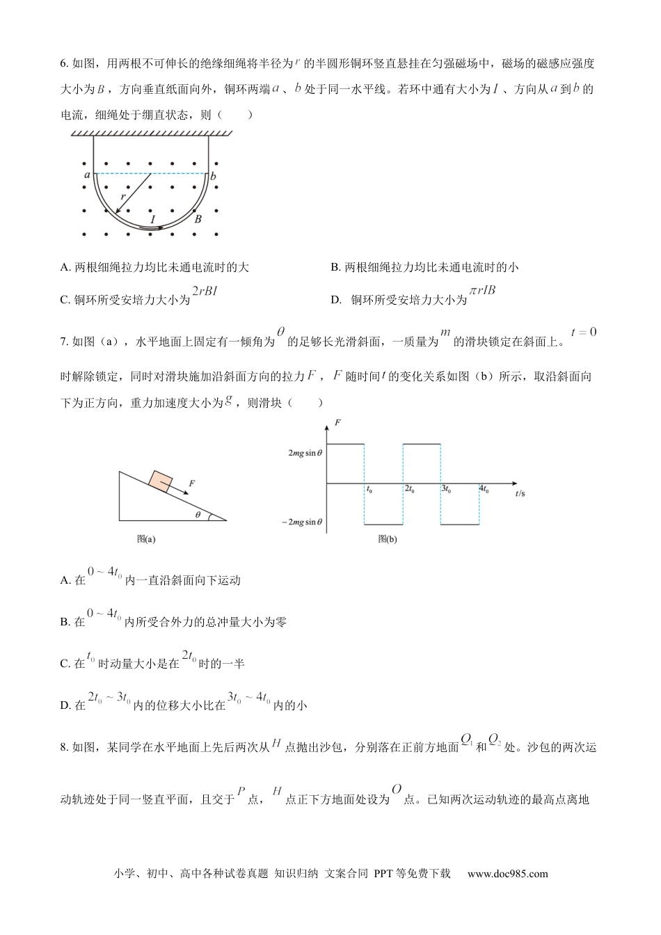 小学、初中、高中各种试卷真题知识归纳文案合同PPT等免费下载www.doc985.com2024年福建省普通高中学业水平等级性考试物理一、单项选择题:本题共4小题,每小题4分,共16分,在每小题给出的四个选项中,只有一项是符合题目要求的。1.2024年我国研发出一款安全性高、稳定发电时间长的新微型原子能电池。该电池将衰变释放的能量转化为电能,衰变方程为,式中,是质量可忽略不计的中性粒子,则X表示的是()A.B.C.D.2.如图(a),装有砂粒的试管竖直静浮于水中,将其提起一小段距离后释放,一段时间内试管在竖直方向的振动可视为简谐运动。取竖直向上为正方向,以某时刻作为计时起点,试管振动图像如图(b)所示,则试管()A.振幅为B.振动频率为C.在时速度为零D.在时加速度方向竖直向下3.某公司在封闭公路上对一新型电动汽车进行直线加速和刹车性能测试,某次测试的速度一时间图像如图所示。已知和内图线为直线,内图线为曲线,则该车()小学、初中、高中各种试卷真题知识归纳文案合同PPT等免费下载www.doc985.comA.在的平均速度为B.在做匀减速直线运动C.在内的位移比在内的大D.在的加速度大小比的小4.拓扑结构在现代物理学中具有广泛的应用。现有一条绝缘纸带,两条平行长边镶有铜丝,将纸带一端扭转180°,与另一端连接,形成拓扑结构的莫比乌斯环,如图所示。连接后,纸环边缘的铜丝形成闭合回路,纸环围合部分可近似为半径为R的扁平圆柱。现有一匀强磁场从圆柱中心区域垂直其底面穿过,磁场区域的边界是半径为r的圆(r<R)。若磁感应强度大小B随时间t的变化关系为B=kt(k为常量),则回路中产生的感应电动势大小为()A.0B.kπR2C.2kπr2D.2kπR2二、多项选择题:本题共4小题,每小题6分,共24分,每小题有多项符合题目要求,全部选对的得6分,选对但不全的得3分,有选错的得0分。5.据报道,我国计划发射的“巡天号”望远镜将运行在离地面约的轨道上,其视场比“哈勃”望远镜的更大。已知“哈勃”运行在离地面约的轨道上,若两望远镜绕地球近似做匀速圆周运动,则“巡天号”()A.角速度大小比“哈勃”的小B.线速度大小比“哈勃”的小C.运行周期比“哈勃”的小D.向心加速度大小比“哈勃”的大小学、初中、高中各种试卷真题知识归纳文案合同PPT等免费下载www.doc985.com6.如图,用两根不可伸长的绝缘细绳将半径为的半圆形铜环竖直悬挂在匀强磁场中,磁场的磁感应强度大小为,方向垂直纸面向外,铜环两端、处于同一水平线。若环中通有大小为、方向从到的电流,细绳处于绷直状态,则()A.两根细绳拉力均比未通电流时的大B.两根细绳拉力均比未通电流时的小C.铜环所受安培力大小为D.铜环所受安培力大小为7.如图(a),水平地面上固定有一倾角为的足够长光滑斜面,一质量为的滑块锁定在斜面上。时解除锁定,同时对滑块施加沿斜面方向的拉力,随时间的变化关系如图(b)所示,取沿斜面向下为正方向,重力加速度大小为,则滑块()A.在内一直沿斜面向下运动B.在内所受合外力的总冲量大小为零C.在时动量大小是在时的一半D.在内的位移大小比在内的小8.如图,某同学在水平地面上先后两次从点抛出沙包,分别落在正前方地面和处。沙包的两次运动轨迹处于同一竖直平面,且交于点,点正下方地面处设为点。已知两次运动轨迹的最高点离地小学、初中、高中各种试卷真题知识归纳文案合同PPT等免费下载www.doc985.com高度均为,,,,沙包质量为,忽略空气阻力,重力加速度大小取,则沙包()A.第一次运动过程中上升与下降时间之比B.第一次经点时的机械能比第二次的小C.第一次和第二次落地前瞬间的动能之比为D.第一次抛出时速度方向与落地前瞬间速度方向的夹角比第二次的大三、非选择题:共60分,其中9、10为填空题,11、12为实验题,13~15为计算题。9.夜间环境温度为时,某汽车轮胎的胎压为个标准大气压,胎内气体视为理想气体,温度与环境温度相同,体积和质量都保持不变。次日中午,环境温度升至,此时胎压为_____个标准大气压,胎内气体的内能_____(填“大于”“等于”或“小于”)时的内能。(计算时取)10.镀有反射膜的三棱镜常用在激光器中进行波长的选择。如图,一束复色光以一定入射角()...