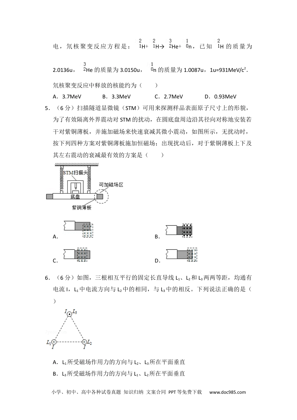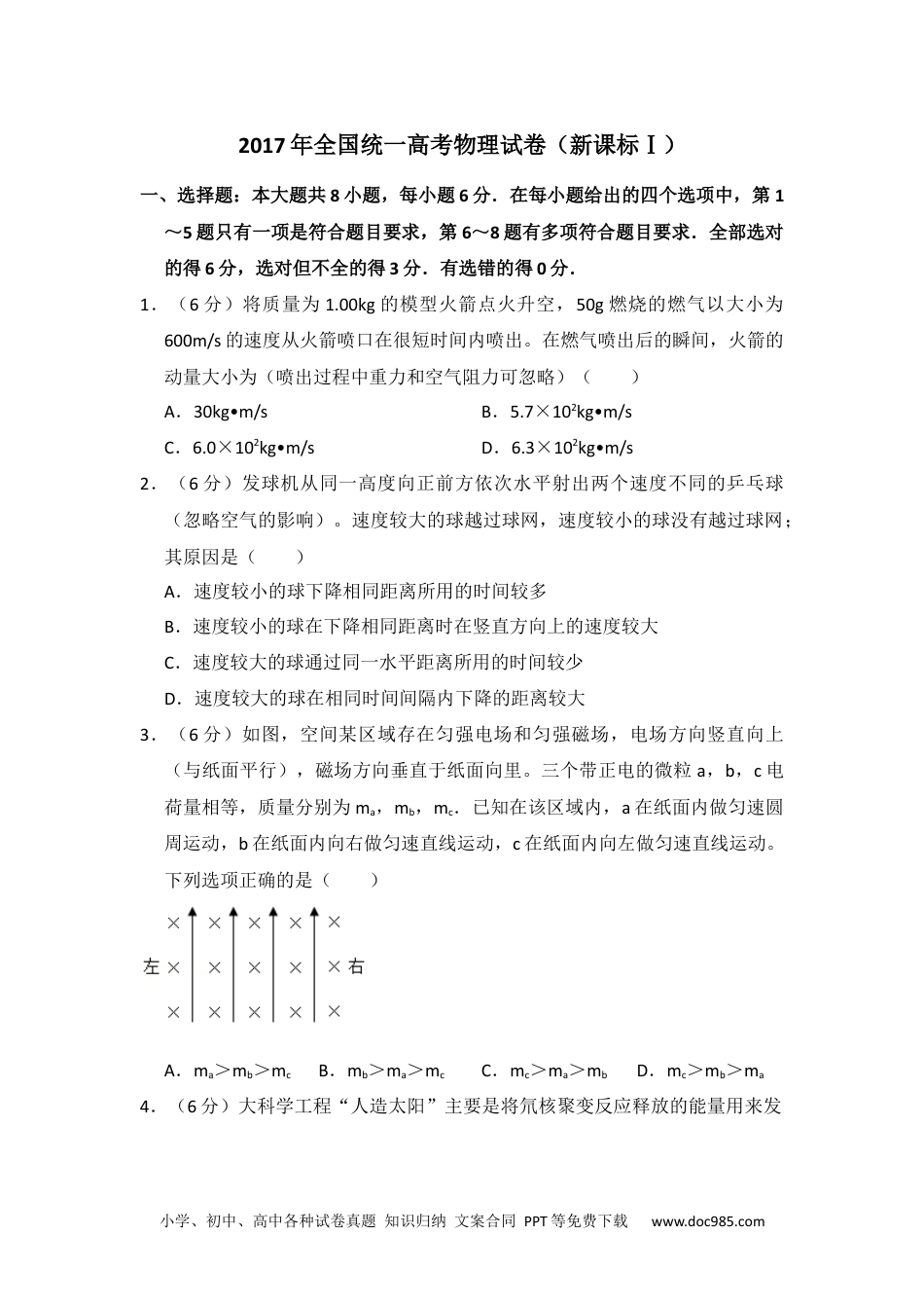 小学、初中、高中各种试卷真题知识归纳文案合同PPT等免费下载www.doc985.com2017年全国统一高考物理试卷(新课标Ⅰ)一、选择题:本大题共8小题,每小题6分.在每小题给出的四个选项中,第1~5题只有一项是符合题目要求,第6~8题有多项符合题目要求.全部选对的得6分,选对但不全的得3分.有选错的得0分.1.(6分)将质量为1.00kg的模型火箭点火升空,50g燃烧的燃气以大小为600m/s的速度从火箭喷口在很短时间内喷出。在燃气喷出后的瞬间,火箭的动量大小为(喷出过程中重力和空气阻力可忽略)()A.30kg•m/sB.5.7×102kg•m/sC.6.0×102kg•m/sD.6.3×102kg•m/s2.(6分)发球机从同一高度向正前方依次水平射出两个速度不同的乒乓球(忽略空气的影响)。速度较大的球越过球网,速度较小的球没有越过球网;其原因是()A.速度较小的球下降相同距离所用的时间较多B.速度较小的球在下降相同距离时在竖直方向上的速度较大C.速度较大的球通过同一水平距离所用的时间较少D.速度较大的球在相同时间间隔内下降的距离较大3.(6分)如图,空间某区域存在匀强电场和匀强磁场,电场方向竖直向上(与纸面平行),磁场方向垂直于纸面向里。三个带正电的微粒a,b,c电荷量相等,质量分别为ma,mb,mc.已知在该区域内,a在纸面内做匀速圆周运动,b在纸面内向右做匀速直线运动,c在纸面内向左做匀速直线运动。下列选项正确的是()A.ma>mb>mcB.mb>ma>mcC.mc>ma>mbD.mc>mb>ma4.(6分)大科学工程“人造太阳”主要是将氘核聚变反应释放的能量用来发小学、初中、高中各种试卷真题知识归纳文案合同PPT等免费下载www.doc985.com电,氘核聚变反应方程是:H+H→He+n,已知H的质量为2.0136u,He的质量为3.0150u,n的质量为1.0087u,1u=931MeV/c2.氘核聚变反应中释放的核能约为()A.3.7MeVB.3.3MeVC.2.7MeVD.0.93MeV5.(6分)扫描隧道显微镜(STM)可用来探测样品表面原子尺寸上的形貌,为了有效隔离外界震动对STM的扰动,在圆底盘周边沿其径向对称地安装若干对紫铜薄板,并施加磁场来快速衰减其微小震动,如图所示,无扰动时,按下列四种方案对紫铜薄板施加恒磁场;出现扰动后,对于紫铜薄板上下及其左右震动的衰减最有效的方案是()A.B.C.D.6.(6分)如图,三根相互平行的固定长直导线L1、L2和L3两两等距,均通有电流I,L1中电流方向与L2中的相同,与L3中的相反。下列说法正确的是()A.L1所受磁场作用力的方向与L2、L3所在平面垂直B.L3所受磁场作用力的方向与L1、L2所在平面垂直小学、初中、高中各种试卷真题知识归纳文案合同PPT等免费下载www.doc985.comC.L1、L2和L3单位长度所受的磁场作用力大小之比为1:1:D.L1、L2和L3单位长度所受的磁场作用力大小之比为::17.(6分)在一静止点电荷的电场中,任一点的电势φ与该点到点电荷的距离r的关系如图所示。电场中四个点a、b、c和d的电场强度大小分别Ea、Eb、Ec和Ed,点a到点电荷的距离ra与点a的电势φa已在图中用坐标(ra,φa)标出,其余类推。现将一带正电的试探电荷由a点依次经b、c点移动到d点,在相邻两点间移动的过程中,电场力所做的功分别为Wab、Wbc和Wcd.下列选项正确的是()A.Ea:Eb=4:1B.Ec:Ed=2:1C.Wab:Wbc=3:1D.Wbc:Wcd=1:38.(6分)如图,柔软轻绳ON的一端O固定,其中间某点M拴一重物,用手拉住绳的另一端N.初始时,OM竖直且MN被拉直,OM与MN之间的夹角α(α>)。现将重物向右上方缓慢拉起,并保持夹角α不变,在OM由竖直被拉到水平的过程中()A.MN上的张力逐渐增大B.MN上的张力先增大后减小C.OM上的张力逐渐增大D.OM上的张力先增大后减小小学、初中、高中各种试卷真题知识归纳文案合同PPT等免费下载www.doc985.com二、非选择题:本卷包括必考题和选考题两部分.第9~32题为必考题,每个试题考生都必须作答.第33~38题为选考题,考生根据要求作答.(一)必考题(共129分)9.(5分)某探究小组为了研究小车在桌面上的直线运动,用自制“滴水计时器”计量时间。实验前,将该计时器固定在小车旁,如图(a)所示。实验时,保持桌面水平,用手轻推一下小车。在小车运动过...