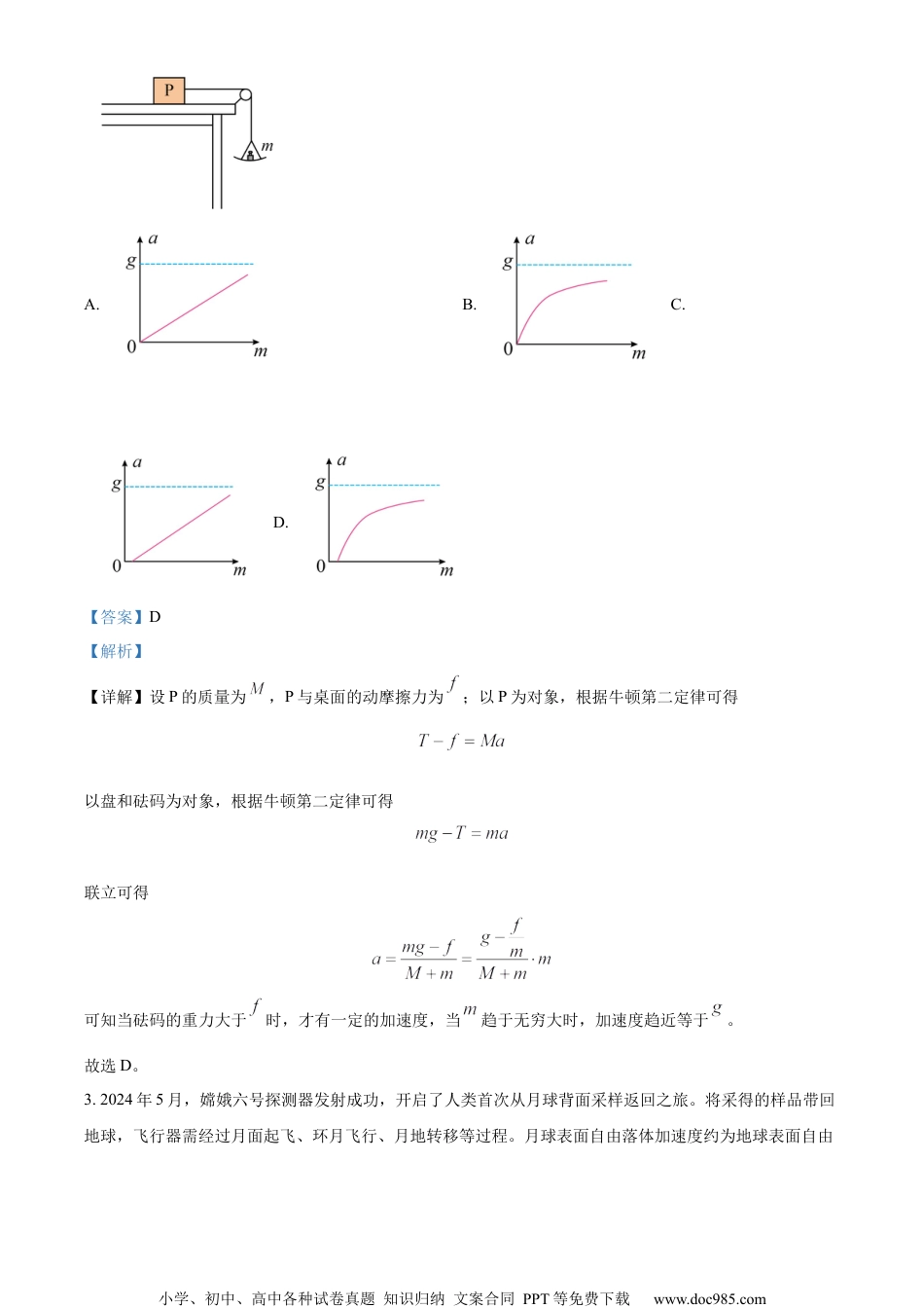 小学、初中、高中各种试卷真题知识归纳文案合同PPT等免费下载www.doc985.com2024年普通高等学校招生全国统一考试物理注意事项:1.答卷前,考生务必将自己的姓名、准考证号填写在答题卡上,并将自己的姓名、准考证号、座位号填写在本试卷上。2.回答选择题时,选出每小题答案后,用2B铅笔把答题卡上对应题目的答案标号涂黑;如需改动,用橡皮擦干净后,再选涂其他答案标号。涂写在本试卷上无效。3.作答非选择题时,将答案书写在答题卡上,书写在本试卷上无效。4.考试结束后,将本试卷和答题卡一并交回。一、选择题:本题共8小题,每小题6分,共48分。在每小题给出的四个选项中,第1~5题只有一项符合题目要求,第6~8题有多项符合题目要求。全部选对的得6分,选对但不全的得3分,有选错的得0分。1.氘核可通过一系列聚变反应释放能量,总的反应效果可用表示,式中x、y的值分别为()A.,B.,C.,D.,【答案】C【解析】【详解】根据反应前后质量数和电荷数守恒可得解得,故选C。2.如图,一轻绳跨过光滑定滑轮,绳的一端系物块P,P置于水平桌面上,与桌面间存在摩擦;绳的另一端悬挂一轻盘(质量可忽略),盘中放置砝码。改变盘中砝码总质量m,并测量P的加速度大小a,得到图像。重力加速度大小为g。在下列图像中,可能正确的是()小学、初中、高中各种试卷真题知识归纳文案合同PPT等免费下载www.doc985.comA.B.C.D.【答案】D【解析】【详解】设P的质量为,P与桌面的动摩擦力为;以P为对象,根据牛顿第二定律可得以盘和砝码为对象,根据牛顿第二定律可得联立可得可知当砝码的重力大于时,才有一定的加速度,当趋于无穷大时,加速度趋近等于。故选D。3.2024年5月,嫦娥六号探测器发射成功,开启了人类首次从月球背面采样返回之旅。将采得的样品带回地球,飞行器需经过月面起飞、环月飞行、月地转移等过程。月球表面自由落体加速度约为地球表面自由小学、初中、高中各种试卷真题知识归纳文案合同PPT等免费下载www.doc985.com落体加速度的。下列说法正确的是()A.在环月飞行时,样品所受合力为零B.若将样品放置在月球正面,它对月球表面压力等于零C.样品在不同过程中受到的引力不同,所以质量也不同D.样品放置在月球背面时对月球的压力,比放置在地球表面时对地球的压力小【答案】D【解析】【详解】A.在环月飞行时,样品所受合力提供所需的向心力,不为零,故A错误;BD.若将样品放置在月球正面,它对月球表面压力大小等于它在月球表面的重力大小;由于月球表面自由落体加速度约为地球表面自由落体加速度的,则样品在地球表面的重力大于在月球表面的重力,所以样品放置在月球背面时对月球的压力,比放置在地球表面时对地球的压力小,故B错误,D正确;C.样品在不同过程中受到的引力不同,但样品的质量相同,故C错误。故选D。4.如图,一光滑大圆环固定在竖直平面内,质量为m的小环套在大圆环上,小环从静止开始由大圆环顶端经Q点自由下滑至其底部,Q为竖直线与大圆环的切点。则小环下滑过程中对大圆环的作用力大小()A.在Q点最大B.在Q点最小C.先减小后增大D.先增大后减小【答案】C【解析】【详解】方法一(分析法):设大圆环半径为,小环在大圆环上某处(点)与圆环的作用力恰好为零,如图所示小学、初中、高中各种试卷真题知识归纳文案合同PPT等免费下载www.doc985.com设图中夹角为,从大圆环顶端到点过程,根据机械能守恒定律在点,根据牛顿第二定律联立解得从大圆环顶端到点过程,小环速度较小,小环重力沿着大圆环圆心方向的分力大于小环所需的向心力,所以大圆环对小环的弹力背离圆心,不断减小,从点到最低点过程,小环速度变大,小环重力和大圆环对小环的弹力合力提供向心力,所以大圆环对小环的弹力逐渐变大,根据牛顿第三定律可知小环下滑过程中对大圆环的作用力大小先减小后增大。方法二(数学法):设大圆环半径为,小环在大圆环上某处时,设该处与圆心的连线与竖直向上的夹角为,根据机械能守恒定律在该处根据牛顿第二定律联立可得则大圆环对小环作用力的大小小学、初中、高中各种试卷真题知识归纳文案合同PPT等免费下载www.doc985.com根据数学知识可知的大小在时最小,结合牛...