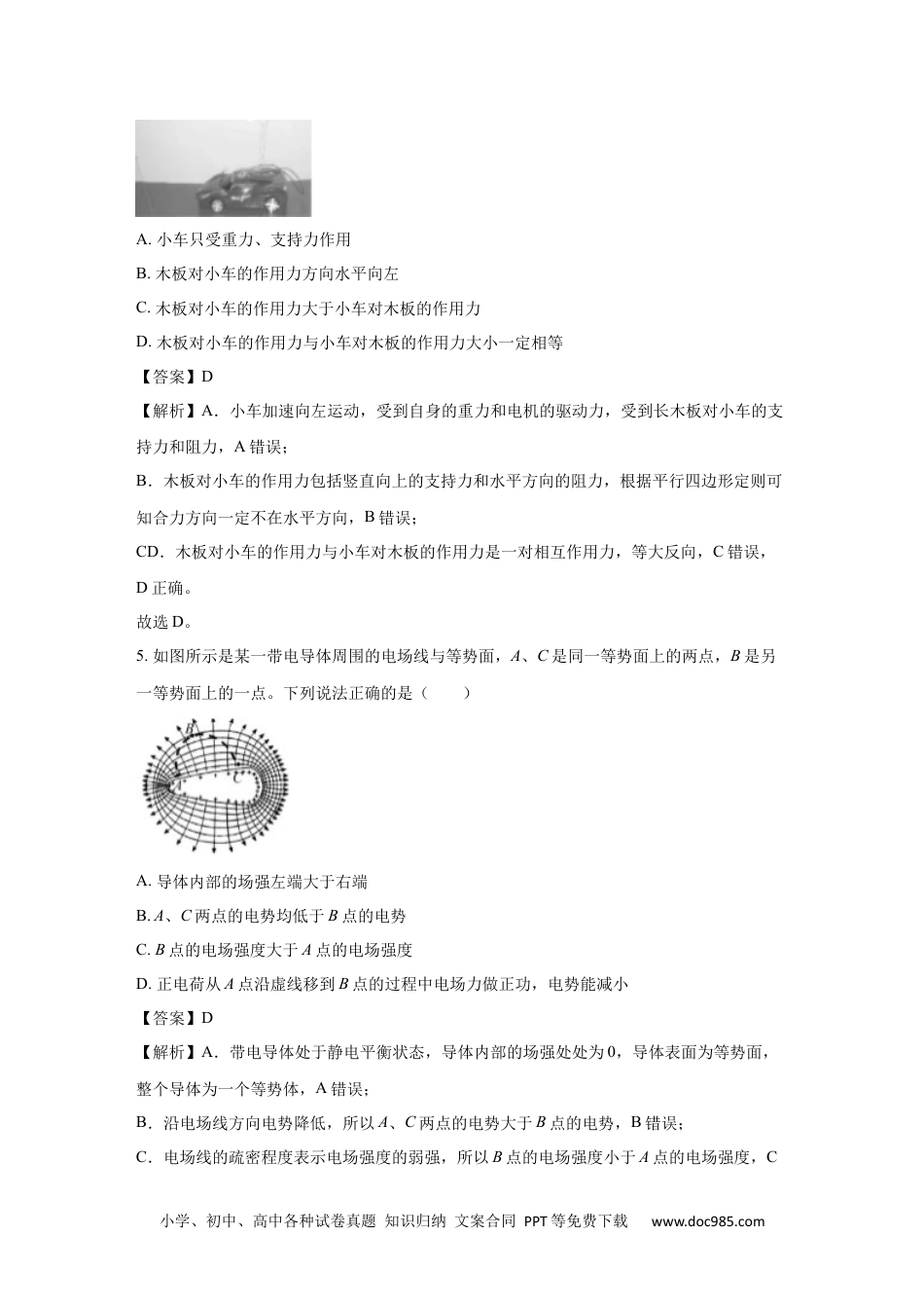 小学、初中、高中各种试卷真题知识归纳文案合同PPT等免费下载www.doc985.com浙江省2021年1月高考物理试卷一、选择题(本共13小题,每小题3分,共39分。每小题列出的四个备选项中只有一个是符合题目要求的,不选、多选、错选均不得分)1.如图所示是我国自主研发的全自动无人值守望远镜,它安装在位于南极大陆的昆仑站,电力供应仅为1×103W。若用国际单位制基本单位的符号来表示W,正确的是()A.N・sB.N・m/sC.kg・m/sD.kg・m2/s3【答案】D【解析】A.不是国际单位制基本单位,根据冲量的定义可知,是冲量的的单位,A错误;B.根据功率的计算公式可知功率的单位可以表示为,但不是国际单位制基本单位,B错误;C.根据动量的定义可知,是动量的单位,C错误;D.根据可知功率的单位可以表示为,结合可知,则功率得单位,D正确。故选D。2.2020年12月我国科学家在量子计算领域取得了重大成果,构建了一台76个光子100个模式的量子计算机“九章”,它处理“高斯玻色取样”的速度比目前最快的超级计算机“富岳”快一百万亿倍。关于量子,下列说法正确的是()小学、初中、高中各种试卷真题知识归纳文案合同PPT等免费下载www.doc985.comA.是计算机运算的一种程序B.表示运算速度的一个单位C.表示微观世界的不连续性观念D.类似于质子、中子的微观粒子【答案】C【解析】量子是不可分割的最小的单元,体现了物质的不连续性,即通常所说的“量子化”。故选A。3.2020年11月10日,我国“奋斗者”号载人潜水器在马里亚纳海沟成功坐底,坐底深度10909m。“奋斗者”号照片如图所示,下列情况中“奋斗者”号一定可视为质点的是()A.估算下降总时间时B.用推进器使其转弯时C.在海沟中穿越窄缝时D.科学家在其舱内进行实验时【答案】A【解析】A.估算潜水器下降的总时间时,潜水器的大小和形状相对运动的轨迹可以忽略,可以视为质点,A正确;BD.用推进器使其转弯时和科学家在其舱内进行实验时,都需要研究潜水器本身的特点,不可视为质点,BD错误;C.在海沟中穿越窄缝时,潜水器的大小和形状相对窄缝,尺寸不可以忽略,不可视为质点,C错误。故选A。4.如图所示,电动遥控小车放在水平长木板上面,当它在长木板上水平向左加速运动时,长木板保持静止,此时()小学、初中、高中各种试卷真题知识归纳文案合同PPT等免费下载www.doc985.comA.小车只受重力、支持力作用B.木板对小车的作用力方向水平向左C.木板对小车的作用力大于小车对木板的作用力D.木板对小车的作用力与小车对木板的作用力大小一定相等【答案】D【解析】A.小车加速向左运动,受到自身的重力和电机的驱动力,受到长木板对小车的支持力和阻力,A错误;B.木板对小车的作用力包括竖直向上的支持力和水平方向的阻力,根据平行四边形定则可知合力方向一定不在水平方向,B错误;CD.木板对小车的作用力与小车对木板的作用力是一对相互作用力,等大反向,C错误,D正确。故选D。5.如图所示是某一带电导体周围的电场线与等势面,A、C是同一等势面上的两点,B是另一等势面上的一点。下列说法正确的是()A.导体内部的场强左端大于右端B.A、C两点的电势均低于B点的电势C.B点的电场强度大于A点的电场强度D.正电荷从A点沿虚线移到B点的过程中电场力做正功,电势能减小【答案】D【解析】A.带电导体处于静电平衡状态,导体内部的场强处处为0,导体表面为等势面,整个导体为一个等势体,A错误;B.沿电场线方向电势降低,所以A、C两点的电势大于B点的电势,B错误;C.电场线的疏密程度表示电场强度的弱强,所以B点的电场强度小于A点的电场强度,C小学、初中、高中各种试卷真题知识归纳文案合同PPT等免费下载www.doc985.com错误;D.根据可知,正电荷从高电势A点沿虚线移动到低电势B点,电势能减小,电场力做正功,D正确。故选D。6.如图所示,同学们坐在相同的轮胎上,从倾角相同的平直雪道先后由同高度静止滑下,各轮胎与雪道间的动摩擦因数均相同,不计空气阻力。雪道上的同学们()A.沿雪道做匀速直线运动B.下滑过程中机械能均守恒C.前后间的距离随时间不断增大D.所受重力沿雪道向下的分力相同【答案】C【解析】A.同学坐在轮胎上从静止开始沿雪道下滑,...