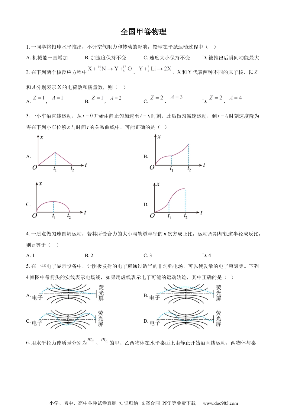 小学、初中、高中各种试卷真题知识归纳文案合同PPT等免费下载www.doc985.com全国甲卷物理1.一同学将铅球水平推出,不计空气阻力和转动的影响,铅球在平抛运动过程中()A.机械能一直增加B.加速度保持不变C.速度大小保持不变D.被推出后瞬间动能最大2.在下列两个核反应方程中、,X和Y代表两种不同的原子核,以Z和A分别表示X的电荷数和质量数,则()A.,B.,C.,D.,3.一小车沿直线运动,从t=0开始由静止匀加速至t=t1时刻,此后做匀减速运动,到t=t2时刻速度降为零在下列小车位移x与时间t的关系曲线中,可能正确的是()A.B.C.D.4.一质点做匀速圆周运动,若其所受合力的大小与轨道半径的n次方成正比,运动周期与轨道半径成反比,则n等于()A.1B.2C.3D.45.在一些电子显示设备中,让阴极发射的电子束通过适当的非匀强电场,可以使发散的电子束聚集。下列4幅图中带箭头的实线表示电场线,如果用虚线表示电子可能的运动轨迹,其中正确的是()A.B.C.D.6.用水平拉力使质量分别为、的甲、乙两物体在水平桌面上由静止开始沿直线运动,两物体与桌小学、初中、高中各种试卷真题知识归纳文案合同PPT等免费下载www.doc985.com面间的动摩擦因数分别为和。甲、乙两物体运动后,所受拉力F与其加速度a的关系图线如图所示。由图可知()A.B.C.D.7.光滑刚性绝缘圆筒内存在着平行于轴的匀强磁场,筒上P点开有一个小孔,过P的横截面是以O为圆心的圆,如图所示。一带电粒子从P点沿PO射入,然后与筒壁发生碰撞。假设粒子在每次碰撞前、后瞬间,速度沿圆上碰撞点的切线方向的分量大小不变,沿法线方向的分量大小不变、方向相反;电荷量不变。不计重力。下列说法正确的是()A.粒子的运动轨迹可能通过圆心OB.最少经2次碰撞,粒子就可能从小孔射出C.射入小孔时粒子的速度越大,在圆内运动时间越短D.每次碰撞后瞬间,粒子速度方向一定平行于碰撞点与圆心O的连线8.一有机玻璃管竖直放在水平地面上,管上有漆包线绕成的线圈,线圈的两端与电流传感器相连,线圈在玻璃管上部的5匝均匀分布,下部的3匝也均匀分布,下部相邻两匝间的距离大于上部相邻两匝间的距离。如图(a)所示。现让一个很小的强磁体在玻璃管内沿轴线从上端口由静止下落,电流传感器测得线圈中电流I随时间t的变化如图(b)所示。则()小学、初中、高中各种试卷真题知识归纳文案合同PPT等免费下载www.doc985.comA.小磁体在玻璃管内下降速度越来越快B.下落过程中,小磁体的N极、S极上下顺倒了8次C.下落过程中,小磁体受到的电磁阻力始终保持不变D.与上部相比,小磁体通过线圈下部的过程中,磁通量变化率的最大值更大三、非选择题,共174分。第22~32题为必考题,每个试题考生都必须作答。第33~38题为选考题,考生根据要求作答。(一)必考题:共129分。9.某同学用伏安法测绘一额定电压为6V、额定功率为3W的小灯泡的伏安特性曲线,实验所用电压表内阻约为电流表内阻约为.实验中有图(a)和(b)两个电路图供选择。(1)实验中得到的电流I和电压U的关系曲线如图(c)所示,该同学选择的电路图是图________(填“a”或“b”)(2)若选择另一个电路图进行实验,在答题卡所给图上用实线画出实验中应得到的关系曲线的示意图______。10.某同学利用如图(a)所示的实验装置探究物体做直线运动时平均速度与时间的关系。让小车左端和纸带相连。右端用细绳跨过定滑轮和钩码相连。钩码下落,带动小车运动,打点计时器打出纸带。某次实验得到的纸带和相关数据如图(b)所示。(1)已知打出图(b)中相邻两个计数点的时间间隔均为0.1s.以打出A点时小车位置为初始位置,将打出B、C、D、E、F各点时小车的位移填到表中,小车发生应位移所用时间和平均速度分别为和,小学、初中、高中各种试卷真题知识归纳文案合同PPT等免费下载www.doc985.com表中________cm,________。位移区间ABACADAEAF6.6014.6034.9047.3066.073.087.394.6(2)根据表中数据得到小车平均速度随时间的变化关系,如图(c)所示。题卡上的图中补全实验点_____。(3)从实验结果可知,小车运动的图线可视为一条直线,此直线用方程表示,其中________,________cm/s。(结果均保留3位有效数字)...