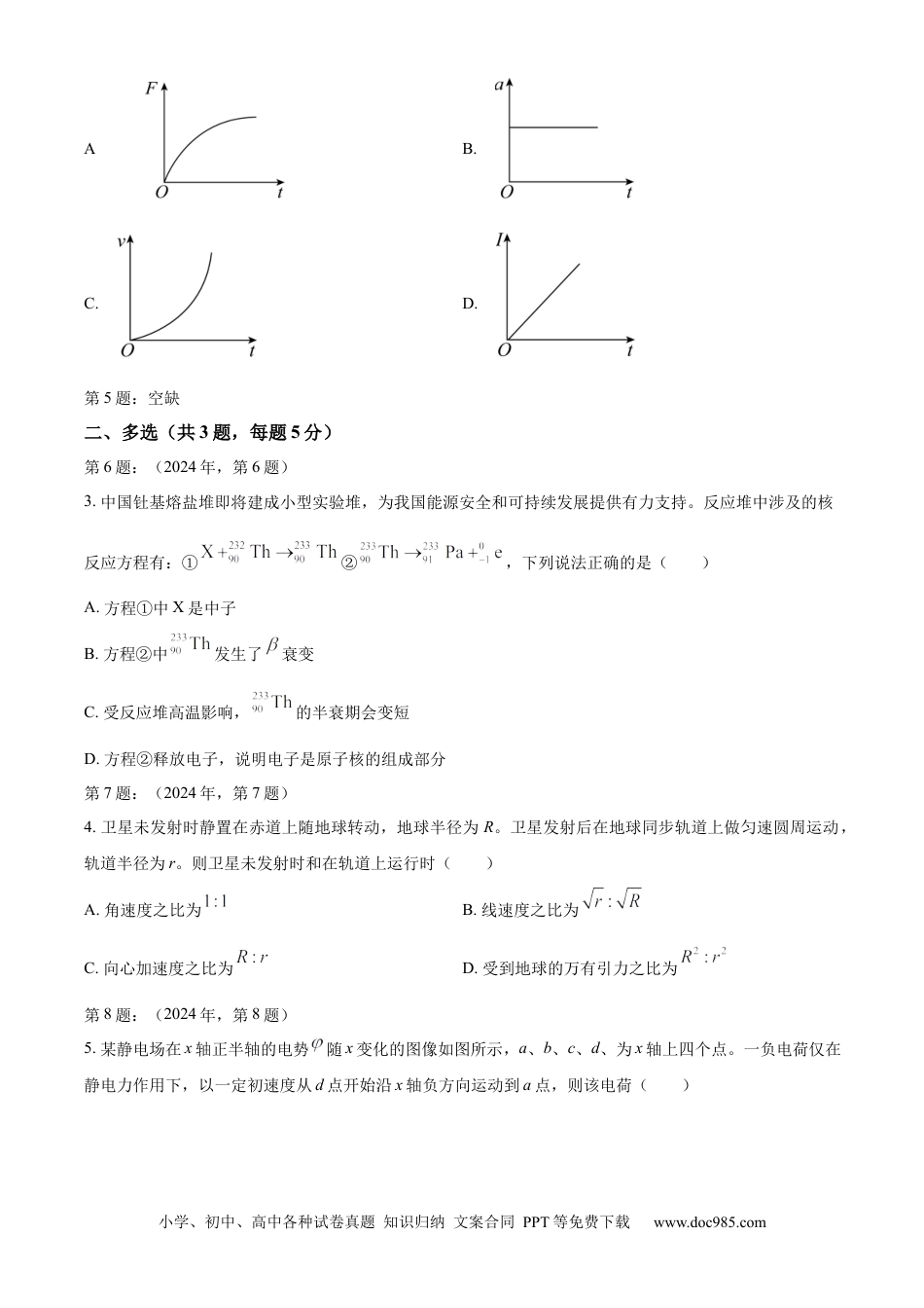 小学、初中、高中各种试卷真题知识归纳文案合同PPT等免费下载www.doc985.com2024天津高考物理真题今年天津考试院没有展示第1、2、5三道小题一、单选(共5题,每题5分)第1题:空缺第2题:空缺第3题:(2024年,第3题)1.一列简谐横波在均匀介质中沿x轴传播,图1是时该波的波形图,图2是处质点的振动图像。则时该波的波形图为()A.B.C.D.第4题:(2024年,第4题)2.如图所示,两根不计电阻的光滑金属导轨平行放置,导轨及其构成的平面均与水平面成某一角度,导轨上端用直导线连接,整个装置处在垂直于导轨平面向上的匀强磁场中。具有一定阻值的金属棒MN从某高度由静止开始下滑,下滑过程中MN始终与导轨垂直并接触良好,则MN所受的安培力F及其加速度a、速度v、电流I,随时间t变化的关系图像可能正确的是()小学、初中、高中各种试卷真题知识归纳文案合同PPT等免费下载www.doc985.comA.B.C.D.第5题:空缺二、多选(共3题,每题5分)第6题:(2024年,第6题)3.中国钍基熔盐堆即将建成小型实验堆,为我国能源安全和可持续发展提供有力支持。反应堆中涉及的核反应方程有:①②,下列说法正确的是()A.方程①中X是中子B.方程②中发生了衰变C.受反应堆高温影响,的半衰期会变短D.方程②释放电子,说明电子是原子核的组成部分第7题:(2024年,第7题)4.卫星未发射时静置在赤道上随地球转动,地球半径为R。卫星发射后在地球同步轨道上做匀速圆周运动,轨道半径为r。则卫星未发射时和在轨道上运行时()A.角速度之比为B.线速度之比为C.向心加速度之比为D.受到地球的万有引力之比为第8题:(2024年,第8题)5.某静电场在x轴正半轴的电势随x变化的图像如图所示,a、b、c、d、为x轴上四个点。一负电荷仅在静电力作用下,以一定初速度从d点开始沿x轴负方向运动到a点,则该电荷()小学、初中、高中各种试卷真题知识归纳文案合同PPT等免费下载www.doc985.comA.在b点电势能最小B.在c点时速度最小C.所受静电力始终做负功D.在a点受静电力沿x轴负方向三、实验题(共6空,每空2分)第9(1)题:(2024年,第9(1)题)6.某同学研究闭合电路的规律。(1)根据闭合电路的欧姆定律得出了电源输出功率P与外电路电阻关系图像,如图所示,则P的峰值对应的外电路电阻值R应_________电源内阻r(填“大于”、“小于”或“等于”);(2)测定电源的电动势和内阻,可供选用的器材有:A.电压表:(量程,内阻约为)B.电流表:(量程,内阻约为)C.滑动变阻器:(最大阻值,额定电流)D.滑动变阻器:(最大阻值,额定电流)E.待测电源:(电动势约为,内阻约为)F.开关、导线若干(i)实验中所用的滑动变阻器应选_________(填器材前字母代号);(ii)实物电路如图所示,单刀双掷开关可分别与1、2端闭合,为使电源内阻的测量结果更接近真实值,小学、初中、高中各种试卷真题知识归纳文案合同PPT等免费下载www.doc985.com应与_________端闭合。第9(2)题:(2024年,第9(2)题)7.某同学用图示装置探究加速度与力的关系。(1)为补偿打点计时器对小车的阻力及其他阻力,调节木板倾角,使小车在不挂槽码时运动,并打出纸带进行检验,下图中能表明补偿阻力恰当的是_________;A.B.C.D.(2)某次实验得到一条纸带,部分计数点如下图所示(每相邻两个计数点间还有4个点,图中未画出),测得。已知打点计时器所接交流电源频率为,则小车的加速度_________(要求充分利用测量数据,结果保留两位有效数字);(3)该同学将一个可以直接测出绳子拉力的传感器安装在小车上,小车和传感器总质量为。按小学、初中、高中各种试卷真题知识归纳文案合同PPT等免费下载www.doc985.com要求补偿阻力后,该同学共进行了四次实验,悬挂的槽码质量依次为处理数据时,用两种方式得到小车(含传感器)受到的合力,一种将槽码所受重力当作合力、另一种将传感器示数当作合力,则这两种方式得到的合力差异最大时,槽码质量为_________g。四、计算题(一般是14分+16分+18分)第10题:(2024年,第10题)8.如图所示,光滑半圆轨道直径沿竖直方向,最低点与水平面相切。对静置于轨道最低点的小球A施加水平向左的瞬时冲量I,A沿轨道运...