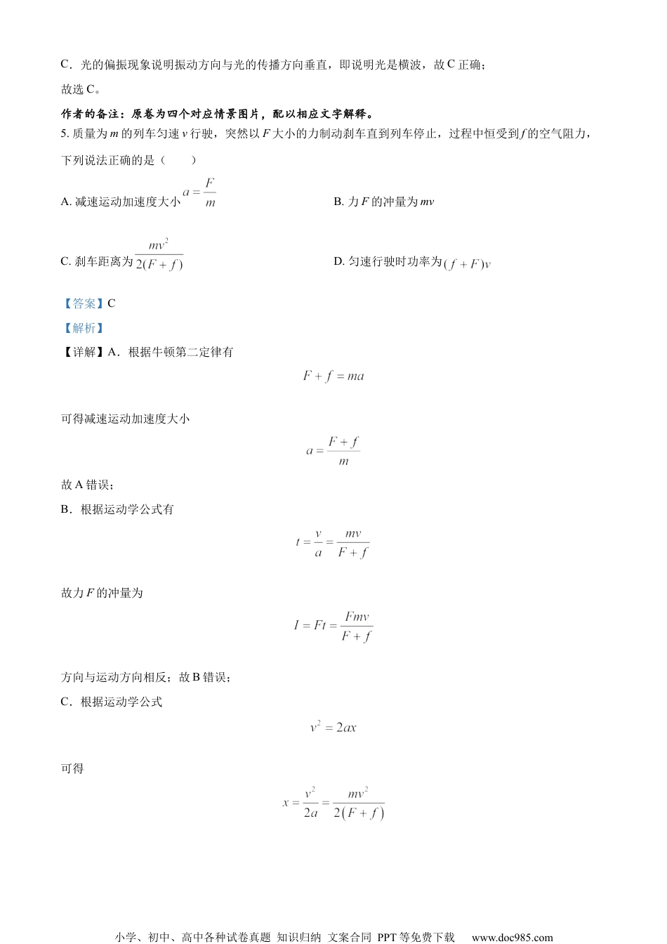 小学、初中、高中各种试卷真题知识归纳文案合同PPT等免费下载www.doc985.com2023年普通高等学校招生考试物理科目(天津卷)真题一、单选题1.运行周期为的北斗卫星比运行周期为的()A.加速度大B.角速度大C.周期小D.线速度小【答案】D【解析】【详解】根据万有引力提供向心力有可得因为北斗卫星周期大,故运行轨道半径大,则线速度小,角速度小,加速度小。故选D。2.如图是爬山所带氧气瓶,氧气瓶里的气体容积质量不变,爬高过程中,温度减小,则气体()A.对外做功B.内能减小C.吸收热量D.压强不变【答案】B【解析】【详解】A.由于爬山过程中气体体积不变,故气体不对外做功,故A错误;B.爬山过程中温度降低,则气体内能减小,故B正确;C.根据热力学第一定律可知小学、初中、高中各种试卷真题知识归纳文案合同PPT等免费下载www.doc985.com爬山过程中气体不做功,但内能见效,故可知气体放出热量,故C错误;D.爬山过程中氧气瓶里的气体容积质量均不变,温度减小,根据理想气体状态方程有可知气体压强减小,故D错误;故选B。3.关于太阳上进行的核聚变,下列说法正确的是()A.核聚变需要在高温下进行B.核聚变中电荷不守恒C.太阳质量不变D.太阳核反应方程式:【答案】A【解析】【详解】A.因为高温时才能使得粒子的热运动剧烈,才有可能克服他们自身相互间的排斥力,使得它们间的距离缩短,才能发生聚变,故A正确;B.核聚变中电荷是守恒的,故B错误;C.因为太阳一直在发生核聚变,需要放出大量能量,根据质能方程可知是要消耗一定的质量的,故C错误;D.核聚变的方程为题中为核裂变方程,故D错误。故选A。4.能说明光是横波的是()作者的备注:原卷为四个对应情景图片,配以相应文字解释。A.全反射B.干涉C.偏振D.衍射【答案】C【解析】【详解】A.根据光的全反射现象,说明光由光密介质进入光疏介质和由光疏介质进入光密介质会有不同的现象,不能因此确定是横波还是纵波,故A错误;BD.干涉和衍射是所有波的特性,不能因此确定是横波还是纵波;根据光能发生干涉和衍射现象,说明光是一种锋返波,具有波动性,故BD错误;小学、初中、高中各种试卷真题知识归纳文案合同PPT等免费下载www.doc985.comC.光的偏振现象说明振动方向与光的传播方向垂直,即说明光是横波,故C正确;故选C。作者的备注:原卷为四个对应情景图片,配以相应文字解释。5.质量为m的列车匀速v行驶,突然以F大小的力制动刹车直到列车停止,过程中恒受到f的空气阻力,下列说法正确的是()A.减速运动加速度大小B.力F的冲量为mvC.刹车距离为D.匀速行驶时功率为【答案】C【解析】【详解】A.根据牛顿第二定律有可得减速运动加速度大小故A错误;B.根据运动学公式有故力F的冲量为方向与运动方向相反;故B错误;C.根据运动学公式可得小学、初中、高中各种试卷真题知识归纳文案合同PPT等免费下载www.doc985.com故C正确;D.匀速行驶时牵引力等于空气阻力,则功率为故D错误。故选C。二、多选题6.下图为输电线为用户输电的情景,电路中升压变压器和降压变压器都认为是理想变压器,中间输电电路电阻为R,下列说法正确的有()A.输出电压与输入电压相等B.输出功率大于输入功率C.若用户接入的用电器增多,则R功率降低D.若用户接入的用电器增多,则输出功率降低【答案】B【解析】【详解】AB.由于输电过程中电阻R要产生热量,会损失功率,故输出功率大于输入功率;输出电压大于输入电压,故A错误,B正确;C.由于输入电压不变,所以变压器的输出变压不变,随着用户接入的用电器增多,导致用户端的等效电阻变小,则电流变大,根据可知R功率增大;故C错误;小学、初中、高中各种试卷真题知识归纳文案合同PPT等免费下载www.doc985.comD.用户接入电路的用电器越多,用电器消耗功率增大,即输出功率增大,故D错误。故选B。7.一列机械波的波源是坐标轴原点,从时波源开始振动,时波形如图,则下列说法正确的有()A.在这种介质中波速B.处质点在时位于波谷C.波源振动方程D.处质点半个周期内向左位移半个波长【答案】BC【解析】【详解】A.由图中可知时,波传播的距离为x=2.5m,故波的速度为故A错误;B.由图可知该波的波长为,所以...