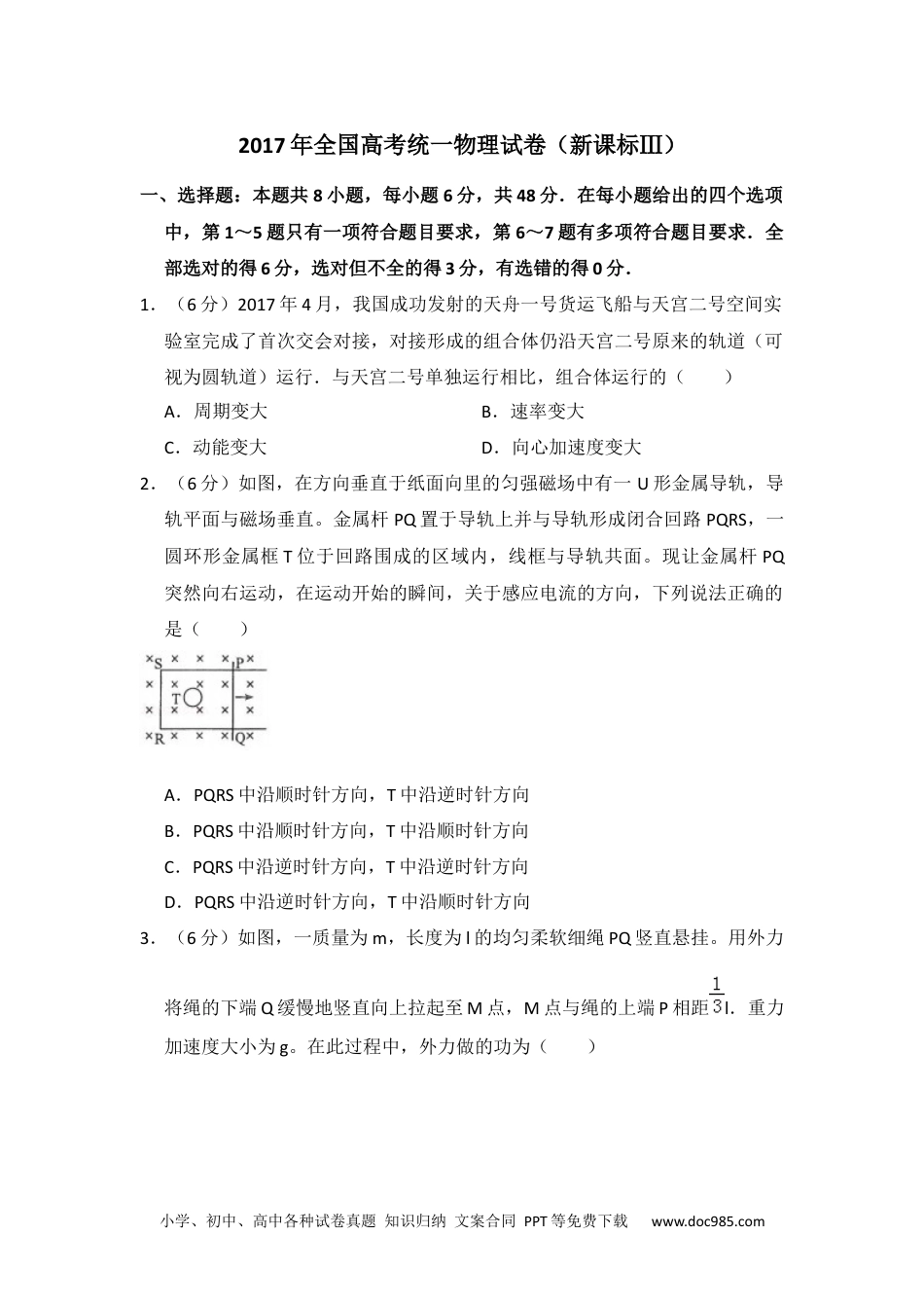 小学、初中、高中各种试卷真题知识归纳文案合同PPT等免费下载www.doc985.com2017年全国高考统一物理试卷(新课标Ⅲ)一、选择题:本题共8小题,每小题6分,共48分.在每小题给出的四个选项中,第1~5题只有一项符合题目要求,第6~7题有多项符合题目要求.全部选对的得6分,选对但不全的得3分,有选错的得0分.1.(6分)2017年4月,我国成功发射的天舟一号货运飞船与天宫二号空间实验室完成了首次交会对接,对接形成的组合体仍沿天宫二号原来的轨道(可视为圆轨道)运行.与天宫二号单独运行相比,组合体运行的()A.周期变大B.速率变大C.动能变大D.向心加速度变大2.(6分)如图,在方向垂直于纸面向里的匀强磁场中有一U形金属导轨,导轨平面与磁场垂直。金属杆PQ置于导轨上并与导轨形成闭合回路PQRS,一圆环形金属框T位于回路围成的区域内,线框与导轨共面。现让金属杆PQ突然向右运动,在运动开始的瞬间,关于感应电流的方向,下列说法正确的是()A.PQRS中沿顺时针方向,T中沿逆时针方向B.PQRS中沿顺时针方向,T中沿顺时针方向C.PQRS中沿逆时针方向,T中沿逆时针方向D.PQRS中沿逆时针方向,T中沿顺时针方向3.(6分)如图,一质量为m,长度为l的均匀柔软细绳PQ竖直悬挂。用外力将绳的下端Q缓慢地竖直向上拉起至M点,M点与绳的上端P相距l.重力加速度大小为g。在此过程中,外力做的功为()小学、初中、高中各种试卷真题知识归纳文案合同PPT等免费下载www.doc985.comA.mglB.mglC.mglD.mgl4.(6分)一根轻质弹性绳的两端分别固定在水平天花板上相距80cm的两点上,弹性绳的原长也为80cm。将一钩码挂在弹性绳的中点,平衡时弹性绳的总长度为100cm;再将弹性绳的两端缓慢移至天花板上的同一点,则弹性绳的总长度变为(弹性绳的伸长始终处于弹性限度内)()A.86cmB.92cmC.98cmD.104cm5.(6分)如图,在磁感应强度大小为B0的匀强磁场中,两长直导线P和Q垂直于纸面固定放置,两者之间的距离为l。在两导线中均通有方向垂直于纸面向里的电流I时,纸面内与两导线距离均为l的a点处的磁感应强度为零。如果让P中的电流反向、其他条件不变,则a点处磁感应强度的大小为()A.0B.B0C.B0D.2B06.(6分)在光电效应实验中,分别用频率为va、vb的单色光a、b照射到同种金属上,测得相应的遏止电压分别为Ua和Ub、光电子的最大初动能分别为Eka和Ekb,h为普朗克常量。下列说法正确的是()A.若va>vb,则一定有Ua<UbB.若va>vb,则一定有Eka>EkbC.若Ua<Ub,则一定有Eka<EkbD.若va>vb,则一定有hvaE﹣ka>hvbE﹣kb7.(6分)一质量为2kg的物块在合外力F的作用下从静止开始沿直线运动。F小学、初中、高中各种试卷真题知识归纳文案合同PPT等免费下载www.doc985.com随时间t变化的图线如图所示,则()A.t=1s时物块的速率为1m/sB.t=2s时物块的动量大小为4kg•m/sC.t=3s时物块的动量大小为5kg•m/sD.t=4s时物块的速度为零8.(6分)一匀强电场的方向平行于xOy平面,平面内a、b、c三点的位置如图所示,三点的电势分别为10V、17V、26V.下列说法正确的是()A.电场强度的大小为2.5V/cmB.坐标原点处的电势为1VC.电子在a点的电势能比在b点的低7eVD.电子从b点运动到c点,电场力做功为9eV二、非选择题(共4小题,满分47分)9.(6分)某探究小组做“验证力的平行四边形定则”实验,将画有坐标轴(横轴为x轴,纵轴为y轴,最小刻度表示1mm)的纸贴在桌面上,如图(a)所示。将橡皮筋的一端Q固定在y轴上的B点(位于图示部分除外),另一端P位于y轴上的A点时,橡皮筋处于原长。(1)用一只测力计将橡皮筋的P端沿y轴从A点拉至坐标原点O,此时拉力F的大小可由测力计读出。测力计的示数如图(b)所示,F的大小为N。小学、初中、高中各种试卷真题知识归纳文案合同PPT等免费下载www.doc985.com(2)撤去(1)中的拉力,橡皮筋P端回到A点;现使用两个测力计同时拉橡皮筋,再次将P端拉至O点,此时观察到两个拉力分别沿图(a)中两条虚线所示的方向,由测力计的示数读出两个拉力的大小分别为F1=4.2N和F2=5.6N。(i)用5mm长度的线段表示1N的力,以O点为作用点,在图(a)中画出力F1、F2...