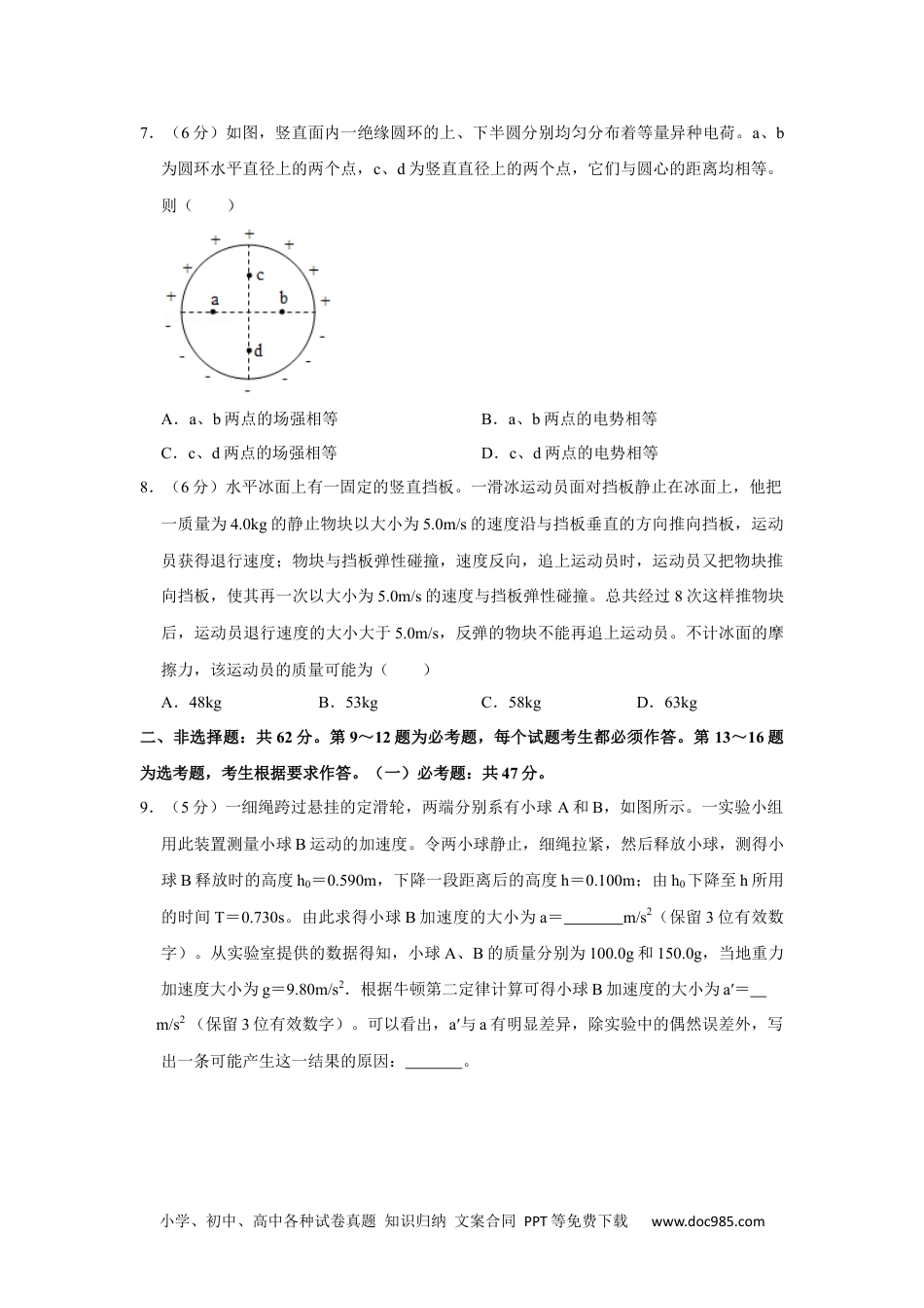 小学、初中、高中各种试卷真题知识归纳文案合同PPT等免费下载www.doc985.com2020年全国统一高考物理试卷(新课标Ⅱ)一、选择题:本题共8小题,每小题6分,共48分。在每小题给出的四个选项中,第1~5题只有一项符合题目要求,第6~8题有多项符合题目要求。全部选对的得6分,选对但不全的得3分,有选错的得0分。1.(6分)管道高频焊机可以对由钢板卷成的圆管的接缝实施焊接。焊机的原理如图所示,圆管通过一个接有高频交流电源的线圈,线圈所产生的交变磁场使圆管中产生交变电流,电流产生的热量使接缝处的材料熔化将其焊接。焊接过程中所利用的电磁学规律的发现者为()A.库仑B.霍尔C.洛伦兹D.法拉第2.(6分)若一均匀球形星体的密度为ρ,引力常量为G,则在该星体表面附近沿圆轨道绕其运动的卫星的周期是()A.B.C.D.3.(6分)如图,在摩托车越野赛途中的水平路段前方有一个坑,该坑沿摩托车前进方向的水平宽度为3h,其左边缘a点比右边缘b点高0.5h。若摩托车经过a点时的动能为E1,它会落到坑内c点,c与a的水平距离和高度差均为h;若经过a点时的动能为E2,该摩托车恰能越过坑到达b点。等于()A.20B.18C.9.0D.3.04.(6分)CT扫描是计算机X射线断层扫描技术的简称,CT扫描机可用于对多种病情的探测。图(a)是某种CT机主要部分的剖面图,其中X射线产生部分的示意图如图(b)所示。图(b)中M、N之间有一电子束的加速电场,虚线框内有匀强偏转磁场;小学、初中、高中各种试卷真题知识归纳文案合同PPT等免费下载www.doc985.com经调节后电子束从静止开始沿带箭头的实线所示的方向前进,打到靶上,产生X射线(如图中带箭头的虚线所示);将电子束打到靶上的点记作P点。则()A.M处的电势高于N处的电势B.增大M、N之间的加速电压可以使P点左移C.偏转磁场的方向垂直于纸面向外D.增大偏转磁场磁感应强度的大小可使P点左移5.(6分)氘核H可通过一系列聚变反应释放能量,其总效果可用反应式6H→2He+2H+2n+43.15MeV表示。海水中富含氘,已知1kg海水中含有的氘核约为1.0×1022个,若全都发生聚变反应,其释放的能量与质量为M的标准煤燃烧时释放的热量相等;已知1kg标准煤燃烧释放的热量约为2.9×107J,1MeV=1.6×1013﹣J,则M约为()A.40kgB.100kgC.400kgD.1000kg6.(6分)特高压输电可使输送中的电能损耗和电压损失大幅降低。我国已成功掌握并实际应用了特高压输电技术。假设从A处采用550kV的超高压向B处输电,输电线上损耗的的电功率为△P,到达B处时电压下降了△U.在保持A处输送的电功率和输电线电阻都不变的条件下,改用1100kV特高压输电,输电线上损耗的电功率变为△P′,到达B处时电压下降了△U′.不考虑其他因素的影响,则()A.△P′=△PB.△P′=△PC.△U′=△UD.△U′=△U小学、初中、高中各种试卷真题知识归纳文案合同PPT等免费下载www.doc985.com7.(6分)如图,竖直面内一绝缘圆环的上、下半圆分别均匀分布着等量异种电荷。a、b为圆环水平直径上的两个点,c、d为竖直直径上的两个点,它们与圆心的距离均相等。则()A.a、b两点的场强相等B.a、b两点的电势相等C.c、d两点的场强相等D.c、d两点的电势相等8.(6分)水平冰面上有一固定的竖直挡板。一滑冰运动员面对挡板静止在冰面上,他把一质量为4.0kg的静止物块以大小为5.0m/s的速度沿与挡板垂直的方向推向挡板,运动员获得退行速度;物块与挡板弹性碰撞,速度反向,追上运动员时,运动员又把物块推向挡板,使其再一次以大小为5.0m/s的速度与挡板弹性碰撞。总共经过8次这样推物块后,运动员退行速度的大小大于5.0m/s,反弹的物块不能再追上运动员。不计冰面的摩擦力,该运动员的质量可能为()A.48kgB.53kgC.58kgD.63kg二、非选择题:共62分。第9~12题为必考题,每个试题考生都必须作答。第13~16题为选考题,考生根据要求作答。(一)必考题:共47分。9.(5分)一细绳跨过悬挂的定滑轮,两端分别系有小球A和B,如图所示。一实验小组用此装置测量小球B运动的加速度。令两小球静止,细绳拉紧,然后释放小球,测得小球B释放时的高度h0=0.590m,下降一段距离后的高度h=0.100m;由h0...