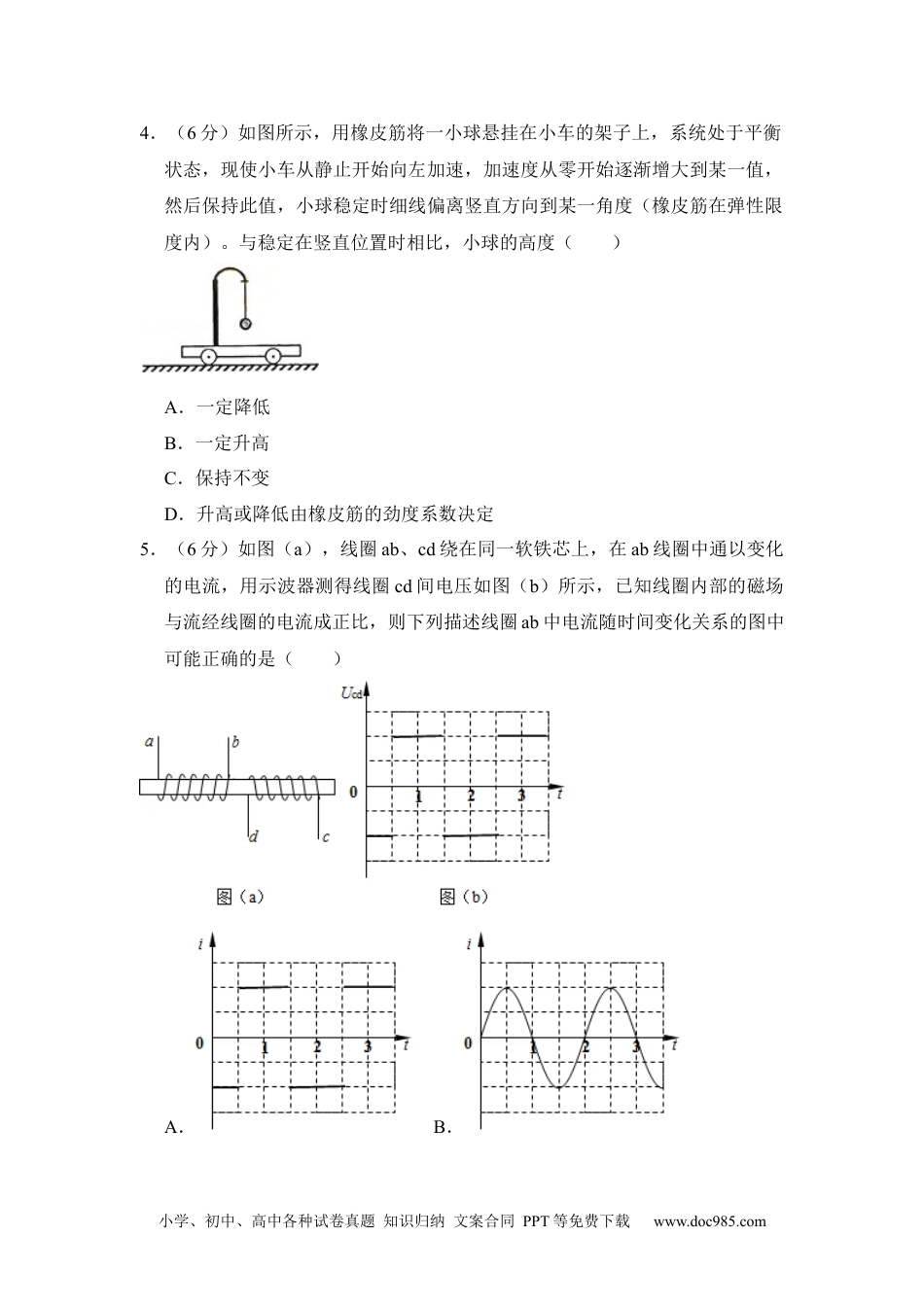 小学、初中、高中各种试卷真题知识归纳文案合同PPT等免费下载www.doc985.com2014年全国统一高考物理试卷(新课标Ⅰ)一、选择题:本题共8小题,每小题6分,在每题给出的四个选项中,第14-18题只有一项符合题目要求,第19-21题有多项符合题目要求。全部选对的得6分,选对但不全的得3分,有选错的得0分。1.(6分)在法拉第时代,下列验证“由磁产生电”设想的实验中,能观察到感应电流的是()A.将绕在磁铁上的线圈与电流表组成一闭合回路,然后观察电流表的变化B.在一通电线圈旁放置一连有电流表的闭合线圈,然后观察电流表的变化C.将一房间内的线圈两端与相邻房间的电流表连接,往线圈中插入条形磁铁后,再到相邻房间去观察电流表的变化D.绕在同一铁环上的两个线圈,分别接电源和电流表,在给线圈通电或断电的瞬间,观察电流表的变化2.(6分)关于通电直导线在匀强磁场中所受的安培力,下列说法正确的是()A.安培力的方向可以不垂直于直导线B.安培力的方向总是垂直于磁场的方向C.安培力的大小与通电导线和磁场方向的夹角无关D.将直导线从中折成直角,安培力的大小一定变为原来的一半3.(6分)如图,MN为铝质薄平板,铝板上方和下方分别有垂直于图平面的匀强磁场(未画出),一带电粒子从紧贴铝板上表面的P点垂直于铝板向上射出,从Q点穿越铝板后到达PQ的中点O.已知粒子穿越铝板时,其动能损失一半,速度方向和电荷量不变,不计重力,铝板上方和下方的磁感应强度大小之比为()A.2B.C.1D.小学、初中、高中各种试卷真题知识归纳文案合同PPT等免费下载www.doc985.com4.(6分)如图所示,用橡皮筋将一小球悬挂在小车的架子上,系统处于平衡状态,现使小车从静止开始向左加速,加速度从零开始逐渐增大到某一值,然后保持此值,小球稳定时细线偏离竖直方向到某一角度(橡皮筋在弹性限度内)。与稳定在竖直位置时相比,小球的高度()A.一定降低B.一定升高C.保持不变D.升高或降低由橡皮筋的劲度系数决定5.(6分)如图(a),线圈ab、cd绕在同一软铁芯上,在ab线圈中通以变化的电流,用示波器测得线圈cd间电压如图(b)所示,已知线圈内部的磁场与流经线圈的电流成正比,则下列描述线圈ab中电流随时间变化关系的图中可能正确的是()A.B.小学、初中、高中各种试卷真题知识归纳文案合同PPT等免费下载www.doc985.comC.D.6.(6分)太阳系各行星几乎在同一平面内沿同一方向绕太阳做圆周运动,当地球恰好运行到某地外行星和太阳之间,且三者几乎排成一条直线的现象,天文学家称为“行星冲日”,据报道,2014年各行星冲日时间分别为:1月6日木星冲日;4月9日火星冲日;5月11日土星冲日;8月29日海王星冲日;10月8日天王星冲日.已知地球及各地外行星绕太阳运动的轨道半径如下表所示,则下列判断正确的是()地球火星木星土星天王星海王星轨道半径(AU)1.01.55.29.51930A.各地外行星每年都会出现冲日现象B.在2015年内一定会出现木星冲日C.天王星相邻两次冲日的时间间隔为土星的一半D.地外行星中,海王星相邻两次冲日的时间间隔最短7.(6分)如图,两个质量均为m的小木块a和b(可视为质点)放在水平圆盘上,a与转轴OO′的距离为L,b与转轴的距离为2L.木块与圆盘的最大静摩擦力为木块所受重力的k倍,重力加速度大小为g.若圆盘从静止开始绕转轴缓慢地加速转动,用ω表示圆盘转动的角速度,下列说法正确的是()A.a、b所受的摩擦力始终相等B.b一定比a先开始滑动小学、初中、高中各种试卷真题知识归纳文案合同PPT等免费下载www.doc985.comC.ω=是b开始滑动的临界角速度D.当ω=时,a所受摩擦力的大小为kmg8.(6分)如图,在正电荷Q的电场中有M、N、P、F四点,M、N、P为直角三角形的三个顶点,F为MN的中点,∠M=30°,M、N、P、F四点处的电势分别用φM、φN、φP、φF表示,已知φM=φN、φP=φF,点电荷Q在M、N、P三点所在平面内,则()A.点电荷Q一定在MP的连线上B.连接PF的线段一定在同一等势面上C.将正试探电荷从P点搬运到N点,电场力做负功D.φP>φM三、非选择题:包括必考题和选考题两部分(一)必考题(共129分)9.(6分)某同学利用图甲所示实验...
