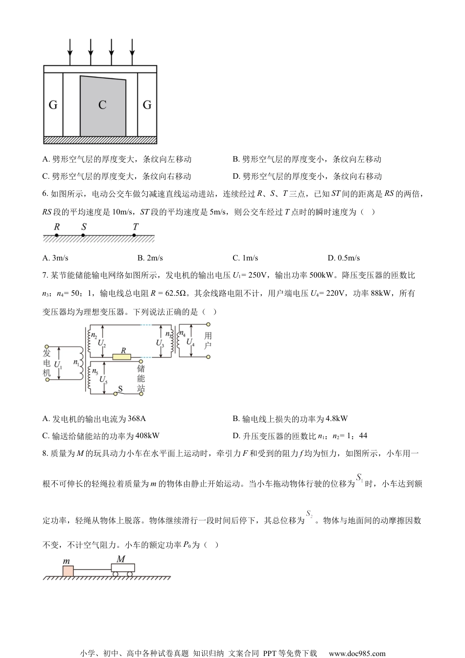 小学、初中、高中各种试卷真题知识归纳文案合同PPT等免费下载www.doc985.com2023年全省普通高中学业水平等级考试物理注意事项:1.答卷前,考生务必将自己的姓名、考生号等填写在答题卡和试卷指定位置。2.回答选择题时,选出每小题答案后,用铅笔把答题卡上对应题目的答案标号涂黑。如需改动,用橡皮擦干净后,再选涂其他答案标号。回答非选择题时,将答案写在答题卡上写在本试卷上无效。3.考试结束后、将本试卷和答题卡一并交回。一、单项选择题:本题共8小题,每小题3分,共24分。每小题只有一个选项符合题目要求。1.“梦天号”实验舱携带世界首套可相互比对的冷原子钟组发射升空,对提升我国导航定位、深空探测等技术具有重要意义。如图所示为某原子钟工作的四能级体系,原子吸收频率为的光子从基态能级I跃迁至激发态能级Ⅱ,然后自发辐射出频率为的光子,跃迁到钟跃迁的上能级2,并在一定条件下可跃迁到钟跃迁的下能级1,实现受激辐射,发出钟激光,最后辐射出频率为的光子回到基态。该原子钟产生的钟激光的频率为()A.B.C.D.2.餐厅暖盘车的储盘装置示意图如图所示,三根完全相同的弹簧等间距竖直悬挂在水平固定圆环上,下端连接托盘。托盘上叠放若干相同的盘子,取走一个盘子,稳定后余下的正好升高补平。已知单个盘子的质量为300g,相邻两盘间距1.0cm,重力加速度大小取10m/s2。弹簧始终在弹性限度内,每根弹簧的劲度系数为()小学、初中、高中各种试卷真题知识归纳文案合同PPT等免费下载www.doc985.comA.10N/mB.100N/mC.200N/mD.300N/m3.牛顿认为物体落地是由于地球对物体的吸引,这种吸引力可能与天体间(如地球与月球)的引力具有相同的性质、且都满足。已知地月之间的距离r大约是地球半径的60倍,地球表面的重力加速度为g,根据牛顿的猜想,月球绕地球公转的周期为()A.B.C.D.4.《天工开物》中记载了古人借助水力使用高转筒车往稻田里引水的场景。引水过程简化如下:两个半径均为R的水轮,以角速度ω匀速转动。水筒在筒车上均匀排布,单位长度上有n个,与水轮间无相对滑动。每个水筒离开水面时装有质量为m的水,其中的60%被输送到高出水面H处灌入稻田。当地的重力加速度为g,则筒车对灌入稻田的水做功的功率为()A.B.C.D.nmgωRH5.如图所示为一种干涉热膨胀仪原理图。G为标准石英环,C为待测柱形样品,C的上表面与上方标准平面石英板之间存在劈形空气层。用单色平行光垂直照射上方石英板,会形成干涉条纹。已知C的膨胀系数小于G的膨胀系数,当温度升高时,下列说法正确的是()小学、初中、高中各种试卷真题知识归纳文案合同PPT等免费下载www.doc985.comA.劈形空气层的厚度变大,条纹向左移动B.劈形空气层的厚度变小,条纹向左移动C.劈形空气层的厚度变大,条纹向右移动D.劈形空气层的厚度变小,条纹向右移动6.如图所示,电动公交车做匀减速直线运动进站,连续经过R、S、T三点,已知ST间的距离是RS的两倍,RS段的平均速度是10m/s,ST段的平均速度是5m/s,则公交车经过T点时的瞬时速度为()A.3m/sB.2m/sC.1m/sD.0.5m/s7.某节能储能输电网络如图所示,发电机的输出电压U1=250V,输出功率500kW。降压变压器的匝数比n3:n4=50:1,输电线总电阻R=62.5Ω。其余线路电阻不计,用户端电压U4=220V,功率88kW,所有变压器均为理想变压器。下列说法正确的是()A.发电机的输出电流为368AB.输电线上损失的功率为4.8kWC.输送给储能站的功率为408kWD.升压变压器的匝数比n1:n2=1:448.质量为M的玩具动力小车在水平面上运动时,牵引力F和受到的阻力f均为恒力,如图所示,小车用一根不可伸长的轻绳拉着质量为m的物体由静止开始运动。当小车拖动物体行驶的位移为时,小车达到额定功率,轻绳从物体上脱落。物体继续滑行一段时间后停下,其总位移为。物体与地面间的动摩擦因数不变,不计空气阻力。小车的额定功率P0为()小学、初中、高中各种试卷真题知识归纳文案合同PPT等免费下载www.doc985.comA.B.C.D.二、多项选择题:本题共4小题,每小题4分,共16分。每小题有多个选项符合题目要求,全部选对得4分,选对但不全的得2分,有选错的得0分。9.一定质量的理想气体,初始温度为,压...