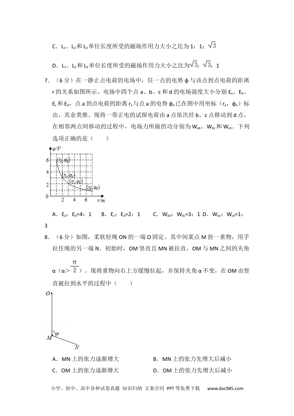 小学、初中、高中各种试卷真题知识归纳文案合同PPT等免费下载www.doc985.com2017年全国统一高考物理试卷(新课标Ⅰ)一、选择题:本大题共8小题,每小题6分.在每小题给出的四个选项中,第1~5题只有一项是符合题目要求,第6~8题有多项符合题目要求.全部选对的得6分,选对但不全的得3分.有选错的得0分.1.(6分)将质量为1.00kg的模型火箭点火升空,50g燃烧的燃气以大小为600m/s的速度从火箭喷口在很短时间内喷出。在燃气喷出后的瞬间,火箭的动量大小为(喷出过程中重力和空气阻力可忽略)()A.30kg•m/sB.5.7×102kg•m/sC.6.0×102kg•m/sD.6.3×102kg•m/s2.(6分)发球机从同一高度向正前方依次水平射出两个速度不同的乒乓球(忽略空气的影响)。速度较大的球越过球网,速度较小的球没有越过球网;其原因是()A.速度较小的球下降相同距离所用的时间较多B.速度较小的球在下降相同距离时在竖直方向上的速度较大C.速度较大的球通过同一水平距离所用的时间较少D.速度较大的球在相同时间间隔内下降的距离较大3.(6分)如图,空间某区域存在匀强电场和匀强磁场,电场方向竖直向上(与纸面平行),磁场方向垂直于纸面向里。三个带正电的微粒a,b,c电荷量相等,质量分别为ma,mb,mc.已知在该区域内,a在纸面内做匀速圆周运动,b在纸面内向右做匀速直线运动,c在纸面内向左做匀速直线运动。下列选项正确的是()A.ma>mb>mcB.mb>ma>mcC.mc>ma>mbD.mc>mb>ma4.(6分)大科学工程“人造太阳”主要是将氘核聚变反应释放的能量用来发小学、初中、高中各种试卷真题知识归纳文案合同PPT等免费下载www.doc985.com电,氘核聚变反应方程是:H+H→He+n,已知H的质量为2.0136u,He的质量为3.0150u,n的质量为1.0087u,1u=931MeV/c2.氘核聚变反应中释放的核能约为()A.3.7MeVB.3.3MeVC.2.7MeVD.0.93MeV5.(6分)扫描隧道显微镜(STM)可用来探测样品表面原子尺寸上的形貌,为了有效隔离外界震动对STM的扰动,在圆底盘周边沿其径向对称地安装若干对紫铜薄板,并施加磁场来快速衰减其微小震动,如图所示,无扰动时,按下列四种方案对紫铜薄板施加恒磁场;出现扰动后,对于紫铜薄板上下及其左右震动的衰减最有效的方案是()A.B.C.D.6.(6分)如图,三根相互平行的固定长直导线L1、L2和L3两两等距,均通有电流I,L1中电流方向与L2中的相同,与L3中的相反。下列说法正确的是()A.L1所受磁场作用力的方向与L2、L3所在平面垂直B.L3所受磁场作用力的方向与L1、L2所在平面垂直小学、初中、高中各种试卷真题知识归纳文案合同PPT等免费下载www.doc985.comC.L1、L2和L3单位长度所受的磁场作用力大小之比为1:1:D.L1、L2和L3单位长度所受的磁场作用力大小之比为::17.(6分)在一静止点电荷的电场中,任一点的电势φ与该点到点电荷的距离r的关系如图所示。电场中四个点a、b、c和d的电场强度大小分别Ea、Eb、Ec和Ed,点a到点电荷的距离ra与点a的电势φa已在图中用坐标(ra,φa)标出,其余类推。现将一带正电的试探电荷由a点依次经b、c点移动到d点,在相邻两点间移动的过程中,电场力所做的功分别为Wab、Wbc和Wcd.下列选项正确的是()A.Ea:Eb=4:1B.Ec:Ed=2:1C.Wab:Wbc=3:1D.Wbc:Wcd=1:38.(6分)如图,柔软轻绳ON的一端O固定,其中间某点M拴一重物,用手拉住绳的另一端N.初始时,OM竖直且MN被拉直,OM与MN之间的夹角α(α>)。现将重物向右上方缓慢拉起,并保持夹角α不变,在OM由竖直被拉到水平的过程中()A.MN上的张力逐渐增大B.MN上的张力先增大后减小C.OM上的张力逐渐增大D.OM上的张力先增大后减小小学、初中、高中各种试卷真题知识归纳文案合同PPT等免费下载www.doc985.com二、非选择题:本卷包括必考题和选考题两部分.第9~32题为必考题,每个试题考生都必须作答.第33~38题为选考题,考生根据要求作答.(一)必考题(共129分)9.(5分)某探究小组为了研究小车在桌面上的直线运动,用自制“滴水计时器”计量时间。实验前,将该计时器固定在小车旁,如图(a)所示。实验时,保持桌面水平,用手轻推一下小车。在小车运动过...