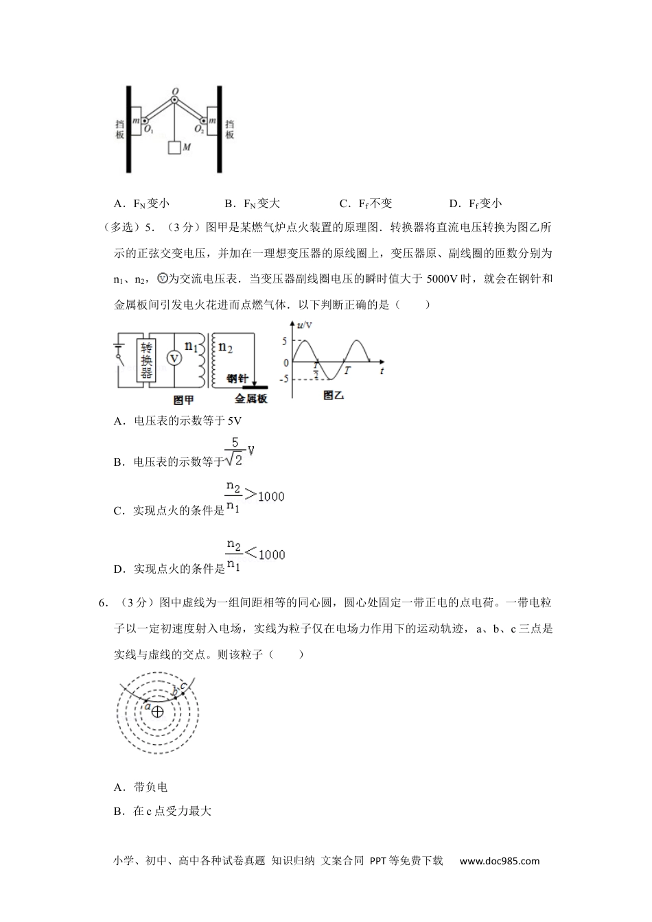 小学、初中、高中各种试卷真题知识归纳文案合同PPT等免费下载www.doc985.com2012年山东省高考物理试卷一、选择题(共7小题,每小题3分,满分21分)(多选)1.(3分)以下叙述正确的是()A.法拉第发现了电磁感应现象B.惯性是物体的固有属性,速度大的物体惯性一定大C.牛顿最早通过理想斜面实验得出力不是维持物体运动的原因D.感应电流遵从楞次定律所描述的方向,这是能量守恒定律的必然结果2.(3分)2011年11月3日,“神舟八号”飞船与“天宫一号”目标飞行器成功实施了首次交会对接.任务完成后“天宫一号”经变轨升到更高的轨道,等待与“神舟九号”交会对接.变轨前和变轨完成后“天宫一号”的运行轨道均可视为圆轨道,对应的轨道半径分别为R1、R2,线速度大小分别为v1、v2.则等于()A.B.C.D.(多选)3.(3分)将地面上静止的货物竖直向上吊起,货物由地面运动至最高点的过程中,vt﹣图象如图所示.以下判断正确的是()A.前3s内货物处于超重状态B.最后2s内货物只受重力作用C.前3s内与最后2s内货物的平均速度相同D.第3s末至第5s末的过程中,货物的机械能守恒(多选)4.(3分)如图所示,两相同轻质硬杆OO1、OO2可绕其两端垂直纸面的水平轴O、O1、O2转动,在O点悬挂一重物M,将两个相同木块m紧压在竖直挡板上,此时整个系统保持静止.Ff表示木块与挡板间摩擦力的大小,FN表示木块与挡板间正压力的大小.若挡板间的距离稍许增大后,系统仍静止且O1、O2始终等高,则()小学、初中、高中各种试卷真题知识归纳文案合同PPT等免费下载www.doc985.comA.FN变小B.FN变大C.Ff不变D.Ff变小(多选)5.(3分)图甲是某燃气炉点火装置的原理图.转换器将直流电压转换为图乙所示的正弦交变电压,并加在一理想变压器的原线圈上,变压器原、副线圈的匝数分别为n1、n2,为交流电压表.当变压器副线圈电压的瞬时值大于5000V时,就会在钢针和金属板间引发电火花进而点燃气体.以下判断正确的是()A.电压表的示数等于5VB.电压表的示数等于C.实现点火的条件是D.实现点火的条件是6.(3分)图中虚线为一组间距相等的同心圆,圆心处固定一带正电的点电荷。一带电粒子以一定初速度射入电场,实线为粒子仅在电场力作用下的运动轨迹,a、b、c三点是实线与虚线的交点。则该粒子()A.带负电B.在c点受力最大小学、初中、高中各种试卷真题知识归纳文案合同PPT等免费下载www.doc985.comC.在b点的电势能小于在c点的电势能D.由a点到b点的动能变化大于由b点到c点的动能变化(多选)7.(3分)如图所示,相距为L的两条足够长的光滑平行金属导轨与水平面的夹角为θ,上端接有定值电阻R,匀强磁场垂直于导轨平面,磁感应强度为B.将质量为m的导体棒由静止释放,当速度达到v时开始匀速运动,此时对导体棒施加一平行于导轨向下的拉力,并保持拉力的功率恒为P,导体棒最终以2v的速度匀速运动。导体棒始终与导轨垂直且接触良好,不计导轨和导体棒的电阻,重力加速度为g。下列选项正确的是()A.拉力的功率P=2mgvsinθB.拉力的功率P=3mgvsinθC.当导体棒速度达到时加速度大小为D.在速度达到2v以后匀速运动的过程中,R上产生的焦耳热等于拉力所做的功二、解答题(共3小题,满分46分)8.(13分)(1)某同学利用图甲所示的实验装置,探究物块在水平桌面上的运动规律.物块在重物的牵引下开始运动,重物落地后,物块再运动一段距离停在桌面上(尚未到达滑轮处).从纸带上便于测量的点开始,每5个点取1个计数点,相邻计数点间的距离如图乙所示.打点计时器电源的频率为50Hz.①通过分析纸带数据,可判断物块在两相邻计数点和之间某时刻开始减速②计数点5对应的速度大小为m/s,计数点6对应的速度大小为m/s.(保留三位有效数字)小学、初中、高中各种试卷真题知识归纳文案合同PPT等免费下载www.doc985.com③物块减速运动过程中加速度的大小为a=m/s2,若用来计算物块与桌面间的动摩擦因数(g为重力加速度),则计算结果比动摩擦因数的真实值(填“偏大”或“偏小”).(2)在测量金属丝电阻率的实验中,可供选用的器材如下:待测金属丝:Rx(阻值约4Ω,额定电流约0.5A);电压表:V(...