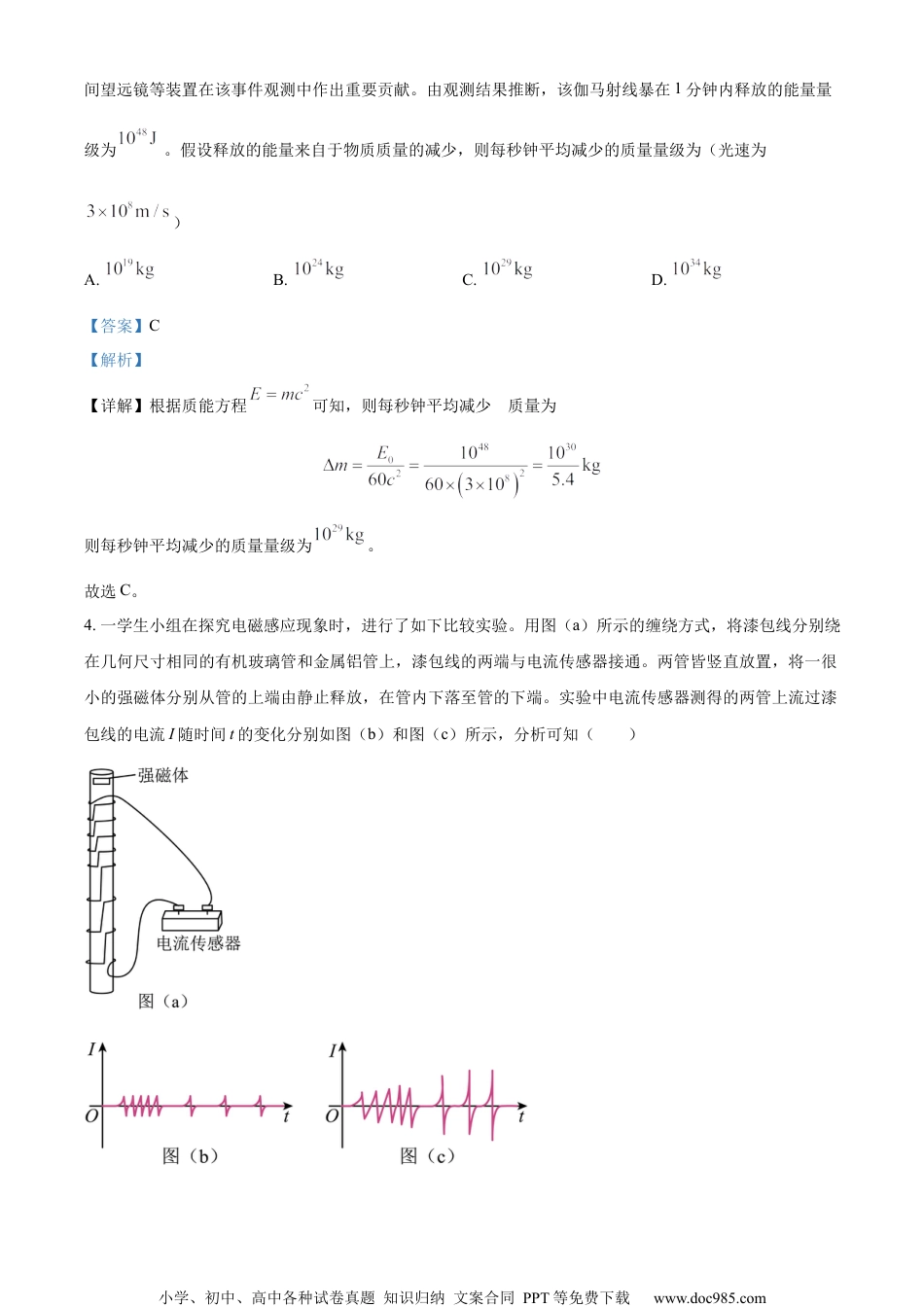 小学、初中、高中各种试卷真题知识归纳文案合同PPT等免费下载www.doc985.com2023年普通高等学校招生全国统一考试(全国乙卷)理科综合(物理部分)二、选择题:本题共8小题,每小题6分,共48分。在每小题给出的四个选项中,第14~18题只有一项符合题目要求,第19~21题有多项符合题目要求、全部选对的得6分,选对但不全的得3分,有选错的得0分。1.一同学将排球自O点垫起,排球竖直向上运动,随后下落回到O点。设排球在运动过程中所受空气阻力大小和速度大小成正比。则该排球()A.上升时间等于下落时间B.被垫起后瞬间的速度最大C.达到最高点时加速度为零D.下落过程中做匀加速运动【答案】B【解析】【详解】A.上升过程和下降过程的位移大小相同,上升过程的末状态和下降过程的初状态速度均为零。对排球受力分析,上升过程的重力和阻力方向相同,下降过程中重力和阻力方向相反,根据牛顿第二定律可知,上升过程中任意位置的加速度比下降过程中对应位置的加速度大,则上升过程的平均加速度较大。由位移与时间关系可知,上升时间比下落时间短,A错误;B.上升过程排球做减速运动,下降过程排球做加速运动。在整个过程中空气阻力一直做负功,小球机械能一直在减小,下降过程中的最低点的速度小于上升过程的最低点的速度,故排球被垫起时的速度最大,B正确;C.达到最高点速度为零,空气阻力为零,此刻排球重力提供加速度不为零,C错误;D.下落过程中,排球速度在变,所受空气阻力在变,故排球所受的合外力在变化,排球在下落过程中做变加速运动,D错误。故选B。2.小车在水平地面上沿轨道从左向右运动,动能一直增加。如果用带箭头的线段表示小车在轨道上相应位置处所受合力,下列四幅图可能正确的是()A.B.C.D.【答案】D【解析】【详解】AB.小车做曲线运动,所受合外力指向曲线的凹侧,故AB错误;CD.小车沿轨道从左向右运动,动能一直增加,故合外力与运动方向夹角为锐角,C错误,D正确。故选D。3.2022年10月,全球众多天文设施观测到迄今最亮伽马射线暴,其中我国的“慧眼”卫星、“极目”空小学、初中、高中各种试卷真题知识归纳文案合同PPT等免费下载www.doc985.com间望远镜等装置在该事件观测中作出重要贡献。由观测结果推断,该伽马射线暴在1分钟内释放的能量量级为。假设释放的能量来自于物质质量的减少,则每秒钟平均减少的质量量级为(光速为)A.B.C.D.【答案】C【解析】【详解】根据质能方程可知,则每秒钟平均减少的质量为则每秒钟平均减少的质量量级为。故选C。4.一学生小组在探究电磁感应现象时,进行了如下比较实验。用图(a)所示的缠绕方式,将漆包线分别绕在几何尺寸相同的有机玻璃管和金属铝管上,漆包线的两端与电流传感器接通。两管皆竖直放置,将一很小的强磁体分别从管的上端由静止释放,在管内下落至管的下端。实验中电流传感器测得的两管上流过漆包线的电流I随时间t的变化分别如图(b)和图(c)所示,分析可知()小学、初中、高中各种试卷真题知识归纳文案合同PPT等免费下载www.doc985.comA.图(c)是用玻璃管获得的图像B.在铝管中下落,小磁体做匀变速运动C.在玻璃管中下落,小磁体受到的电磁阻力始终保持不变D.用铝管时测得的电流第一个峰到最后一个峰的时间间隔比用玻璃管时的短【答案】A【解析】【详解】A.强磁体在铝管中运动,铝管会形成涡流,玻璃是绝缘体故强磁体在玻璃管中运动,玻璃管不会形成涡流。强磁体在铝管中加速后很快达到平衡状态,做匀速直线运动,而玻璃管中的磁体则一直做加速运动,故由图像可知图(c)的脉冲电流峰值不断增大,说明强磁体的速度在增大,与玻璃管中磁体的运动情况相符,A正确;B.在铝管中下落,脉冲电流的峰值一样,磁通量的变化率相同,故小磁体做匀速运动,B错误;C.在玻璃管中下落,玻璃管为绝缘体,线圈的脉冲电流峰值增大,电流不断在变化,故小磁体受到的电磁阻力在不断变化,C错误;D.强磁体分别从管的上端由静止释放,在铝管中,磁体在线圈间做匀速运动,玻璃管中磁体在线圈间做加速运动,故用铝管时测得的电流第一个峰到最后一个峰的时间间隔比用玻璃管时的长,D错误。故选A。5.如图,一磁感应强度大小为...