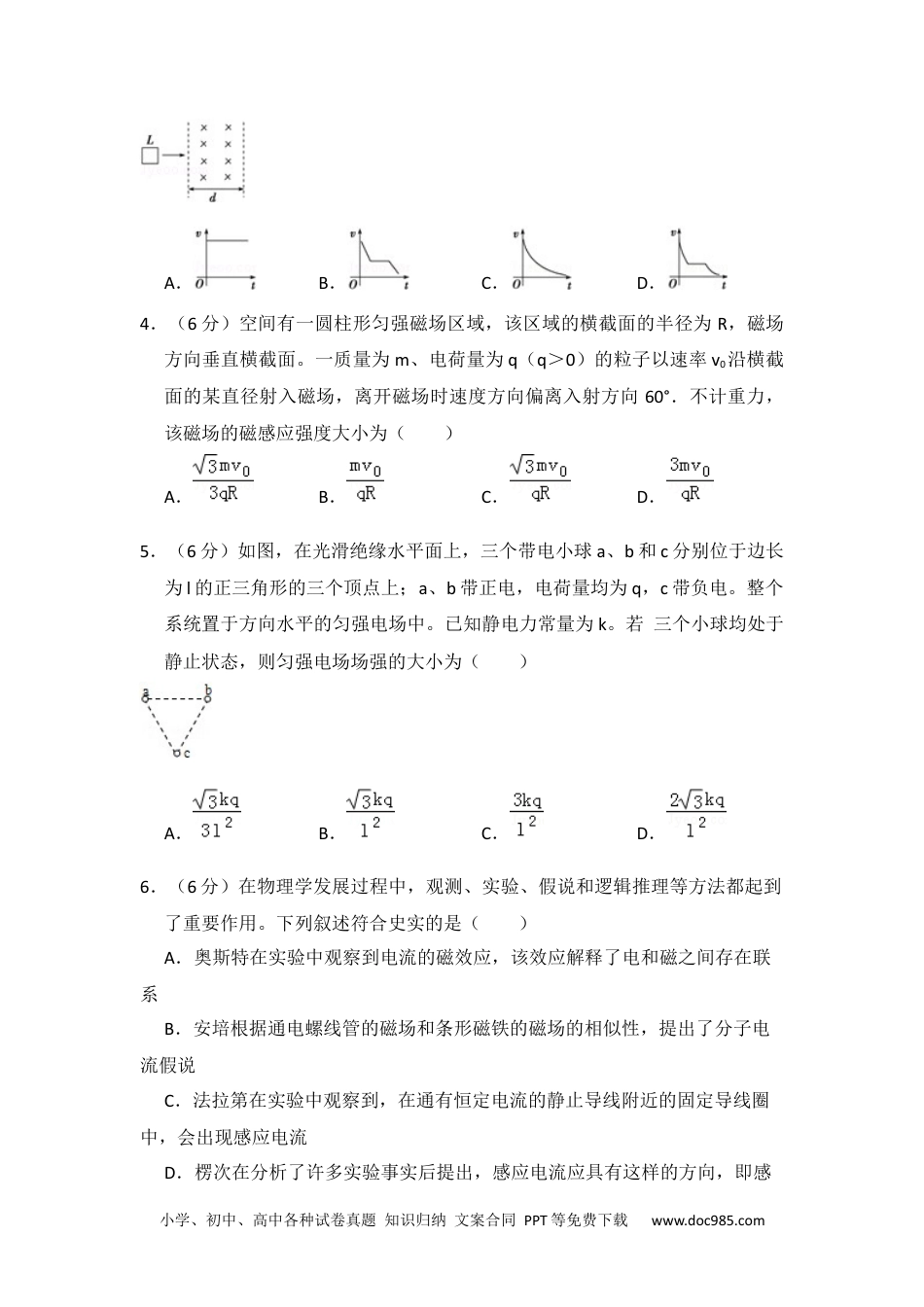 小学、初中、高中各种试卷真题知识归纳文案合同PPT等免费下载www.doc985.com2013年全国统一高考物理试卷(新课标Ⅱ)一、选择题:本题共8小题,每小题6分.在每小题给出的四个选项中,第1~5题只有一项符合题目要求,第6~8题有多项符合题目要求.全部选对的得6分,选对但不全的得3分,有选错的得0分.1.(6分)一物块静止在粗糙的水平桌面上。从某时刻开始,物块受到一方向不变的水平拉力作用。假设物块与桌面间的最大静摩擦力等于滑动摩擦力。以a表示物块的加速度大小,F表示水平拉力的大小。能正确描述F与a之间的关系的图象是()A.B.C.D.2.(6分)如图,在固定斜面上的一物块受到一外力F的作用,F平行于斜面向上。若要物块在斜面上保持静止,F的取值应有一定范围,已知其最大值和最小值分别为F1和F2.由此可求出()A.物块的质量B.斜面的倾角C.物块与斜面间的最大静摩擦力D.物块对斜面的正压力3.(6分)如图,在光滑水平桌面上有一边长为L、电阻为R的正方形导线框;在导线框右侧有一宽度为d(d>L)的条形匀强磁场区域,磁场的边界与导线框的一边平行,磁场方向竖直向下。导线框以某一初速度向右运动。t=0时导线框的右边恰与磁场的左边界重合,随后导线框进入并通过磁场区域。下列vt﹣图象中,可能正确描述上述过程的是()小学、初中、高中各种试卷真题知识归纳文案合同PPT等免费下载www.doc985.comA.B.C.D.4.(6分)空间有一圆柱形匀强磁场区域,该区域的横截面的半径为R,磁场方向垂直横截面。一质量为m、电荷量为q(q>0)的粒子以速率v0沿横截面的某直径射入磁场,离开磁场时速度方向偏离入射方向60°.不计重力,该磁场的磁感应强度大小为()A.B.C.D.5.(6分)如图,在光滑绝缘水平面上,三个带电小球a、b和c分别位于边长为l的正三角形的三个顶点上;a、b带正电,电荷量均为q,c带负电。整个系统置于方向水平的匀强电场中。已知静电力常量为k。若三个小球均处于静止状态,则匀强电场场强的大小为()A.B.C.D.6.(6分)在物理学发展过程中,观测、实验、假说和逻辑推理等方法都起到了重要作用。下列叙述符合史实的是()A.奥斯特在实验中观察到电流的磁效应,该效应解释了电和磁之间存在联系B.安培根据通电螺线管的磁场和条形磁铁的磁场的相似性,提出了分子电流假说C.法拉第在实验中观察到,在通有恒定电流的静止导线附近的固定导线圈中,会出现感应电流D.楞次在分析了许多实验事实后提出,感应电流应具有这样的方向,即感小学、初中、高中各种试卷真题知识归纳文案合同PPT等免费下载www.doc985.com应电流的磁场总要阻碍引起感应电流的磁通量的变化7.(6分)目前,在地球周围有许多人造地球卫星绕着它运转,其中一些卫星的轨道可近似为圆,且轨道半径逐渐变小。若卫星在轨道半径逐渐变小的过程中,只受到地球引力和稀薄气体阻力的作用,则下列判断正确的是()A.卫星的动能逐渐减小B.由于地球引力做正功,引力势能一定减小C.由于气体阻力做负功,地球引力做正功,机械能保持不变D.卫星克服气体阻力做的功小于引力势能的减小量8.(6分)公路急转弯处通常是交通事故多发地带.某公路急转弯处是一圆弧,当汽车行驶的速率为vc时,汽车恰好没有向公路内外两侧滑动的趋势,则在该弯道处,()A.路面外侧高内侧低B.车速只要低于vc,车辆便会向内侧滑动C.车速虽然高于vc,但只要不超出某一高度限度,车辆便不会向外侧滑动D.当路面结冰时,与未结冰时相比,vc的值变小二、解答题9.(8分)某同学利用如图1所示的装置对轻质弹簧的弹性势能进行探究:一轻质弹簧放置在光滑水平桌面上,弹簧左端固定,右端与一小球接触而不固连;弹簧处于原长时,小球恰好在桌面边缘.向左推小球,使弹簧压缩一段距离后由静止释放,小球离开桌面后落到水平地面.通过测量和计算,可求得弹簧被压缩后的弹性势能.回答下列问题:小学、初中、高中各种试卷真题知识归纳文案合同PPT等免费下载www.doc985.com(1)本实验中可认为,弹簧被压缩后的弹性势能Ep与小球抛出时的动能Ek相等已知重力加速度大小为g.为求得Ek,至少需要测量下列物理量中的(填正确答案序...