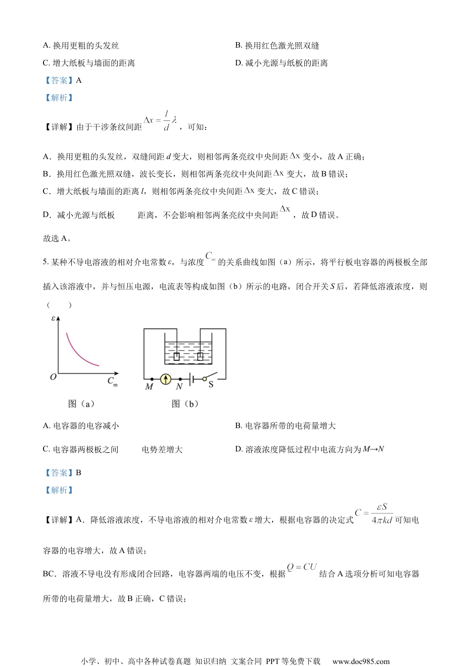 小学、初中、高中各种试卷真题知识归纳文案合同PPT等免费下载www.doc985.com2024年辽宁省普通高等学校招生考试一、选择题:本题共10小题,共46分。在每小题给出的四个选项中,第1~7题只有一项符合题目要求,每小题4分;第8~10题有多项符合题目要求,每小题6分,全部选对的得6分,选对但不全的得3分,有选错的得0分。1.长征五号遥八运载火箭托举嫦娥六号探测器进入地月转移轨道,火箭升空过程中,以下描述的物理量属于矢量的是()A.质量B.速率C.动量D.动能【答案】C【解析】【详解】矢量是既有大小,又有方向的物理量,所以动量是矢量,而质量、速率、动能只有大小没有方向,是标量。故选C。2.当篮球在指尖上绕轴转动时,球面上P、Q两点做圆周运动的()A.半径相等B.线速度大小相等C.向心加速度大小相等D.角速度大小相等【答案】D【解析】【详解】D.由题意可知,球面上P、Q两点转动时属于同轴转动,故角速度大小相等,故D正确;A.由图可知,球面上P、Q两点做圆周运动的半径的关系为故A错误;B.根据可知,球面上P、Q两点做圆周运动的线速度的关系为故B错误;小学、初中、高中各种试卷真题知识归纳文案合同PPT等免费下载www.doc985.comC.根据可知,球面上P、Q两点做圆周运动的向心加速度的关系为故C错误。故选D。3.利用砚台将墨条磨成墨汁,墨条速度方向水平向左时,()A.砚台对墨条的摩擦力方向水平向左B.桌面对砚台的摩擦力方向水平向左C.桌面和墨条对砚台的摩擦力是一对平衡力D.桌面对砚台的支持力与墨条对砚台的压力是一对平衡力【答案】C【解析】【详解】A.当墨条速度方向水平向左时,墨条相对于砚台向左运动,故砚台对墨条的摩擦力方向水平向右,故A错误;B.根据牛顿第三定律,墨条对砚台的摩擦力方向水平向左,由于砚台处于静止状态,故桌面对砚台的摩擦力方向水平向右,故B错误;C.由于砚台处于静止状态,水平方向桌面和墨条对砚台的摩擦力是一对平衡力,故C正确;D.桌面对砚台的支持力大小等于砚台的重力加上墨条对其的压力,故桌面对砚台的支持力大于墨条对砚台的压力,故D错误。故选C。4.某同学自制双缝干涉实验装置,在纸板上割出一条窄缝,于窄缝中央沿缝方向固定一根拉直的头发丝形成双缝,将该纸板与墙面平行放置,如图所示,用绿色激光照双缝,能在墙面上观察到干涉条纹,下列说法可以使相邻两条亮纹中央间距变小的是()小学、初中、高中各种试卷真题知识归纳文案合同PPT等免费下载www.doc985.comA.换用更粗的头发丝B.换用红色激光照双缝C.增大纸板与墙面的距离D.减小光源与纸板的距离【答案】A【解析】【详解】由于干涉条纹间距,可知:A.换用更粗的头发丝,双缝间距d变大,则相邻两条亮纹中央间距变小,故A正确;B.换用红色激光照双缝,波长变长,则相邻两条亮纹中央间距变大,故B错误;C.增大纸板与墙面的距离l,则相邻两条亮纹中央间距变大,故C错误;D.减小光源与纸板的距离,不会影响相邻两条亮纹中央间距,故D错误。故选A。5.某种不导电溶液的相对介电常数ε,与浓度的关系曲线如图(a)所示,将平行板电容器的两极板全部插入该溶液中,并与恒压电源,电流表等构成如图(b)所示的电路,闭合开关S后,若降低溶液浓度,则()A.电容器的电容减小B.电容器所带的电荷量增大C.电容器两极板之间的电势差增大D.溶液浓度降低过程中电流方向为M→N【答案】B【解析】【详解】A.降低溶液浓度,不导电溶液的相对介电常数ε增大,根据电容器的决定式可知电容器的电容增大,故A错误;BC.溶液不导电没有形成闭合回路,电容器两端的电压不变,根据结合A选项分析可知电容器所带的电荷量增大,故B正确,C错误;小学、初中、高中各种试卷真题知识归纳文案合同PPT等免费下载www.doc985.comD.根据B选项分析可知电容器所带的电荷量增大,则给电容器充电,结合题图可知电路中电流方向为,故D错误。故选B。6.在水平匀强电场中,一带电小球仅在重力和电场力作用下于竖直纸面内运动,如图,若小球的初速度方向沿虚线,则其运动轨迹为直线,若小球的初速度方向垂直于虚线,则其从O点出发运动到O点等高处的过程中()A.动能减小,电势能增大B.动能增大,电势能增大C.动...