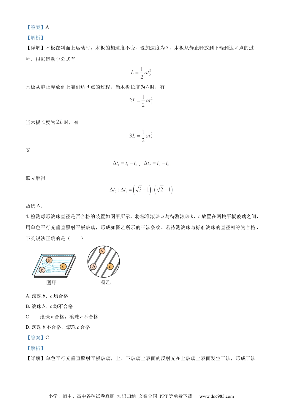 小学、初中、高中各种试卷真题知识归纳文案合同PPT等免费下载www.doc985.com2024年全省普通高中学业水平等级考试物理注意事项:1.答卷前,考生务必将自己的姓名、考生号等填写在答题卡和试卷指定位置。2.回答选择题时,选出每小题答案后,用铅笔把答题卡上对应题目的答案标号涂黑。如需改动,用橡皮擦干净后,再选涂其他答案标号。回答非选择题时,将答案写在答题卡上。写在本试卷上无效。3.考试结束后,将本试卷和答题卡一并交回。一、单项选择题:本题共8小题,每小题3分,共24分。每小题只有一个选项符合题目要求。1.2024年是中国航天大年,神舟十八号、嫦娥六号等已陆续飞天,部分航天器装载了具有抗干扰性强的核电池。已知衰变为的半衰期约为29年;衰变为的半衰期约87年。现用相同数目的和各做一块核电池,下列说法正确的是()A.衰变为时产生α粒子B.衰变为时产生β粒子C.50年后,剩余的数目大于的数目D.87年后,剩余的数目小于的数目【答案】D【解析】【详解】A.根据质量数守恒和电荷数守恒可知衰变为时产生电子,即β粒子,故A错误;B.根据质量数守恒和电荷数守恒可知衰变为时产生,即α粒子,故B错误;CD.根据题意可知的半衰期大于的半衰期,现用相同数目的和各做一块核电池,经过相同的时间,经过的半衰期的次数多,所以数目小于的数目,故D正确,C错误。故选D。小学、初中、高中各种试卷真题知识归纳文案合同PPT等免费下载www.doc985.com2.如图所示,国产人形机器人“天工”能平稳通过斜坡。若它可以在倾角不大于30°的斜坡上稳定地站立和行走,且最大静摩擦力等于滑动摩擦力,则它的脚和斜面间的动摩擦因数不能小于()A.B.C.D.【答案】B【解析】【详解】根据题意可知机器人“天工”它可以在倾角不大于30°的斜坡上稳定地站立和行走,对“天工”分析有可得故选B。3.如图所示,固定的光滑斜面上有一木板,其下端与斜面上A点距离为L。木板由静止释放,若木板长度L,通过A点的时间间隔为;若木板长度为2L,通过A点的时间间隔为。为()A.B.C.D.小学、初中、高中各种试卷真题知识归纳文案合同PPT等免费下载www.doc985.com【答案】A【解析】【详解】木板在斜面上运动时,木板的加速度不变,设加速度为,木板从静止释放到下端到达A点的过程,根据运动学公式有木板从静止释放到上端到达A点的过程,当木板长度为L时,有当木板长度为时,有又,联立解得故选A。4.检测球形滚珠直径是否合格的装置如图甲所示,将标准滚珠a与待测滚珠b、c放置在两块平板玻璃之间,用单色平行光垂直照射平板玻璃,形成如图乙所示的干涉条纹。若待测滚珠与标准滚珠的直径相等为合格,下列说法正确的是()A.滚珠b、c均合格B.滚珠b、c均不合格C.滚珠b合格,滚珠c不合格D.滚珠b不合格,滚珠c合格【答案】C【解析】【详解】单色平行光垂直照射平板玻璃,上、下玻璃上表面的反射光在上玻璃上表面发生干涉,形成干涉小学、初中、高中各种试卷真题知识归纳文案合同PPT等免费下载www.doc985.com条纹,光程差为两块玻璃距离的两倍,根据光的干涉知识可知,同一条干涉条纹位置处光的波程差相等,即滚珠a的直径与滚珠b的直径相等,即滚珠b合格,不同的干涉条纹位置处光的波程差不同,则滚珠a的直径与滚珠c的直径不相等,即滚珠c不合格。故选C。5.“鹊桥二号”中继星环绕月球运行,其24小时椭圆轨道的半长轴为a。已知地球同步卫星的轨道半径为r,则月球与地球质量之比可表示为()A.B.C.D.【答案】D【解析】【详解】“鹊桥二号”中继星在24小时椭圆轨道运行时,根据开普勒第三定律同理,对地球的同步卫星根据开普勒第三定律又开普勒常量与中心天体的质量成正比,所以联立可得故选D。6.一定质量理想气体经历如图所示的循环过程,a→b过程是等压过程,b→c过程中气体与外界无热量交换,c→a过程是等温过程。下列说法正确的是()A.a→b过程,气体从外界吸收的热量全部用于对外做功小学、初中、高中各种试卷真题知识归纳文案合同PPT等免费下载www.doc985.comB.b→c过程,气体对外做功,内能增加C.a→b→c过程,气体从外界吸收的热量全部用于对外做功D.a→b过程,气体从外界吸收的热量等于c→a过程放出的热量【答...