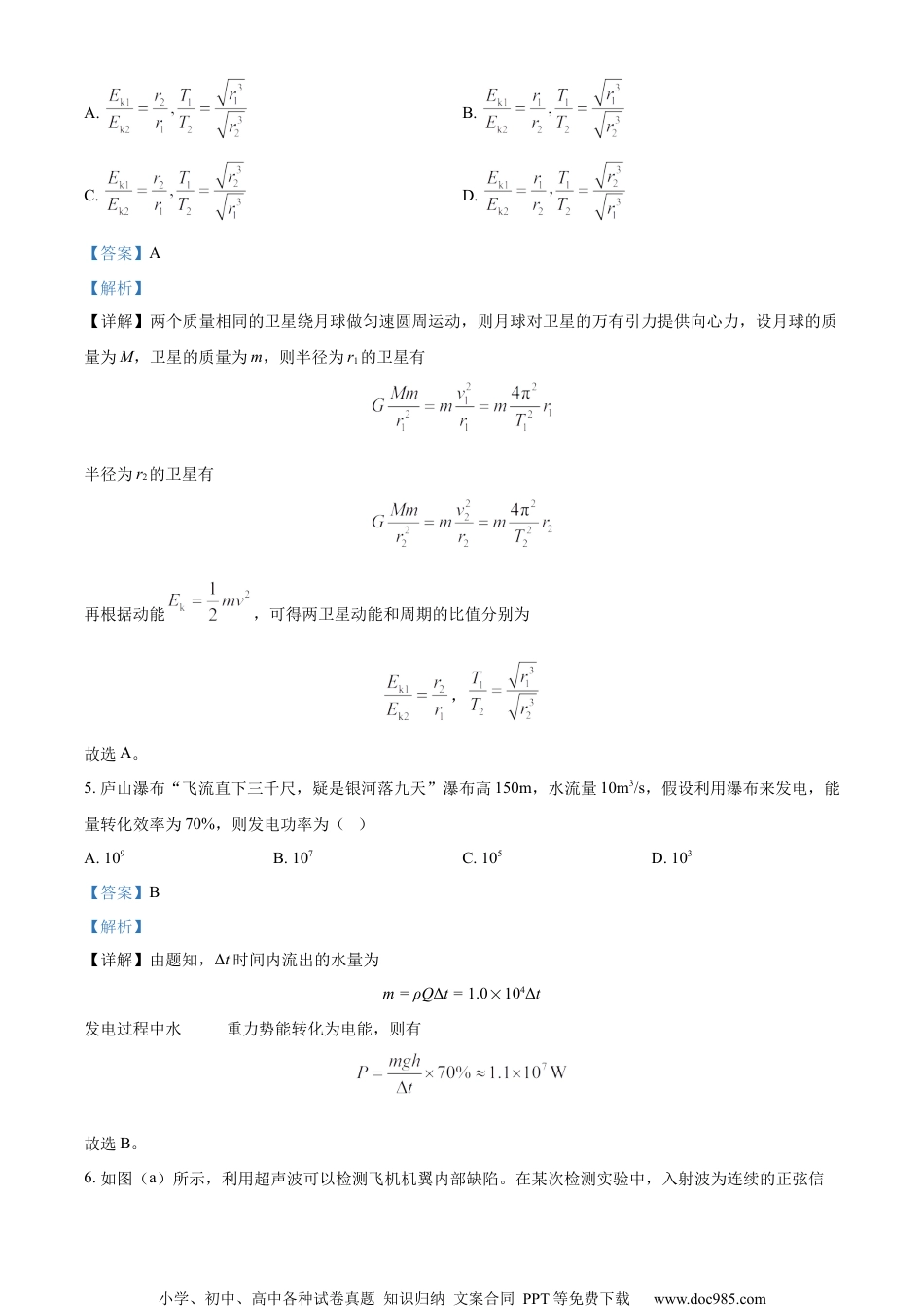 小学、初中、高中各种试卷真题知识归纳文案合同PPT等免费下载www.doc985.com2024年普通高等学校招生全国统一考试物理(江西卷)注意事项:1.答卷前,考生务必将自己的姓名、考生号等填写在答题卡和试卷指定位置。2.回答选择题时,选出每小题答案后,用铅笔把答题卡上对应题目的答案标号涂黑。如需改动,用橡皮擦干净后,再选涂其他答案标号。回答非选择题时,将答案写在答题卡上。写在本试卷上无效。3.考试结束后,将本试卷和答题卡一并交回。一、选择题:本题共10小题,共46分。在每小题给出的四个选项中,第1~7题只有一项符合题目要求,每小题4分;第8~10题有多项符合题目要求,每小题6分,全部选对的得6分,选对但不全的得3分,有选错的得0分。1.极板间一蜡烛火焰带有正离子、电子以及其他的带电粒子,两极板电压保持不变,当电极板距离减小时,电场强度如何变?电子受力方向?()A.电场强度增大,方向向左B.电场强度增大,方向向右C.电场强度减小,方向向左D.电场强度减小,方向向右【答案】B【解析】【详解】由题知,两极板电压保持不变,则根据电势差和电场强度的关系有当电极板距离减小时,电场强度E增大,再结合题图可知极板间的电场线水平向左,则可知电子受到的电场力方向向右。故选B。2.近年来,江西省科学家发明硅衬底氮化镓基系列发光二极管,开创了国际上第三条技术路线。某小学、初中、高中各种试卷真题知识归纳文案合同PPT等免费下载www.doc985.com氮化镓基材料的简化能级如图所示,若能级差为(约),普朗克常量,则发光频率约为()A.B.C.D.【答案】C【解析】【详解】根据题意可知,辐射出的光子能量,由光子的能量得故选C。3.某物体位置随时间的关系为x=1+2t+3t2,则关于其速度与1s内的位移大小,下列说法正确的是()A.速度是刻画物体位置变化快慢的物理量,1s内的位移大小为6mB.速度是刻画物体位移变化快慢的物理量,1s内的位移大小为6mC.速度是刻画物体位置变化快慢的物理量,1s内的位移大小为5mD.速度是刻画物体位移变化快慢的物理量,1s内的位移大小为5m【答案】C【解析】【详解】根据速度的定义式表明,速度等于位移与时间的比值。位移是物体在一段时间内从一个位置到另一个位置的位置变化量,而时间是这段时间的长度。这个定义强调了速度不仅描述了物体运动的快慢,还描述了物体运动的方向。因此,速度是刻画物体位置变化快慢的物理量。再根据物体位置随时间的关系x=1+2t+3t2,可知开始时物体的位置x0=1m,1s时物体的位置x1=6m,则1s内物体的位移为Δx=x1-x0=5m故选C。4.两个质量相同的卫星绕月球做匀速圆周运动,半径分别为、,则动能和周期的比值为()小学、初中、高中各种试卷真题知识归纳文案合同PPT等免费下载www.doc985.comA.B.C.D.【答案】A【解析】【详解】两个质量相同的卫星绕月球做匀速圆周运动,则月球对卫星的万有引力提供向心力,设月球的质量为M,卫星的质量为m,则半径为r1的卫星有半径为r2的卫星有再根据动能,可得两卫星动能和周期的比值分别为,故选A。5.庐山瀑布“飞流直下三千尺,疑是银河落九天”瀑布高150m,水流量10m3/s,假设利用瀑布来发电,能量转化效率为70%,则发电功率为()A.109B.107C.105D.103【答案】B【解析】【详解】由题知,Δt时间内流出的水量为m=ρQΔt=1.0×104Δt发电过程中水的重力势能转化为电能,则有故选B。6.如图(a)所示,利用超声波可以检测飞机机翼内部缺陷。在某次检测实验中,入射波为连续的正弦信小学、初中、高中各种试卷真题知识归纳文案合同PPT等免费下载www.doc985.com号,探头先后探测到机翼表面和缺陷表面的反射信号,分别如图(b)、(c)所示。已知超声波在机翼材料中的波速为。关于这两个反射信号在探头处的叠加效果和缺陷深度d,下列选项正确的是()A.振动减弱;B.振动加强;C.振动减弱;D.振动加强;【答案】A【解析】【详解】根据反射信号图像可知,超声波的传播周期为又波速v=6300m/s,则超声波在机翼材料中的波长结合题图可知,两个反射信号传播到探头处的时间差为故两个反射信号的路程差解得两个反射信号在探头处振动减弱,A正确。故选A。7.石墨烯是一种由碳原子组成的单层...