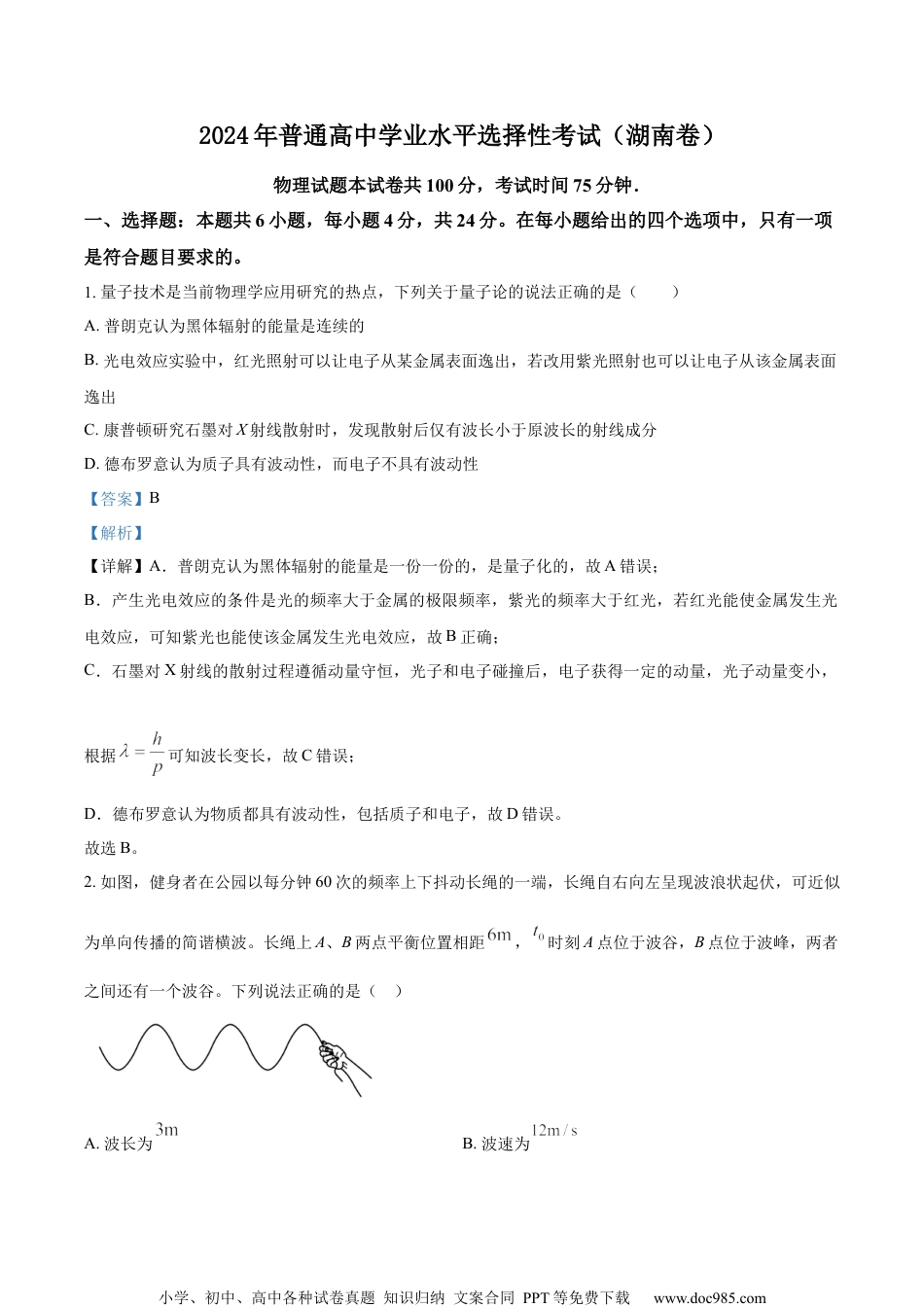 小学、初中、高中各种试卷真题知识归纳文案合同PPT等免费下载www.doc985.com2024年普通高中学业水平选择性考试(湖南卷)物理试题本试卷共100分,考试时间75分钟.一、选择题:本题共6小题,每小题4分,共24分。在每小题给出的四个选项中,只有一项是符合题目要求的。1.量子技术是当前物理学应用研究的热点,下列关于量子论的说法正确的是()A.普朗克认为黑体辐射的能量是连续的B.光电效应实验中,红光照射可以让电子从某金属表面逸出,若改用紫光照射也可以让电子从该金属表面逸出C.康普顿研究石墨对X射线散射时,发现散射后仅有波长小于原波长的射线成分D.德布罗意认为质子具有波动性,而电子不具有波动性【答案】B【解析】【详解】A.普朗克认为黑体辐射的能量是一份一份的,是量子化的,故A错误;B.产生光电效应的条件是光的频率大于金属的极限频率,紫光的频率大于红光,若红光能使金属发生光电效应,可知紫光也能使该金属发生光电效应,故B正确;C.石墨对X射线的散射过程遵循动量守恒,光子和电子碰撞后,电子获得一定的动量,光子动量变小,根据可知波长变长,故C错误;D.德布罗意认为物质都具有波动性,包括质子和电子,故D错误。故选B。2.如图,健身者在公园以每分钟60次的频率上下抖动长绳的一端,长绳自右向左呈现波浪状起伏,可近似为单向传播的简谐横波。长绳上A、B两点平衡位置相距,时刻A点位于波谷,B点位于波峰,两者之间还有一个波谷。下列说法正确的是()A.波长为B.波速为小学、初中、高中各种试卷真题知识归纳文案合同PPT等免费下载www.doc985.comC.时刻,B点速度为0D.时刻,A点速度为0【答案】D【解析】【详解】A.如图根据题意可知解得故A错误;B.波源的振动频率为故波速为故B错误;C.质点的振动周期为,因为,故B点在运动到平衡位置,位移为0,速度最大,故C错误;D.,故A点在运动到波峰,位移最大,速度为0,故D正确。故选D。3.如图,质量分别为、、、m的四个小球A、B、C、D,通过细线或轻弹簧互相连接,悬挂于O点,处于静止状态,重力加速度为g。若将B、C间的细线剪断,则剪断瞬间B和C的加速度大小分别为()小学、初中、高中各种试卷真题知识归纳文案合同PPT等免费下载www.doc985.comA.g,B.2g,C.2g,D.g,【答案】A【解析】【详解】剪断前,对BCD分析对D剪断后,对B解得方向竖直向上;对C解得方向竖直向下。故选A。4.如图,有一硬质导线Oabc,其中是半径为R的半圆弧,b为圆弧的中点,直线段Oa长为R且垂直于直径ac。该导线在纸面内绕O点逆时针转动,导线始终在垂直纸面向里的匀强磁场中。则O、a、b、c各点电势关系为()小学、初中、高中各种试卷真题知识归纳文案合同PPT等免费下载www.doc985.comA.B.C.D.【答案】C【解析】【详解】如图,相当于Oa、Ob、Oc导体棒转动切割磁感线,根据右手定则可知O点电势最高;根据同时有可得得故选C。5.真空中有电荷量为和的两个点电荷,分别固定在x轴上和0处。设无限远处电势为0,x正半轴上各点电势随x变化的图像正确的是()小学、初中、高中各种试卷真题知识归纳文案合同PPT等免费下载www.doc985.comA.B.C.D.【答案】D【解析】【详解】根据点电荷周围的电势公式,设处的电势为0,得解得故可知当时,;当时,。故选D。6.根据国家能源局统计,截止到2023年9月,我国风电装机4亿千瓦,连续13年居世界第一位,湖南在国内风电设备制造领域居于领先地位。某实验小组模拟风力发电厂输电网络供电的装置如图所示。已知发电机转子以角速度匀速转动,升、降压变压器均为理想变压器,输电线路上的总电阻可简化为一个定值电阻。当用户端接一个定值电阻R时,上消耗的功率为P。不计其余电阻,下列说法正确的是()小学、初中、高中各种试卷真题知识归纳文案合同PPT等免费下载www.doc985.comA.风速增加,若转子角速度增加一倍,则上消耗的功率为4PB.输电线路距离增加,若阻值增加一倍,则消耗的功率为4PC.若升压变压器的副线圈匝数增加一倍,则上消耗的功率为8PD.若在用户端再并联一个完全相同的电阻R,则上消耗的功率为6P【答案】A【解析】【详解】如图为等效电路图,设降压变压器的原副线圈匝数比为,则输电线上的电流为...