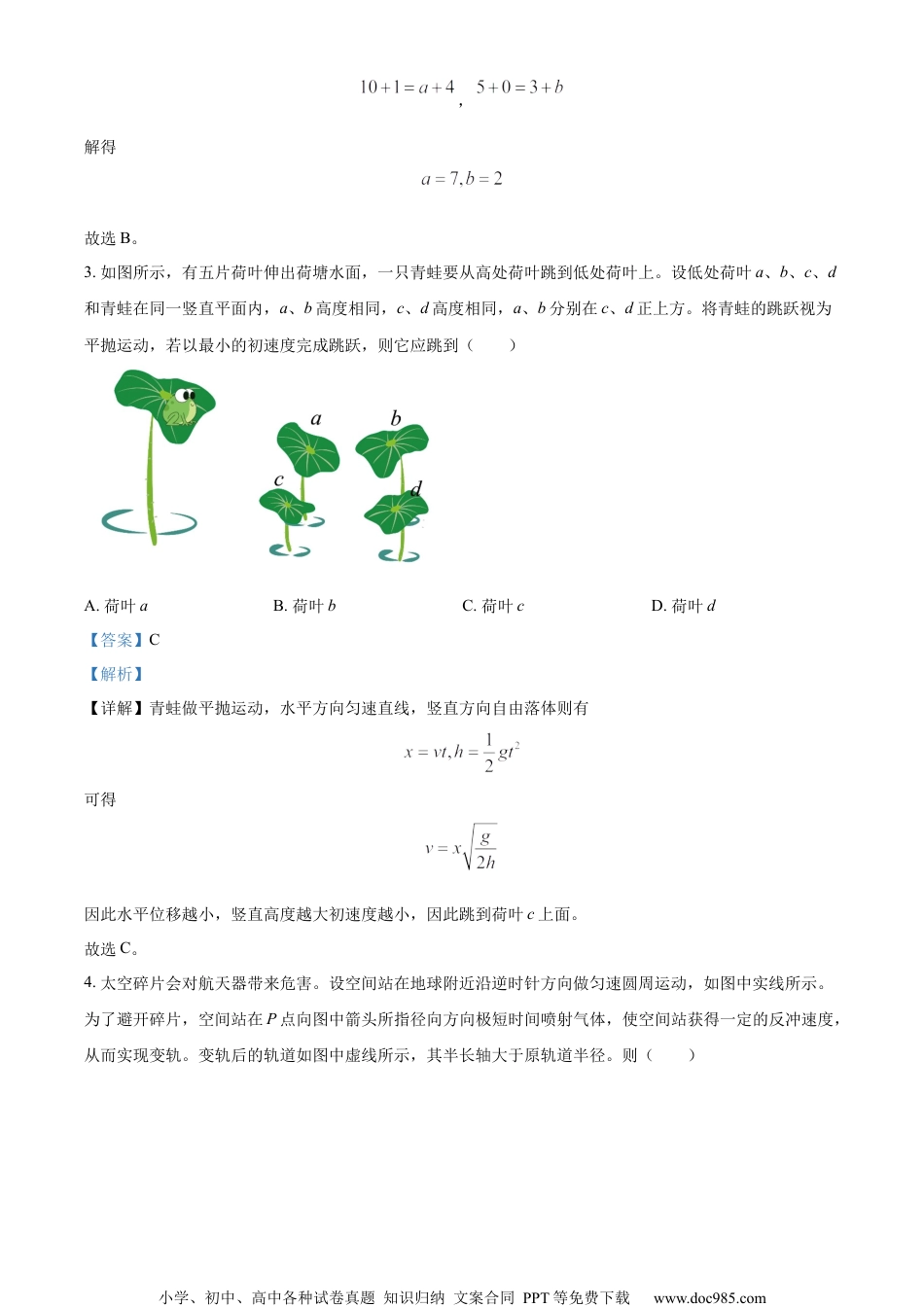 小学、初中、高中各种试卷真题知识归纳文案合同PPT等免费下载www.doc985.com2024年湖北省普通高中学业水平选择性考试物理注意事项:1.答题前,先将自己的姓名、准考证号、考场号、座位号填写在试卷和答题卡上,并认真核准准考证号条形码上的以上信息,将条形码粘贴在答题卡上的指定位置。2.请按题号顺序在答题卡上各题目的答题区域内作答,写在试卷、草稿纸和答题卡上的非答题区域均无效。3.选择题用2B铅笔在答题卡上把所选答案的标号涂黑;非选择题用黑色签字笔在答题卡上作答;字体工整,笔迹清楚。4.考试结束后,请将试卷和答题卡一并上交。一、选择题:本题共10小题,每小题4分,共40分。在每小题给出的四个选项中,第1~7题只有一项符合题目要求,第8~10题有多项符合题目要求。每小题全部选对的得4分,选对但不全的得2分,有选错的得0分。1.《梦溪笔谈》中记录了一次罕见的雷击事件:房屋被雷击后,屋内的银饰、宝刀等金属熔化了,但是漆器、刀鞘等非金属却完好(原文为:有一木格,其中杂贮诸器,其漆器银扣者,银悉熔流在地,漆器曾不焦灼。有一宝刀,极坚钢,就刀室中熔为汁,而室亦俨然)。导致金属熔化而非金属完好的原因可能为()A.摩擦B.声波C.涡流D.光照【答案】C【解析】【详解】在雷击事件中金属和非金属都经历了摩擦,声波和光照的影响,而金属能够因电磁感应产生涡流非金属不能,因此可能原因为涡流。故选C。2.硼中子俘获疗法是目前治疗癌症最先进的手段之一、是该疗法中一种核反应的方程,其中X、Y代表两种不同的原子核,则()A.a=7,b=1B.a=7,b=2C.a=6,b=1D.a=6,b=2【答案】B【解析】【详解】由质量数和电荷数守恒可得小学、初中、高中各种试卷真题知识归纳文案合同PPT等免费下载www.doc985.com,解得故选B。3.如图所示,有五片荷叶伸出荷塘水面,一只青蛙要从高处荷叶跳到低处荷叶上。设低处荷叶a、b、c、d和青蛙在同一竖直平面内,a、b高度相同,c、d高度相同,a、b分别在c、d正上方。将青蛙的跳跃视为平抛运动,若以最小的初速度完成跳跃,则它应跳到()A.荷叶aB.荷叶bC.荷叶cD.荷叶d【答案】C【解析】【详解】青蛙做平抛运动,水平方向匀速直线,竖直方向自由落体则有可得因此水平位移越小,竖直高度越大初速度越小,因此跳到荷叶c上面。故选C。4.太空碎片会对航天器带来危害。设空间站在地球附近沿逆时针方向做匀速圆周运动,如图中实线所示。为了避开碎片,空间站在P点向图中箭头所指径向方向极短时间喷射气体,使空间站获得一定的反冲速度,从而实现变轨。变轨后的轨道如图中虚线所示,其半长轴大于原轨道半径。则()小学、初中、高中各种试卷真题知识归纳文案合同PPT等免费下载www.doc985.comA.空间站变轨前、后在P点的加速度相同B.空间站变轨后的运动周期比变轨前的小C.空间站变轨后在P点的速度比变轨前的小D.空间站变轨前的速度比变轨后在近地点的大【答案】A【解析】【详解】A.在P点变轨前后空间站所受到的万有引力不变,根据牛顿第二定律可知空间站变轨前、后在P点的加速度相同,故A正确;B.因为变轨后其半长轴大于原轨道半径,根据开普勒第三定律可知空间站变轨后的运动周期比变轨前的大,故B错误;C.变轨后在P点因反冲运动相当于瞬间获得竖直向下的速度,原水平向左的圆周运动速度不变,因此合速度变大,故C错误;D.由于空间站变轨后在P点的速度比变轨前大,而比在近地点的速度小,则空间站变轨前的速度比变轨后在近地点的小,故D错误。故选A。5.在如图所示电路中接入正弦交流电,灯泡的电阻是灯泡的2倍。假设两个二极管正向电阻为0、反向电阻无穷大。闭合开关S,灯泡、的电功率之比为()A.2︰1B.1︰1C.1︰2D.1︰4【答案】C【解析】小学、初中、高中各种试卷真题知识归纳文案合同PPT等免费下载www.doc985.com【详解】两个二极管正向电阻为0,反向电阻无穷大,二极管导通则短路并联的灯泡,此时另一个灯泡与电源串联,根据电路图可知在一个完整的周期内,两个灯泡有电流通过的时间相等都为半个周期,电压有效值相等,则根据可知故选C。6.如图所示,两拖船P、Q拉着无动力货船S一起在静水中沿图中虚线方向匀速前进,两根水平缆绳与虚线...