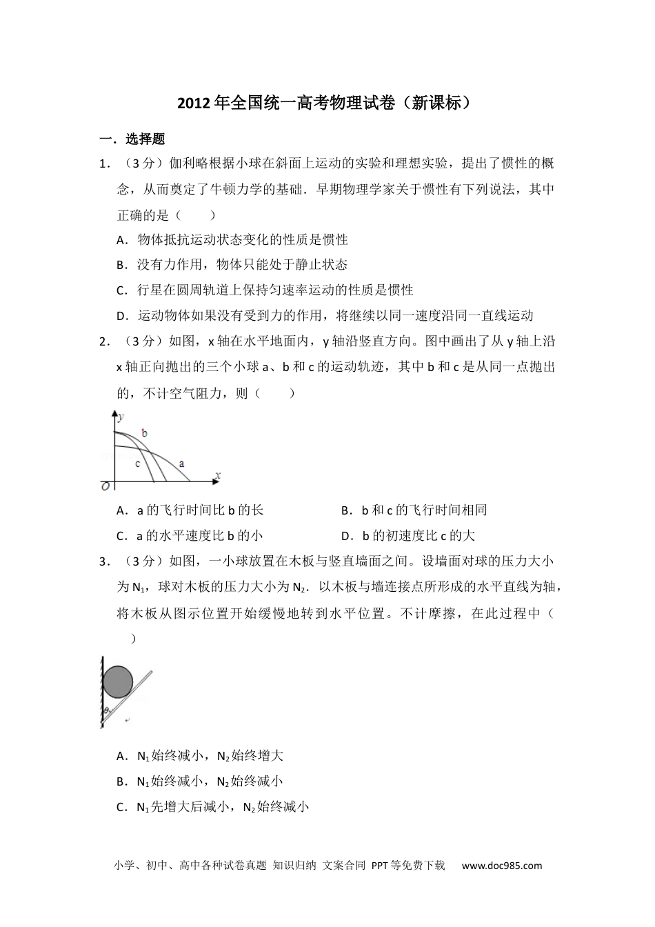 小学、初中、高中各种试卷真题知识归纳文案合同PPT等免费下载www.doc985.com2012年全国统一高考物理试卷(新课标)一.选择题1.(3分)伽利略根据小球在斜面上运动的实验和理想实验,提出了惯性的概念,从而奠定了牛顿力学的基础.早期物理学家关于惯性有下列说法,其中正确的是()A.物体抵抗运动状态变化的性质是惯性B.没有力作用,物体只能处于静止状态C.行星在圆周轨道上保持匀速率运动的性质是惯性D.运动物体如果没有受到力的作用,将继续以同一速度沿同一直线运动2.(3分)如图,x轴在水平地面内,y轴沿竖直方向。图中画出了从y轴上沿x轴正向抛出的三个小球a、b和c的运动轨迹,其中b和c是从同一点抛出的,不计空气阻力,则()A.a的飞行时间比b的长B.b和c的飞行时间相同C.a的水平速度比b的小D.b的初速度比c的大3.(3分)如图,一小球放置在木板与竖直墙面之间。设墙面对球的压力大小为N1,球对木板的压力大小为N2.以木板与墙连接点所形成的水平直线为轴,将木板从图示位置开始缓慢地转到水平位置。不计摩擦,在此过程中()A.N1始终减小,N2始终增大B.N1始终减小,N2始终减小C.N1先增大后减小,N2始终减小小学、初中、高中各种试卷真题知识归纳文案合同PPT等免费下载www.doc985.comD.N1先增大后减小,N2先减小后增大4.(3分)自耦变压器铁芯上只绕有一个线圈,原、副线圈都只取该线圈的某部分,一升压式自耦调压变压器的电路如图所示,其副线圈匝数可调.已知变压器线圈总匝数为1900匝;原线圈为1100匝,接在有效值为220V的交流电源上.当变压器输出电压调至最大时,负载R上的功率为2.0kW.设此时原线圈中电流有效值为I1,负载两端电压的有效值为U2,且变压器是理想的,则U2和I1分别约为()A.380V和5.3AB.380V和9.1AC.240V和5.3AD.240V和9.1A5.(3分)如图所示,平行板电容器的两个极板与水平地面成一角度,两极板与一直流电源相连.若一带电粒子恰能沿图中所示水平直线通过电容器,则在此过程中,该粒子()A.所受重力与电场力平衡B.电势能逐渐增加C.动能逐渐增加D.做匀变速直线运动6.(3分)如图,均匀磁场中有一由半圆弧及其直径构成的导线框,半圆直径与磁场边缘重合;磁场方向垂直于半圆面(纸面)向里,磁感应强度大小为B0.使该线框从静止开始绕过圆心O、垂直于半圆面的轴以角速度ω匀速转动半周,在线框中产生感应电流。现使线框保持图中所示位置,磁感应强度大小随时间线性变化。为了产生与线框转动半周过程中同样大小的电流,磁感应强度随时间的变化率的大小应为()小学、初中、高中各种试卷真题知识归纳文案合同PPT等免费下载www.doc985.comA.B.C.D.7.(3分)如图所示,一载流长直导线和一矩形导线框固定在同一平面内,线框在长直导线右侧,且其长边与长直导线平行。已知在t=0到t=t1的时间间隔内,长直导线中电流i随时间变化,使线框中感应电流总是沿顺时针方向;线框受到的安培力的合力先水平向左、后水平向右。图中箭头表示电流i的正方向,则i随时间t变化的图线可能是()A.B.C.D.8.(3分)假设地球是一半径为R、质量分布均匀的球体。一矿井深度为d。已知质量分布均匀的球壳对壳内物体的引力为零。矿井底部和地面处的重力加速度大小之比为()A.1﹣B.1+C.()2D.()2二.实验题9.某同学利用螺旋测微器测量一金属板的厚度.该螺旋测微器校零时的示数如小学、初中、高中各种试卷真题知识归纳文案合同PPT等免费下载www.doc985.com图(a)所示,测量金属板厚度时的示数如图(b)所示.图(a)所示读数为mm,图(b)所示读数为mm,所测金属板的厚度为mm.10.图中虚线框内存在一沿水平方向、且与纸面垂直的匀强磁场.现通过测量通电导线在磁场中所受的安培力,来测量磁场的磁感应强度大小、并判定其方向.所用部分器材已在图中给出,其中D为位于纸面内的U形金属框,其底边水平,两侧边竖直且等长;E为直流电源;R为电阻箱;为电流表;S为开关.此外还有细沙、天平、米尺和若干轻质导线.(1)在图中画线连接成实验电路图.(2)完成下列主要实验步骤中的填空①按图接线.②保持开关S断开,在托盘内加入适量细沙,使D处...