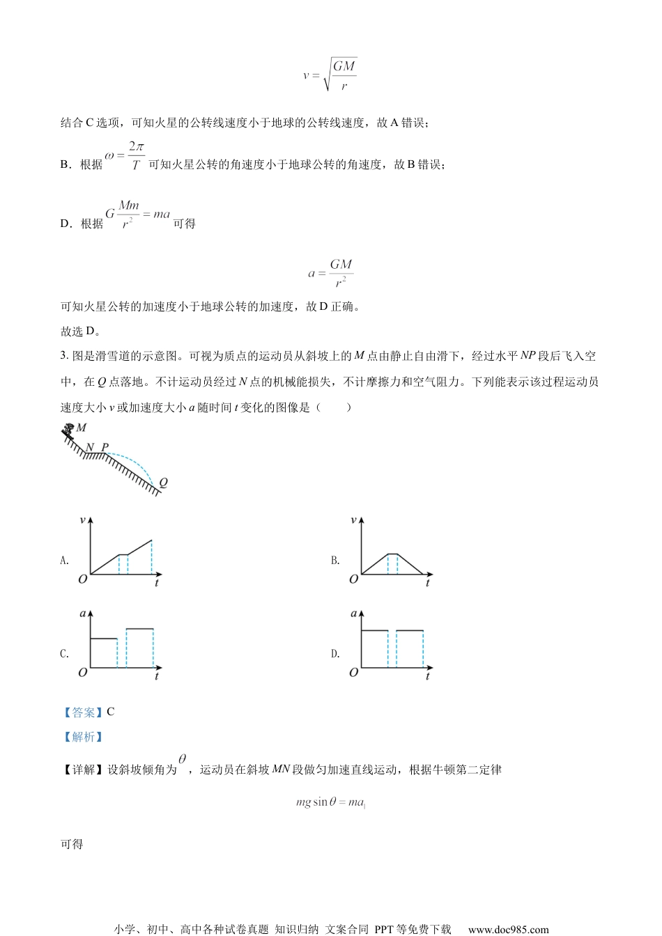 小学、初中、高中各种试卷真题知识归纳文案合同PPT等免费下载www.doc985.com2022年广东省普通高中学业水平选择性考试物理本试卷共7页,16小题,满分100分,考试用时75分钟。注意事项:1、答卷前,考生务必用黑色字迹钢笔或签字笔将自己的姓名、考生号、考场号和座位号填写在答题卡上。用2B铅笔将试卷类型(A)填涂在答题卡相应位置上。将条形码横贴在答题卡右上角“条形码粘贴处”。2、作答选择题时,选出每小题答案后,用2B铅笔把答题卡上对应题目选项的答案信息点涂黑;如需改动,用橡皮擦干净后,再选涂其他答案,答案不能答在试卷上。3、非选择题必须用黑色字迹钢笔或签字笔作答,答案必须写在答题卡各题目指定区域内相应位置上;如需改动,先划掉原来的答案,然后再写上新的答案;不准使用铅笔和涂改液,不按以上要求作答的答案无效。4、作答选考题时,请先用2B铅笔填涂选做题的题号对应的信息点,再作答。漏涂、错涂、多涂的,答案无效。5、考生必须保持答题卡的整洁,考试结束后,将试卷和答题卡一并交回。一、单项选择题:本题共7小题,每小题4分,共28分。在每小题给出的四个选项中,只有一项是符合题目要求的。1.图是可用来制作豆腐的石磨。木柄静止时,连接的轻绳处于绷紧状态。O点是三根轻绳的结点,F、和分别表示三根绳的拉力大小,且。下列关系式正确的是()A.B.C.D.【答案】D【解析】【详解】以点为研究对象,受力分析如图小学、初中、高中各种试卷真题知识归纳文案合同PPT等免费下载www.doc985.com由几何关系可知由平衡条件可得联立可得故D正确,ABC错误。故选D。2.“祝融号”火星车需要“休眠”以度过火星寒冷的冬季。假设火星和地球的冬季是各自公转周期的四分之一,且火星的冬季时长约为地球的1.88倍。火星和地球绕太阳的公转均可视为匀速圆周运动。下列关于火星、地球公转的说法正确的是()A.火星公转的线速度比地球的大B.火星公转的角速度比地球的大C.火星公转的半径比地球的小D.火星公转的加速度比地球的小【答案】D【解析】【详解】由题意可知,火星的公转周期大于地球的公转周期C.根据可得可知火星的公转半径大于地球的公转半径,故C错误;A.根据可得小学、初中、高中各种试卷真题知识归纳文案合同PPT等免费下载www.doc985.com结合C选项,可知火星的公转线速度小于地球的公转线速度,故A错误;B.根据可知火星公转的角速度小于地球公转的角速度,故B错误;D.根据可得可知火星公转的加速度小于地球公转的加速度,故D正确。故选D。3.图是滑雪道的示意图。可视为质点的运动员从斜坡上的M点由静止自由滑下,经过水平NP段后飞入空中,在Q点落地。不计运动员经过N点的机械能损失,不计摩擦力和空气阻力。下列能表示该过程运动员速度大小v或加速度大小a随时间t变化的图像是()A.B.C.D.【答案】C【解析】【详解】设斜坡倾角为,运动员在斜坡MN段做匀加速直线运动,根据牛顿第二定律可得小学、初中、高中各种试卷真题知识归纳文案合同PPT等免费下载www.doc985.com运动员在水平段做匀速直线运动,加速度运动员从点飞出后做平抛运动,加速度为重力加速度设在点的速度为,则从点飞出后速度大小的表达式为由分析可知从点飞出后速度大小与时间的图像不可能为直线,且C正确,ABD错误。故选C。4.图是简化的某种旋转磁极式发电机原理图。定子是仅匝数n不同的两线圈,,二者轴线在同一平面内且相互垂直,两线圈到其轴线交点O的距离相等,且均连接阻值为R的电阻,转子是中心在O点的条形磁铁,绕O点在该平面内匀速转动时,两线圈输出正弦式交变电流。不计线圈电阻、自感及两线圈间的相互影响,下列说法正确的是()A.两线圈产生的电动势的有效值相等B.两线圈产生的交变电流频率相等C.两线圈产生的电动势同时达到最大值D.两电阻消耗的电功率相等【答案】B【解析】【详解】AD.根据小学、初中、高中各种试卷真题知识归纳文案合同PPT等免费下载www.doc985.com两线圈中磁通量的变化率相等,但是匝数不等,则产生的感应电动势最大值不相等,有效值也不相等,根据可知,两电阻的电功率也不相等,选项AD错误;B.因两线圈放在同一个旋转磁铁的旁边,则两线圈产生的交流电的频率...