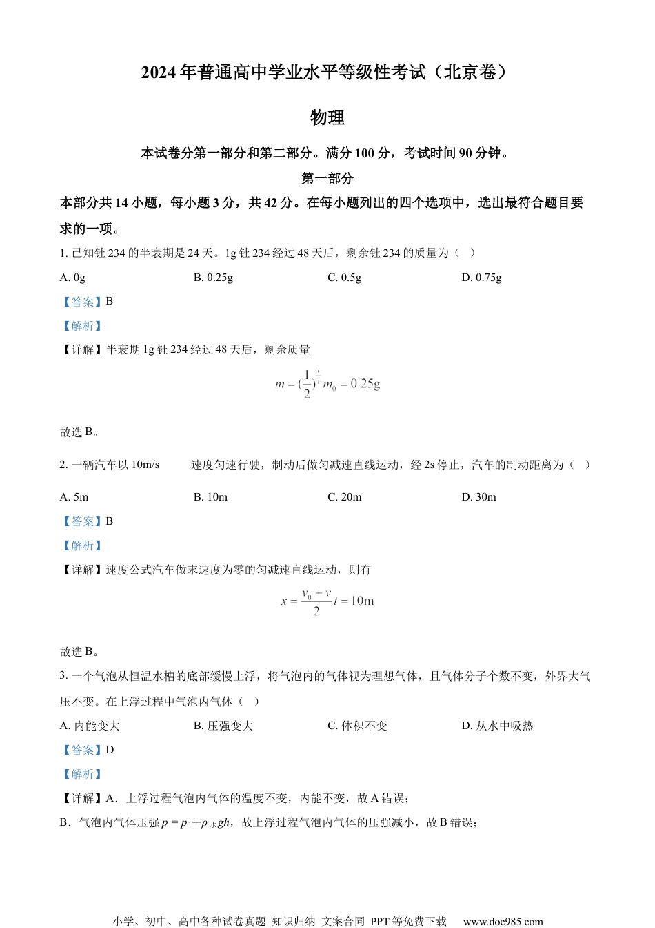 小学、初中、高中各种试卷真题知识归纳文案合同PPT等免费下载www.doc985.com2024年普通高中学业水平等级性考试(北京卷)物理本试卷分第一部分和第二部分。满分100分,考试时间90分钟。第一部分本部分共14小题,每小题3分,共42分。在每小题列出的四个选项中,选出最符合题目要求的一项。1.已知钍234的半衰期是24天。1g钍234经过48天后,剩余钍234的质量为()A.0gB.0.25gC.0.5gD.0.75g【答案】B【解析】【详解】半衰期1g钍234经过48天后,剩余质量故选B。2.一辆汽车以10m/s的速度匀速行驶,制动后做匀减速直线运动,经2s停止,汽车的制动距离为()A.5mB.10mC.20mD.30m【答案】B【解析】【详解】速度公式汽车做末速度为零的匀减速直线运动,则有故选B。3.一个气泡从恒温水槽的底部缓慢上浮,将气泡内的气体视为理想气体,且气体分子个数不变,外界大气压不变。在上浮过程中气泡内气体()A.内能变大B.压强变大C.体积不变D.从水中吸热【答案】D【解析】【详解】A.上浮过程气泡内气体的温度不变,内能不变,故A错误;B.气泡内气体压强p=p0+ρ水gh,故上浮过程气泡内气体的压强减小,故B错误;小学、初中、高中各种试卷真题知识归纳文案合同PPT等免费下载www.doc985.comC.由玻意耳定律pV=C知,气体的体积变大,故C错误;D.上浮过程气体体积变大,气体对外做功,由热力学第一定律ΔU=Q+W知,气体从水中吸热,故D正确。故选D。4.如图所示,飞船与空间站对接后,在推力F作用下一起向前运动。飞船和空间站的质量分别为m和M,则飞船和空间站之间的作用力大小为()A.B.C.D.【答案】A【解析】【详解】根据题意,对整体应用牛顿第二定律有F=(M+m)a对空间站分析有F′=Ma解两式可得飞船和空间站之间的作用力故选A。5.如图甲所示,理想变压器原线圈接在正弦式交流电源上,输入电压u随时间t变化的图像如图乙所示,副线圈接规格为“6V,3W”的灯泡。若灯泡正常发光,下列说法正确的是()A.原线圈两端电压的有效值为B.副线圈中电流的有效值为0.5A小学、初中、高中各种试卷真题知识归纳文案合同PPT等免费下载www.doc985.comC.原、副线圈匝数之比为14∶D.原线圈的输入功率为12W【答案】B【解析】【详解】A.由题图知,原线圈电压最大值为,则原线圈两端电压的有效值为故A错误;B.灯泡正常发光,由P=UI得,副线圈中电流有效值为故B正确;C.由理想变压器电压与匝数关系可知故C错误;D.理想变压器没有能量损失,原线圈的输入功率等于副线圈的输出功率,则原线圈的输入功率P1=PL=3W故D错误。故选B。6.如图所示,线圈M和线圈P绕在同一个铁芯上,下列说法正确的是()A.闭合开关瞬间,线圈M和线圈P相互吸引B.闭合开关,达到稳定后,电流表的示数为0C.断开开关瞬间,流过电流表的电流方向由a到bD.断开开关瞬间,线圈P中感应电流的磁场方向向左小学、初中、高中各种试卷真题知识归纳文案合同PPT等免费下载www.doc985.com【答案】B【解析】【详解】A.闭合开关瞬间,线圈P中感应电流的磁场与线圈M中电流的磁场方向相反,由楞次定律可知,二者相互排斥,故A错误;B.闭合开关,达到稳定后,通过线圈P的磁通量保持不变,则感应电流为零,电流表的示数为零,故B正确;CD.断开开关瞬间,通过线圈P的磁场方向向右,磁通量减小,由楞次定律可知感应电流的磁场方向向右,因此流过电流表的感应电流方向由b到a,故CD错误。故选B。7.如图所示,光滑水平轨道AB与竖直面内的光滑半圆形轨道BC在B点平滑连接。一小物体将轻弹簧压缩至A点后由静止释放,物体脱离弹簧后进入半圆形轨道,恰好能够到达最高点C。下列说法正确的是()A.物体在C点所受合力为零B.物体在C点的速度为零C.物体在C点的向心加速度等于重力加速度D.物体在A点时弹簧的弹性势能等于物体在C点的动能【答案】C【解析】【详解】AB.物体恰好能到达最高点C,则物体在最高点只受重力,且重力全部用来提供向心力,设半圆轨道的半径为r,由牛顿第二定律得解得物体在C点的速度AB错误;C.由牛顿第二定律得小学、初中、高中各种试卷真题知识归纳文案合同PPT等免费下载www.doc985.com解得物体在C点的向心加速度C正确;D.由能量守恒定律知,物体在A点时弹...