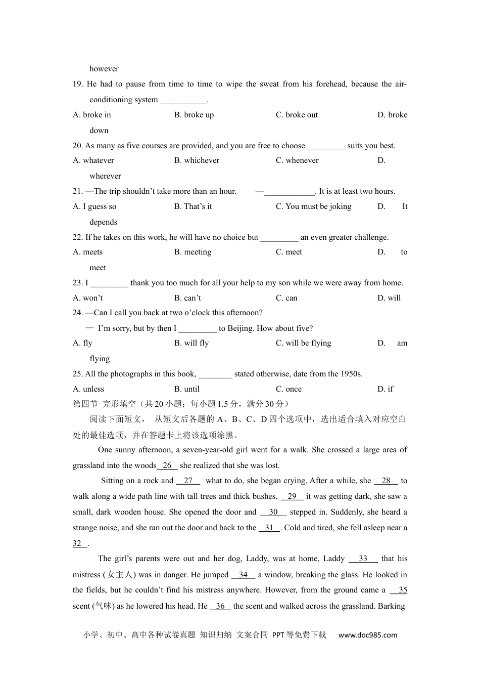 小学、初中、高中各种试卷真题知识归纳文案合同PPT等免费下载www.doc985.com2012年普通高等学校招生全国统一考试(陕西卷)英语试题第一部分:英语知识运用(共四节,满分55分)第一节语音知识(共5小题;每小题1分,满分5分)从每小题的A、B、C、D四个选项中,找出其划线部分与所给单词的划线部分读音相同的选项,并在答题卡上将该选项涂黑。1.regardA.designB.gentleC.collegeD.forget2.refuseA.discussB.rudeC.focusD.excuse3.chargeA.toothacheB.machineC.searchD.Christian4.fieldA.quietB.pieceC.friendD.experience5.tapesA.potatoesB.speechesC.cakesD.bridges第二节情景对话(共5小题;每小题1分,满分5分)根据对话情境和内容,从对话后所给的选项中选出能填入每一空白处的最佳选项,并在答题卡上将该选项涂黑。选项中有两个为多余选项。Repairman:Goodafternoon.6Customer:Hello.Mymobilephoneisn’tworking.Couldyourepairit,please?Repairman:7Customer:Itworkedwellyesterday,butIsimplycouldn’tturnitonthismorning.Repairman:8Customer:Hereyouare.Repairman:Well,Ithinkwe’llbeabletofixit.YoucanpickitupthisFriday.Customer:Oh,no.That’stoolong.9Ineeditassoonaspossible.Repairman:Letmesee.HowaboutWednesdayafternoon?小学、初中、高中各种试卷真题知识归纳文案合同PPT等免费下载www.doc985.comCustomer:10Whattime?Repairman:Afterfiveo’clock.Customer:Ok.Thankyou.A.That’sgreat.B.Ibegyourpardon?C.Letmehavealook.D.What’stheproblem?E.I’msorrytohearthat.F.WhatcanIdoforyou?G.Iwonderifyoucouldfixitearlier.第三节语法和词汇知识(共15小题;每小题1分,满分15分)从每小题的A、B、C、D四个选项中,选出可以填入空白处的最佳选项,并在答题卡上将该选项涂黑。11.Anagreementseemstobeimpossiblebecausethemajorityofthecommitteemembersare_______it.A.againstB.forC.toD.with12.Thebasketballcoach,aswellashisteam,_______interviewedshortlyafterthematchfortheiroutstandingperformance.A.wereB.wasC.isD.are13.Nomatterwhereheis,hemakes_______aruletogoforawalkbeforebreakfast.A.himB.thisC.thatD.it14.Itisthethirdtimethatshehaswontherace,________hassurprisedusall.A.thatB.whereC.whichD.what15._________inalongqueue,wewaitedforthestoretoopentobuyaNewiPad.A.StandingB.TostandC.StoodD.Stand16.—I’msorryforbeinglate.Ishouldhavephonedyouearlier.—_________.I’vejustarrived.A.That’snotroubleB.YouarewelcomeC.That’sallrightD.Youcannevertell17.Ifmycar_________morereliable,IwouldhavedriventoLassainsteadofflyinglastsummer.A.wasB.hadbeenC.shouldbeD.wouldbe18.Hot_________thenightairwas,wesleptdeeplybecauseweweresotiredafterthelongjourney.A.althoughB.asC.whileD.小学、初中、高中各种试卷真题知识归纳文案合同PPT等免费下载www.doc985.comhowever19.Hehadtopausefromtimetotimetowipethesweatfromhisforehead,becausetheair-conditioningsystem___________.A.brokeinB.brokeupC.brokeoutD.brokedown20.Asmanyasfivecoursesareprovided,andyouarefreetochoose_________suitsyoubest.A.whateverB.whicheverC.wheneverD.wherever21.—Thetripshouldn’ttakemorethananhour.—____________.Itisatleasttwohours.A.IguesssoB.That’sitC.YoumustbejokingD.Itdepends22.Ifhetakesonthiswork,hewillhavenochoicebut_________anevengreaterchallenge.A.meetsB.meetingC.meetD.tomeet23.I_________thankyoutoomuchforallyourhelptomysonwhilewewereawayfromhome.A.won’tB.can’tC.canD.will24.—CanIcallyoubackattwoo’clockthisafternoon?—I’msorry,butbythenI_________toBeijing.Howaboutfive?A.flyB.willflyC.willbeflyingD.amflying25.Allthephotographsinthisbook,________statedotherwise,datefromthe1950s.A.unlessB.untilC.onceD.if第四节完形填空(共20小题;每小题1.5分,满分30分)阅...