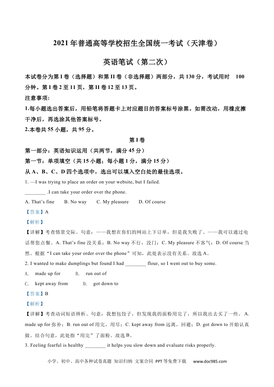 小学、初中、高中各种试卷真题知识归纳文案合同PPT等免费下载www.doc985.com2021年普通高等学校招生全国统一考试(天津卷)英语笔试(第二次)本试卷分为第I卷(选择题)和第II卷(非选择题)两部分,共130分,考试用时100分钟。第I卷2至11页,第II卷12至13页。注意事项:1.每小题选出答案后,用铅笔将答题卡上对应题目的答案标号涂黑。如需改动,用橡皮擦干净后,再选涂其他答案标号。2.本卷共55小题,共95分。第I卷第一部分:英语知识运用(共两节,满分45分)第一节:单项填空(共15小题;每小题1分,满分15分)从A、B、C、D四个选项中,选出可以填入空白处的最佳选项。1.—Iwastryingtoplaceanorderonyourwebsite,butIfailed.________.Icantakeyourorderoverthephone.A.That’sfineB.NowayC.MypleasureD.Ofcourse【答案】A【解析】【详解】考查情景交际。句意:——我想在你们的网站上下订单,但是我失败了。——我可以通过电话帮您点餐。A.That’sfine没关系;B.Noway不行,没门;C.Mypleasure不客气;D.Ofcourse当然。根据“Icantakeyourorderoverthephone”可知,此处表示没有关系。故选A。2.IwantedtomakedumplingsbutfoundIhad________flour,soIwentouttobuysome.A.madeupforB.runoutofC.keptawayfromD.gotdownto【答案】B【解析】【详解】考查动词短语辨析。句意:我想包饺子,但发现我的面粉用完了,所以我出去买了一些。A.madeupfor弥补;B.runoutof用完,用尽;C.keptawayfrom远离,回避;D.gotdownto开始认真做。结合句意,此处指“用完”了面粉。故选B。3.Feelingfearfulishealthy________ithelpsyouslowdownandevaluaterisksproperly.小学、初中、高中各种试卷真题知识归纳文案合同PPT等免费下载www.doc985.comA.becauseB.untilC.beforeD.although【答案】A【解析】【分析】【详解】考查连词词义辨析。句意:感到恐惧是有益于健康的,因为它能帮助你慢下来,正确评估风险。A.because因为;B.until直到;C.before在……之前;D.although虽然。根据语境,主句提到healthy(有益于健康的),连词引导的从句部分则在具体描述为何说是有益于健康的,这是一个原因状语从句,适用because(因为)引导,故选A。4.Markisagenius.Bythetimehegraduated,he________jobsbyadozencomputercompanies.A.hasofferedB.hasbeenofferedC.hadofferedD.hadbeenoffered【答案】D【解析】【分析】【详解】考查过去完成时的被动语态。句意:马克是个天才。到他毕业的时候,已经有十几家电脑公司给他提供了工作机会。该句是复合句,含Bythetime引导的时间状语从句,主句动作先于从句动作,且主句主语he和谓语动词offer之间是被动关系,是过去完成时的被动语态。故选D。5.Thepolicesearchedtheareaforseveraldays.________,theyfoundthepieceofevidencetheywerelookingfor.A.GenerallyB.OriginallyC.EventuallyD.Unfortunately【答案】C【解析】【分析】【详解】考查副词词义辨析。句意:警察在这一地区搜查了好几天。最终,他们找到了他们一直在努力寻找的证据。A.Generally通常,普遍地;B.Originally起初,原来,独创地;C.Eventually最终;D.Unfortunately不幸地。分析句意,警察一直在努力找证据,努力有了结果,最终找到了,故选C。6.It’sagoodideatochoosea(n)________destinationincaseyourfirst-choicetouristspotisnotavailable.A.annualB.exactC.alternativeD.pleasant【答案】C小学、初中、高中各种试卷真题知识归纳文案合同PPT等免费下载www.doc985.com【解析】【分析】【详解】考查形容词。句意:如果你首选的旅游景点没有了,选择一个替代目的地是一个好主意。A.annual年度的;B.exact准确的;C.alternative替代的;D.pleasant令人愉快的。根据后文“destinationincaseyourfirst-choicetouristspotisnotavailable”可知此处指替代目的地,应用alternative。故选C。7.Inthespring,aseason________weare1earningnewrhythmsoflife,manyofusfindcomfortinthenaturalworld.A.whenB.whereC.whatD.which【答案】A【解析】【详解】考查定语从句。句意:春天是我们学习新的生活节奏的...