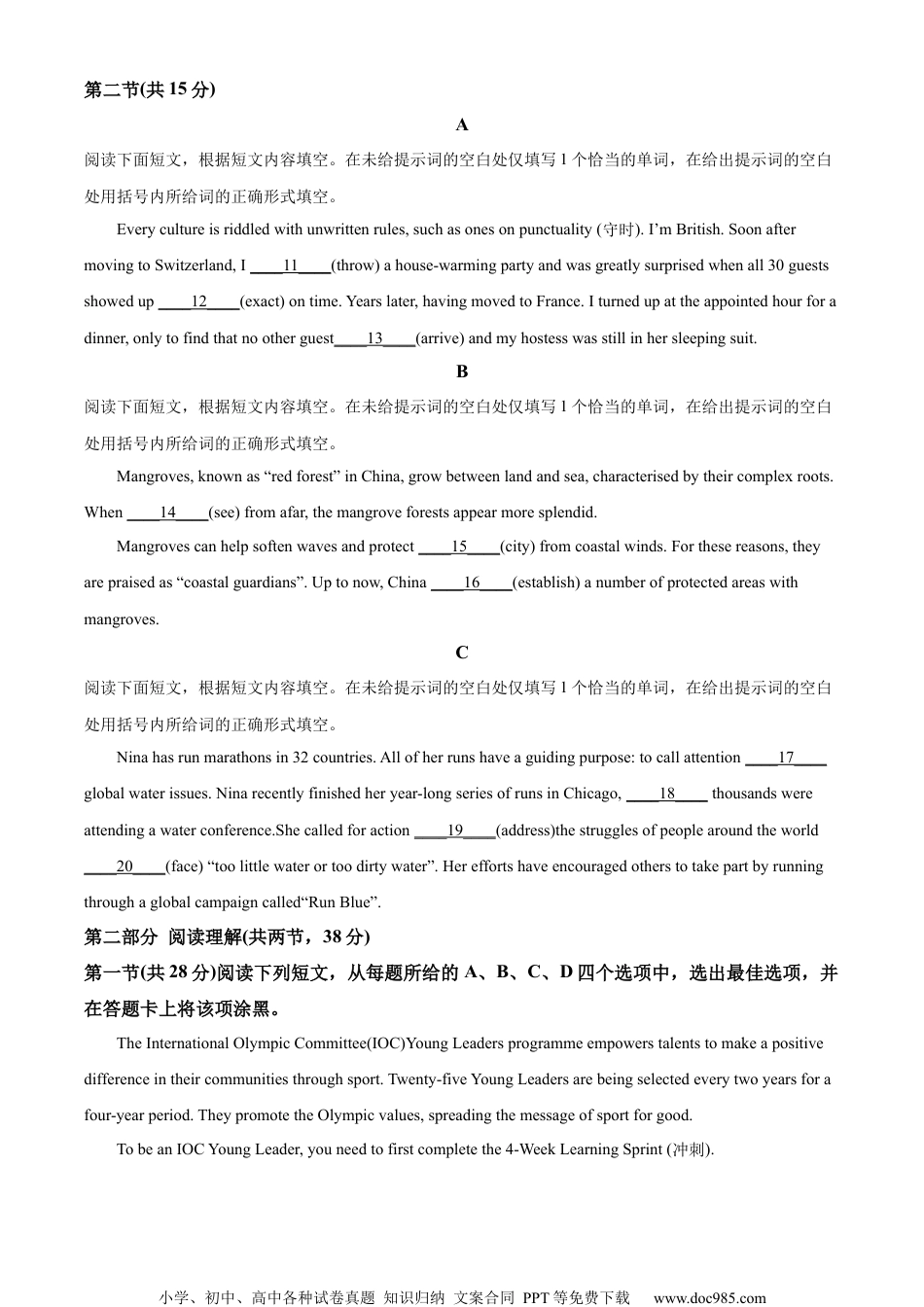 小学、初中、高中各种试卷真题知识归纳文案合同PPT等免费下载www.doc985.com2023年北京市高考英语试卷第一部分知识运用(共两节,30分)第一节(共15分)阅读下面短文,掌握其大意,从每题所给的A、B、C、D四个选项中,选出最佳选项,并在答题卡上将该项涂黑。Iwasalwaystimid(羞怯的).Beingnewtotheschoolmademeeven____1____,soitwassurprisingI’d____2____toanyonearoundme.NowIwaspayingtheprice﹣towriteafive﹣pageessayon“WhyIShouldNotTalkinClass”.Thatwouldtakeallnight!AfterIgothome,though.Itookmytimepettingthecat﹣postponingthepain.WhenIfinallysatdownto____3____,IbeganwiththereasonsMsBlackwouldwanttohear.Talkingkeptmeandmyneighboursfrom____4____.Oneparagraphdown;nowwhat?Ichewedonmypencil.Aha!Whatiftalkingwerethefirststeptowardslifeasacriminal?WithouttheeducationIwasthrowingaway,I’dturntotheftandgotoprison.WhenIgotout,peoplewouldsay,“Sheusedtotalkinclass.”Thepagesbegan____5____.Butwhenmumgothomefromwork,Iwasstill____6____,“Fivepages!That’simpossible!”“Well,you’dbettergetbacktowork,”shesaid.“andIwanttoreaditwhenyou’rethrough.”Soonafterdinner,Ihandedtheessaytomum.Ihalfexpecteda____7____﹣atleastan“Ihopeyou’velearnedyourlesson”.____8____,mumlaughedandlaughedassheread.Thenextday,whenMsBlackreadtheessaytotheclass,everyonelaughed.Icould____9____theyweren’tmakingfunofme:theylaughedbecauseIhadthepowertotellafunnystory.My____10____stillneededsomenudging(激发),butIdidlearnIwasn’tshyinprint.1.A.freerB.shyerC.calmerD.happier2.A.nodB.pointC.listenD.chat3.A.weepB.restC.writeD.read4.A.learningB.playingC.planningD.laughing5.A.standingoutB.flyingbyC.breakingupD.checkingin6.A.celebratingB.longingC.complainingD.warning7.A.lectureB.reasonC.rewardD.solution8.A.ThereforeB.MoreoverC.MeanwhileD.Instead9.A.hopeB.imagineC.tellD.predict10.A.patienceB.confidenceC.toleranceD.independence小学、初中、高中各种试卷真题知识归纳文案合同PPT等免费下载www.doc985.com第二节(共15分)A阅读下面短文,根据短文内容填空。在未给提示词的空白处仅填写1个恰当的单词,在给出提示词的空白处用括号内所给词的正确形式填空。Everycultureisriddledwithunwrittenrules,suchasonesonpunctuality(守时).I’mBritish.SoonaftermovingtoSwitzerland,I____11____(throw)ahouse-warmingpartyandwasgreatlysurprisedwhenall30guestsshowedup____12____(exact)ontime.Yearslater,havingmovedtoFrance.Iturnedupattheappointedhourforadinner,onlytofindthatnootherguest____13____(arrive)andmyhostesswasstillinhersleepingsuit.B阅读下面短文,根据短文内容填空。在未给提示词的空白处仅填写1个恰当的单词,在给出提示词的空白处用括号内所给词的正确形式填空。Mangroves,knownas“redforest”inChina,growbetweenlandandsea,characterisedbytheircomplexroots.When____14____(see)fromafar,themangroveforestsappearmoresplendid.Mangrovescanhelpsoftenwavesandprotect____15____(city)fromcoastalwinds.Forthesereasons,theyarepraisedas“coastalguardians”.Uptonow,China____16____(establish)anumberofprotectedareaswithmangroves.C阅读下面短文,根据短文内容填空。在未给提示词的空白处仅填写1个恰当的单词,在给出提示词的空白处用括号内所给词的正确形式填空。Ninahasrunmarathonsin32countries.Allofherrunshaveaguidingpurpose:tocallattention____17____globalwaterissues.Ninarecentlyfinishedheryear-longseriesofrunsinChicago,____18____thousandswereattendingawaterconference.Shecalledforaction____19____(address)thestrugglesofpeoplearoundtheworld____20____(face)“toolittlewaterortoodirtywater”.Hereffortshaveencouragedotherstotakepartbyr...
