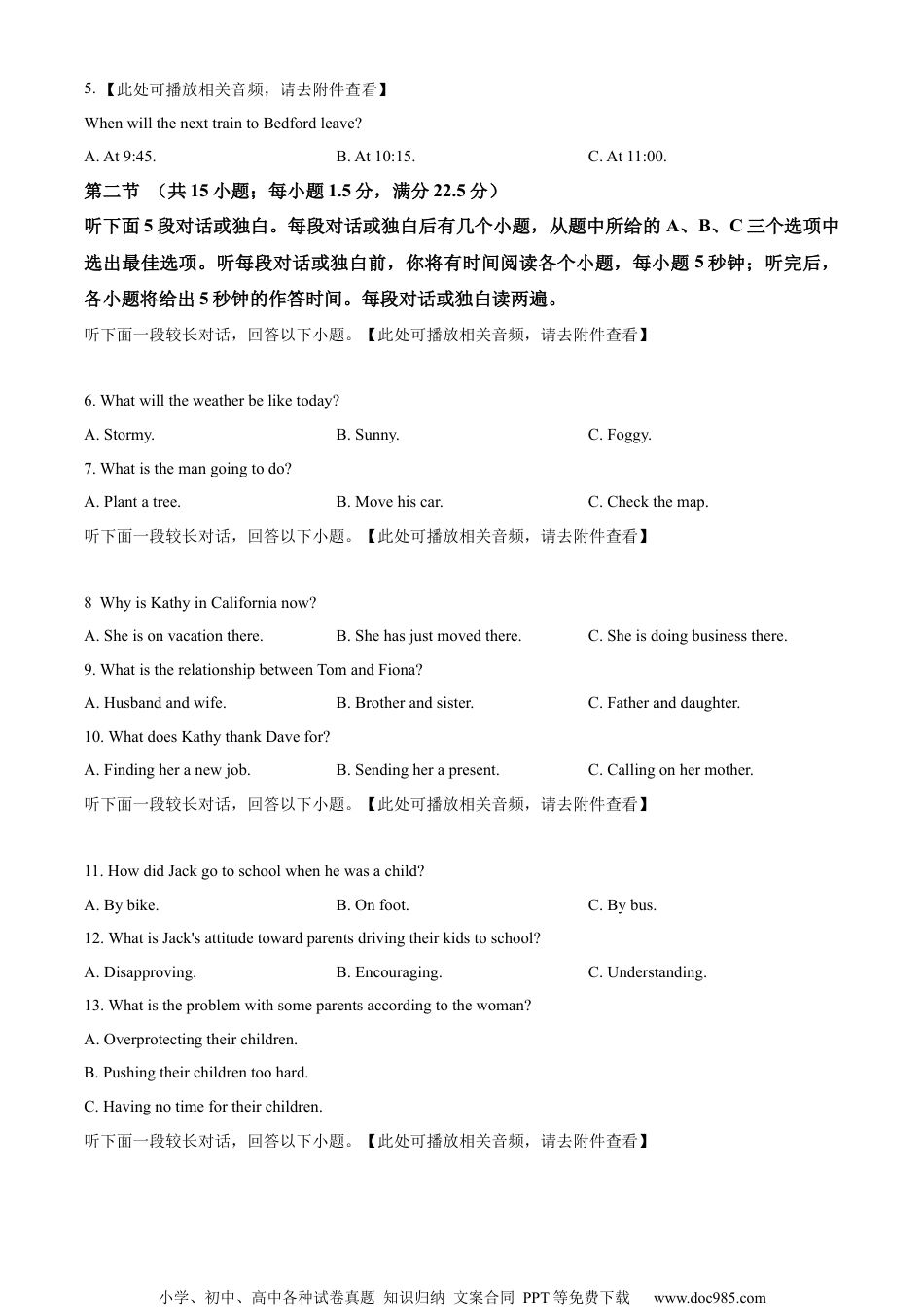 小学、初中、高中各种试卷真题知识归纳文案合同PPT等免费下载www.doc985.com2024年普通高等学校招生全国统一考试(新课标Ⅰ卷)英语姓名________________准考证号________________全卷共12页,满分150分,考试时间120分钟。考生注意:1.答题前,请务必将自己的姓名、准考证号用黑色字迹的签字笔或钢笔分别填写在试题卷和答题纸规定的位置上。2.答题时,请按照答题纸上“注意事项”的要求,在答题纸相应的位置上规范作答,在本试题卷上的作答一律无效。第一部分听力(共两节,满分30分)做题时,先将答案标在试卷上。录音内容结束后,你将有两分钟的时间将试卷上的答案转涂到答题纸上。第一节(共5小题;每小题1.5分,满分7.5分)听下面5段对话。每段对话后有一个小题,从题中所给的A、B、C三个选项中选出最佳选项。听完每段对话后,你都有10秒钟的时间来回答有关小题和阅读下一小题。每段对话仅读一遍。例:Howmuchistheshirt?A.£19.15.B.£9.18.C.£9.15.答案是C。1.【此处可播放相关音频,请去附件查看】WhatisKatedoing?A.Boardingaflight.B.Arrangingatrip.C.Seeingafriendoff.2.【此处可播放相关音频,请去附件查看】Whatarethespeakerstalkingabout?A.Apopstar.B.Anoldsong.C.Aradioprogram.3.【此处可播放相关音频,请去附件查看】Whatwillthespeakersdotoday?A.Gotoanartshow.B.Meettheman'saunt.C.EatoutwithMark.4.【此处可播放相关音频,请去附件查看】Whatdoesthemanwanttodo?A.Cancelanorder.B.Askforareceipt.C.Rescheduleadelivery.小学、初中、高中各种试卷真题知识归纳文案合同PPT等免费下载www.doc985.com5.【此处可播放相关音频,请去附件查看】WhenwillthenexttraintoBedfordleave?A.At9:45.B.At10:15.C.At11:00.第二节(共15小题;每小题1.5分,满分22.5分)听下面5段对话或独白。每段对话或独白后有几个小题,从题中所给的A、B、C三个选项中选出最佳选项。听每段对话或独白前,你将有时间阅读各个小题,每小题5秒钟;听完后,各小题将给出5秒钟的作答时间。每段对话或独白读两遍。听下面一段较长对话,回答以下小题。【此处可播放相关音频,请去附件查看】6.Whatwilltheweatherbeliketoday?A.Stormy.B.Sunny.C.Foggy.7.Whatisthemangoingtodo?A.Plantatree.B.Movehiscar.C.Checkthemap.听下面一段较长对话,回答以下小题。【此处可播放相关音频,请去附件查看】8.WhyisKathyinCalifornianow?A.Sheisonvacationthere.B.Shehasjustmovedthere.C.Sheisdoingbusinessthere.9.WhatistherelationshipbetweenTomandFiona?A.Husbandandwife.B.Brotherandsister.C.Fatheranddaughter.10.WhatdoesKathythankDavefor?A.Findingheranewjob.B.Sendingherapresent.C.Callingonhermother.听下面一段较长对话,回答以下小题。【此处可播放相关音频,请去附件查看】11.HowdidJackgotoschoolwhenhewasachild?A.Bybike.B.Onfoot.C.Bybus.12.WhatisJack'sattitudetowardparentsdrivingtheirkidstoschool?A.Disapproving.B.Encouraging.C.Understanding.13.Whatistheproblemwithsomeparentsaccordingtothewoman?A.Overprotectingtheirchildren.B.Pushingtheirchildrentoohard.C.Havingnotimefortheirchildren.听下面一段较长对话,回答以下小题。【此处可播放相关音频,请去附件查看】小学、初中、高中各种试卷真题知识归纳文案合同PPT等免费下载www.doc985.com14.WhydidMariepostherkitchengardeningonlineatfirst?A.Tokeeprecordsofherprogress.B.Tosellhome-grownvegetables.C.Tomotivateherfellowgardeners.15.WhydoesMarierecommendbeginnerstogrowstrawberries?A.Theyneednospecialcare.B.Theycanbeusedincooking.C.Theybearalotoffruitsoon.16.WhatisdifficultforMarietogrow?A.Herbs.B.Carrots.C.Pears.17.WhatisMarie'sadvicetothoseinterestedinkitchengardening?A.Aimhigh.B.Keepfocused.C.Stayoptimistic.听下面一段独白,回答以下小题。【此处可播放相关音频,请去附件查看】18.Whatis"LifeofJohnson"?A.Amagazinecolumn.B.ATVseries.C.Ahistoricalnovel.19.WhatisJ...