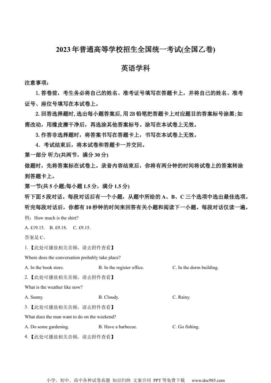 小学、初中、高中各种试卷真题知识归纳文案合同PPT等免费下载www.doc985.com2023年普通高等学校招生全国统一考试(全国乙卷)英语学科注意事项:1.答卷前,考生务必将自己的姓名、准考证号填写在答题卡上,并将自己的姓名、准考证号、座位号填写在本试卷上。2.回答选择题时,选出每小题答案后,用2B铅笔把答题卡上对应题目的答案标号涂黑;如需改动,用橡皮擦干净后,再选涂其他答案标号。涂写在本试卷上无效。3.作答非选择题时,将答案书写在答题卡上,书写在本试卷上无效。4.考试结束后,将本试卷和答题卡一并交回。第一部分听力(共两节,满分30分)做题时,先将答案标在试卷上。录音内容结束后,你将有两分钟的时间将试卷上的答案转涂到答题卡上。第一节(共5小题;每小题1.5分,满分1.5分)听下面5段对话。每段对话后有一个小题,从题中所给的A、B、C三个选项中选出最佳选项。听完每段对话后,你都有10秒钟的时间来回答有关小题和阅读下一小题。每段对话仅读一遍。例:Howmuchistheshirt?A.£19.15.B.£9.18.C.£9.15.答案是C。1.【此处可播放相关音频,请去附件查看】Wheredoestheconversationprobablytakeplace?A.Inthebookstore.B.Intheregisteroffice.C.Inthedormbuilding.2.【此处可播放相关音频,请去附件查看】Whatistheweatherlikenow?A.Sunny.B.Cloudy.C.Rainy.3.【此处可播放相关音频,请去附件查看】Whatdoesthemanwanttodoontheweekend?A.Dosomegardening.B.Haveabarbecue.C.Gofishing.4.【此处可播放相关音频,请去附件查看】小学、初中、高中各种试卷真题知识归纳文案合同PPT等免费下载www.doc985.comWhatarethespeakerstalkingabout?A.Anewoffice.B.Achangeoftheirjobs.C.Aformercolleague.5.【此处可播放相关音频,请去附件查看】WhatdoweknowaboutAndrew?A.He’soptimistic.B.He’sactive.C.He’sshy.第二节(共15小题;每小题1.5分,满分22.5分)听下面5段对话或独白。每段对话或独白后有几个小题,从题中所给的A、B、C三个选项中选出最佳选项。听每段对话或独白前,你将有时间阅读各个小题,每小题5秒钟;听完后,各小题将给出5秒钟的作答时间,每段对话或独白读两遍。听下面一段较长对话,回答以下小题。【此处可播放相关音频,请去附件查看】6.Whichofthefollowingdoesthewomandislike?A.Thebedroom.B.Thesittingroom.C.Thekitchen.7.Whatdoesthewomansuggesttheydonext?A.Gotoanotheragency.B.Seesomeotherflats.C.Visittheneighbours.听下面一段较长对话,回答以下小题。【此处可播放相关音频,请去附件查看】8.Whatisthemandoing?A.He’smakingaphonecall.B.He’schairingameeting.C.He’shostingaprogram.9.WhatmakesMrs.JohnsonworriedaboutherdaughterinAfrica?A.Lackofmedicalsupport.B.Inconvenienceofcommunication.C.Poortransportationsystem.听下面一段较长对话,回答以下小题。【此处可播放相关音频,请去附件查看】10.Whatpositiondoesthemanapplyfor?A.Asalesperson.B.Anengineer.C.Anaccountant.11.Whichaspectofthecompanyappealstotheman?A.Thecompanyculture.B.Thefreeaccommodations.C.Thecompetitivepay.12.Whatisdifficultforthemantodealwith?A.Interpersonalrelationships.B.Quality-quantitybalance.C.Unplannedhappenings.小学、初中、高中各种试卷真题知识归纳文案合同PPT等免费下载www.doc985.com听下面一段较长对话,回答以下小题。【此处可播放相关音频,请去附件查看】13.HowdoesRobertsoundwhenspeakingofhisbeingawriter?A.Hopeful.B.Grateful.C.Doubtful.14.WhatwasRobertlikebeforehewas9yearsold?A.Hehadwildimagination.B.Heenjoyedsports.C.Helovedscience.15.WhatdidRobert’sfatherdo?A.Ateacher.B.Acoach.C.Alibrarian.16.WhathelpedRobertbecomeawriter?A.Writingdaily.B.Listeningtostories.C.Readingextensively.听下面一段独白,回答以下小题。【此处可播放相关音频,请去附件查看】17.WherewasOpenTchaikovskyCompetitionheldin1986?A.InMoscow.B.InChelyabinsk.C.InBerlin.18.WhatdoesMaximsayaboutthecompetitionhea...