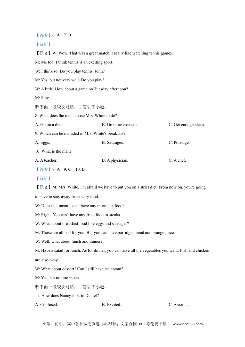 小学、初中、高中各种试卷真题知识归纳文案合同PPT等免费下载www.doc985.com2021年全国高考乙卷英语试题注意事项:1、答卷前,考生务必将自己的姓名、准考证号填写在答题卡上。2.回答选择题时,选出每小题答案后,用铅笔把答题卡上对应题目的答案标号涂黑。如需改动,用橡皮擦干净后,再选涂其他答案标号。回答非选择题时,将答案写在答题卡上,写在本试卷上无效。3.考试结束后,将本试卷和答题卡一并交回。第一部分听力(共两节,满分30分)做题时,先将答案标在试卷上。录音内容结束后,你将有两分钟的时间将试卷上的答案转涂到答题卡上。第一节(共5小题;每小题1.5分,满分7.5分)听下面5段对话。每段对话后有一个小题,从题中所给的A、B、C三个选项中选出最佳选项。听完每段对话后,你都有10秒钟的时间来回答有关小题和阅读下一小题。每段对话仅读一遍。例:Howmuchistheshirt?A.£19.15.B.£9.18.C.£9.15.答案是C。1.Whatisthemandoing?A.Askingtheway.B.Givingdirections.C.Correctingamistake.【答案】A【解析】【原文】M:Excuseme,Igotlost.Itookabustocityhall,butIcan'tfindtheplace.W:Thisistheconcerthall,notcityhall.Togothere,youshouldtakethebusatGrandHoteloverthere.2.Whatdresssizedoesthewomanwant?A.8.B.10.C.12.【答案】C【解析】【原文】M:CanIhelpyou?W:I'mlookingforasizetwelvedress.小学、初中、高中各种试卷真题知识归纳文案合同PPT等免费下载www.doc985.comM:Oh,letmesee.Aneight,aten.Ah,you'relucky.Ihavetheprettiestdresshereinatwelve.Whydon'tyoutryiton?3.Whatisthewomanlikelytodo?A.Makeaphonecall.B.Handletheproblem.C.Havearest.【答案】C【解析】【原文】W:Doyouthinkyoucantakecareofeverythingintheofficetoday?M:Noproblem.Justgohomeandtakearest.IfthereisanythingIfeelIcannothandle,I'llcallyou.4.Whichtourdoesthemanseemtobeinterestedin?A.Theeveningtour.B.Thehalf-daytour.C.Thefull-daytour.【答案】B【解析】【原文】W:Wehaveahalf-daytour,afull-daytourandaneveningtour.Whichonewouldyoulike?M:Whatisthescheduleofthehalf-daytour?W:Itsetsoutat8:30a.m.andreturnsat2:00p.m.5.Wherearethespeakers?A.Atacanteen.B.Ataclinic.C.Atabank.【答案】B【解析】【原文】M:Now,whatseemstobethetrouble,Mrs.Stevens?W:I'vebeenverydizzylately.Andlastnight,Ihadsomechestpain.M:Don'tworry.Letmehavealook.第二节(共15小题;每小题1.5分,满分22.5分)听下面5段对话或独白。每段对话或独白后有几个小题,从题中所给的A、B、C三个选项中选出最佳选项。听每段对话或独白前,你将有时间阅读各个小题,每小题5秒钟;听完后,各小题将给出5秒钟的作答时间。每段对话或独白读两遍。听下面一段较长对话,回答以下小题。6.Whatdoesthewomanthinkofthematch?A.Entertaining.B.Discouraging.C.Boring.7.WhatdothespeakersplantodoonTuesdayafternoon?A.Watchagame.B.Playtennis.C.Gotothecinema.小学、初中、高中各种试卷真题知识归纳文案合同PPT等免费下载www.doc985.com【答案】6.A7.B【解析】【原文】W:Wow.Thatwasagreatmatch.Ireallylikewatchingtennisgames.M:Metoo.Ithinktennisisanexcitingsport.W:Ithinkso.Doyouplaytennis,John?M:Yes,butnotverywell.Doyouplay?W:Alittle.HowaboutagameonTuesdayafternoon?M:Sure.听下面一段较长对话,回答以下小题。8.WhatdoesthemanadviseMrs.Whitetodo?A.Goonadiet.B.Domoreexercise.C.Getenoughsleep.9.WhichcanbeincludedinMrs.White'sbreakfast?A.Eggs.B.Sausages.C.Porridge.10.Whatistheman?A.Ateacher.B.Aphysician.C.Achef.【答案】8.A9.C10.B【解析】【原文】M:Mrs.White,I'mafraidwehavetoputyouonastrictdiet.Fromnowon,you'regoingtohavetostayawayfromsaltyfood.W:DoesthatmeanIcan'thaveanymorefastfood?M:Right.Youcan'thaveanyfriedfoodorsteaks.W:Whataboutbreakfastfoodlikeeggsandsausages?M:Thoseareallbadforyou.Butyoucanhaveporridge,breadandorangejuice.W:W...