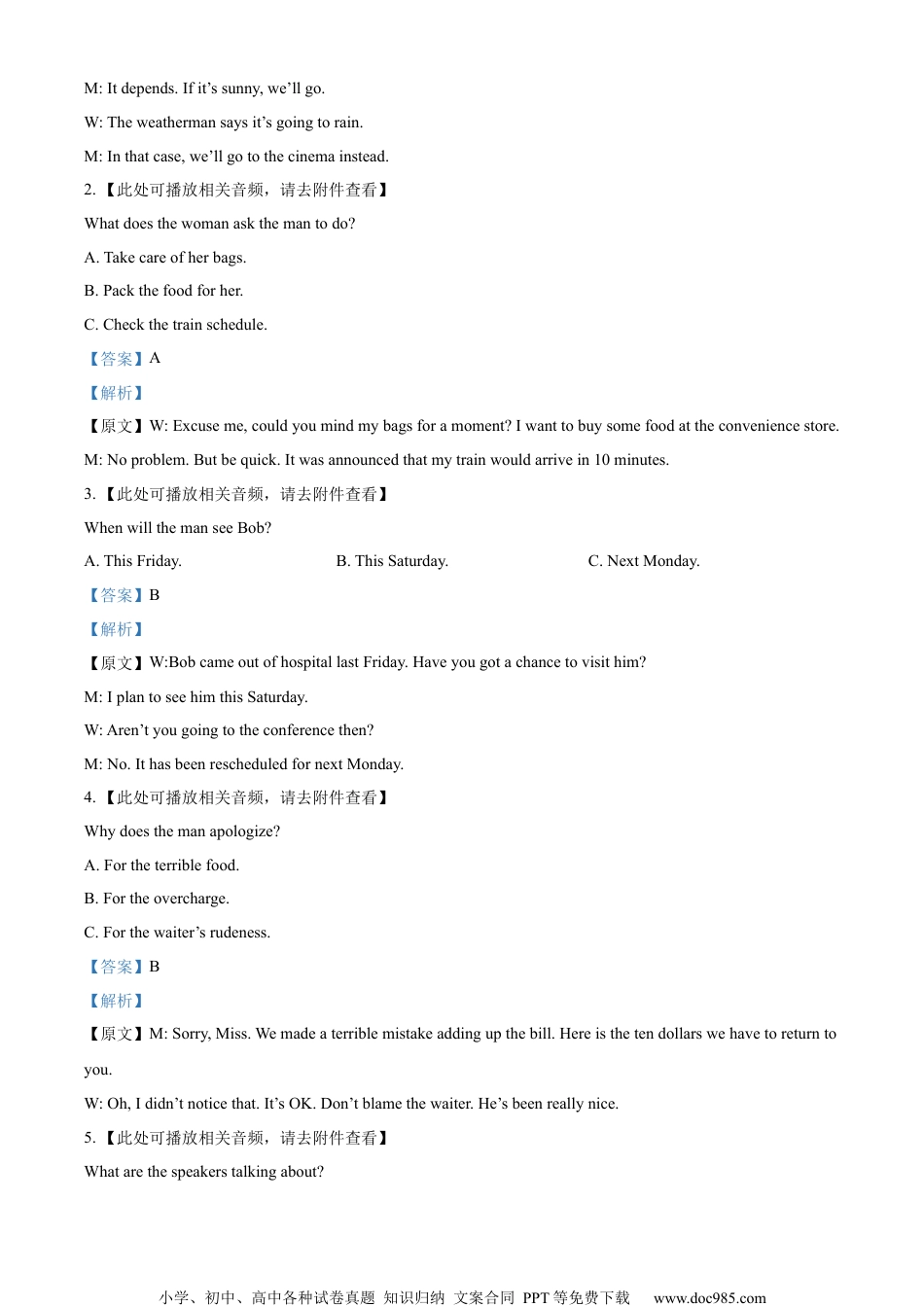 小学、初中、高中各种试卷真题知识归纳文案合同PPT等免费下载www.doc985.com2023年普通高等学校招生全国统一考试(新课标全国Ⅱ卷)英语学科本试卷共12页。考试结束后,将本试卷和答题卡一并交回。注意事项:1.答题前,考生先将自己的姓名、准考证号码填写清楚,将条形码准确粘贴在考生信息条形码粘贴区。2.选择题必须使用2B铅笔填涂;非选择题必须使用0.5毫米黑色字迹的签字笔书写,字体工整、笔迹清楚。3.请按照题号顺序在答题卡各题目的答题区域内作答,超出答题区域书写的答案无效;在草稿纸、试卷上答题无效。4.作图可先使用铅笔画出,确定后必须用黑色字迹的签字笔描黑。5.保持卡面清洁,不要折叠,不要弄破、弄皱,不准使用涂改液、修正带、刮纸刀。英语听力注意事项:英语听力共两节,20小题,每小题1.5分,满分30分。第一部分听力(共两节,满分30分)做题时,先将答案标在试卷上。录音内容结束后,你将有两分钟的时间将试卷上的答案转涂到答题卡上。第一节(共5小题;每小题1.5分,满分7.5分)听下面5段对话。每段对话后有一个小题,从题中所给的A、B、C三个选项中选出最佳选项。听完每段对话后,你都有10秒钟的时间来回答有关小题和阅读下一小题。每段对话仅读一遍。例:Howmuchistheshirt?A.£19.15.B.£9.18.C.£9.15.答案是C。1.【此处可播放相关音频,请去附件查看】WhatwillJackprobablydothisweekend?A.Gocamping.B.Visitafriend.C.Watchafilm.【答案】C【解析】【原文】W:Jack,areyougoingcampingwithyourfriendsthisweekend?小学、初中、高中各种试卷真题知识归纳文案合同PPT等免费下载www.doc985.comM:Itdepends.Ifit’ssunny,we’llgo.W:Theweathermansaysit’sgoingtorain.M:Inthatcase,we’llgotothecinemainstead.2.【此处可播放相关音频,请去附件查看】Whatdoesthewomanaskthemantodo?A.Takecareofherbags.B.Packthefoodforher.C.Checkthetrainschedule.【答案】A【解析】【原文】W:Excuseme,couldyoumindmybagsforamoment?Iwanttobuysomefoodattheconveniencestore.M:Noproblem.Butbequick.Itwasannouncedthatmytrainwouldarrivein10minutes.3.【此处可播放相关音频,请去附件查看】WhenwillthemanseeBob?A.ThisFriday.B.ThisSaturday.C.NextMonday.【答案】B【解析】【原文】W:BobcameoutofhospitallastFriday.Haveyougotachancetovisithim?M:IplantoseehimthisSaturday.W:Aren’tyougoingtotheconferencethen?M:No.IthasbeenrescheduledfornextMonday.4.【此处可播放相关音频,请去附件查看】Whydoesthemanapologize?A.Fortheterriblefood.B.Fortheovercharge.C.Forthewaiter’srudeness.【答案】B【解析】【原文】M:Sorry,Miss.Wemadeaterriblemistakeaddingupthebill.Hereisthetendollarswehavetoreturntoyou.W:Oh,Ididn’tnoticethat.It’sOK.Don’tblamethewaiter.He’sbeenreallynice.5.【此处可播放相关音频,请去附件查看】Whatarethespeakerstalkingabout?小学、初中、高中各种试卷真题知识归纳文案合同PPT等免费下载www.doc985.comA.Writingabook.B.Holdingacelebration.C.Buyingapresent.【答案】C【解析】【原文】W:DoyouthinkweshouldgetSteveabookforthenewyear?M:Booksaregood.ButStevewouldn’ttakejustanybook.Hehashadthisparticularoneongeography.第二节(共15小题;每小题1.5分,满分22.5分)听下面5段对话或独白。每段对话或独白后有几个小题,从题中所给的A、B、C三个选项中选出最佳选项。听每段对话或独白前,你将有时间阅读各个小题,每小题5秒钟;听完后,各小题将给出5秒钟的作答时间。每段对话或独白读两遍。听下面一段较长对话,回答以下小题。【此处可播放相关音频,请去附件查看】6.WhydoesSaramakethephonecall?A.Toaskforadvice.B.Toarrangeanouting.C.Tocancelanappointment.7.WhatdoesDavidwanttodo?A.Gotoadinnerparty.B.TalktoSarainperson.C.Workonthenewcase.【答案】6.C7.B【解析】【原文】M:Hello,Sara.W:Hello,David.Ican’tcomefordinnertonight.Sorry.M:Oh,whathappened?W:We’vegotanewcaseandthingsgetprettycrazyhereintheoffice.M:Well,thenI...