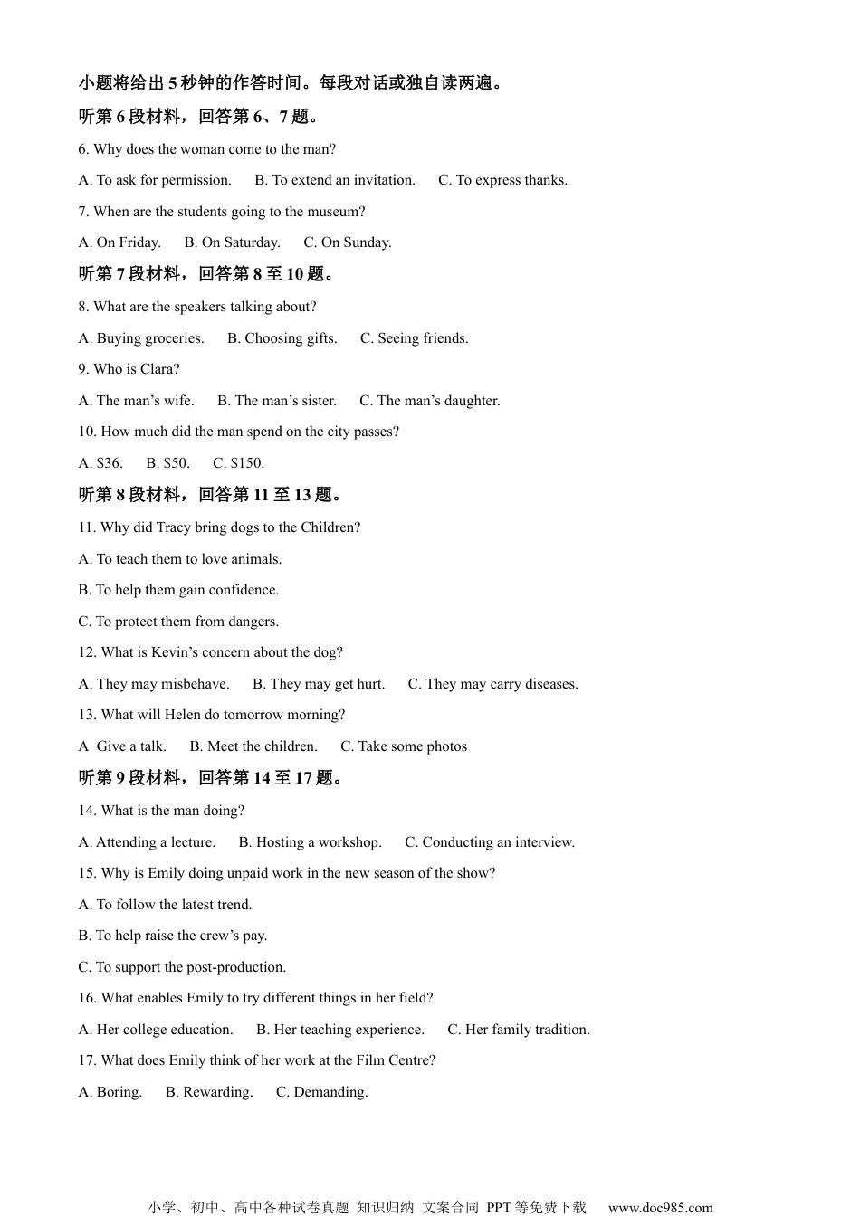 小学、初中、高中各种试卷真题知识归纳文案合同PPT等免费下载www.doc985.com2022年普通高等学校招生全国统一考试(浙江卷)英语选择题部分(共95分)第一部分听力(共两节满分30分)做题时,先将答案标在试卷上。录音内容结束后,你将有两分钟的时间将试卷上的答案转涂到答题纸上。第一节(共5小题;每小题1.5分,满分7.5分)听下面5段对话。每段对话后有一个小题,从题中所给的A、B、C三个选项中选出最佳选项,并标在试卷的相应位置。听完每段对话后,你都有10秒钟的时间来回答有关小题和阅读下一小题。每段对话仅读一遍。例:Howmuchistheshirt?A.£19.15.B.£9.18.C.£9.15.答案是C。1.Whatwillthespeakersdonext?A.Checkthemap.B.Leavetherestaurant.C.Parkthecar.2.Wherearethespeakers?A.Atabusstop.B.Athome.C.Attheairport.3.Whatdidthespeakersdolastweek?A.Theyhadacelebrationdinner.B.Theywenttoseeanewbornbaby.C.Theysentamailtotheirneighbors.4.Whydoesthemanmakethephonecall?A.Tocancelaweekendtrip.B.Tomakeanappointment.C.Togetsomeinformation.5.Whatdoesthemanprobablywanttodo?A.Dosomeexercise.B.Getanextrakey.C.Orderroomservice.第二节(共15小题;每小题1.5分,满分22.5分)听下面5段对话或独白。每段对话或独白后有几个小题,从题中所给的A、B、C三个选项中选出最佳选项。听每段对话或独白前,你将有时间阅读各个小题,每小题5秒钟;听完后,各小学、初中、高中各种试卷真题知识归纳文案合同PPT等免费下载www.doc985.com小题将给出5秒钟的作答时间。每段对话或独自读两遍。听第6段材料,回答第6、7题。6.Whydoesthewomancometotheman?A.Toaskforpermission.B.Toextendaninvitation.C.Toexpressthanks.7.Whenarethestudentsgoingtothemuseum?A.OnFriday.B.OnSaturday.C.OnSunday.听第7段材料,回答第8至10题。8.Whatarethespeakerstalkingabout?A.Buyinggroceries.B.Choosinggifts.C.Seeingfriends.9.WhoisClara?A.Theman’swife.B.Theman’ssister.C.Theman’sdaughter.10.Howmuchdidthemanspendonthecitypasses?A.$36.B.$50.C.$150.听第8段材料,回答第11至13题。11.WhydidTracybringdogstotheChildren?A.Toteachthemtoloveanimals.B.Tohelpthemgainconfidence.C.Toprotectthemfromdangers.12.WhatisKevin’sconcernaboutthedog?A.Theymaymisbehave.B.Theymaygethurt.C.Theymaycarrydiseases.13.WhatwillHelendotomorrowmorning?A.Giveatalk.B.Meetthechildren.C.Takesomephotos听第9段材料,回答第14至17题。14.Whatisthemandoing?A.Attendingalecture.B.Hostingaworkshop.C.Conductinganinterview.15.WhyisEmilydoingunpaidworkinthenewseasonoftheshow?A.Tofollowthelatesttrend.B.Tohelpraisethecrew’spay.C.Tosupportthepost-production.16.WhatenablesEmilytotrydifferentthingsinherfield?A.Hercollegeeducation.B.Herteachingexperience.C.Herfamilytradition.17.WhatdoesEmilythinkofherworkattheFilmCentre?A.Boring.B.Rewarding.C.Demanding.小学、初中、高中各种试卷真题知识归纳文案合同PPT等免费下载www.doc985.com听第10段材料,回答第18至20题。18.Whoisthespeakertalkingto?A.Sportsclubmembers.B.Internationaltourists.C.Universitystudents.19.WheredidEmmaworkforarugbyteam?A.InManchester.B.InDublin.C.InVancouver.20.WhatcanbeachallengetoEmma’swork?A.Competitioninthehealthcareindustry.B.Discriminationagainstfemalescientists.C.Influenceofmisinformationonthepublic.第二部分阅读理解(共两节,满分35分)第一节(共10小题;每小题2.5分,满分25分)阅读下列短文,从每题所给的A、B、C和D四个选项中,选出最佳选项,并在答题卡上将该项涂黑。APastaandpizzawereoneveryone’slunchmenuinmynativelandofItaly.Everyonewhohadsuchalunchwasfair-skinnedandspokeItalian.Afewyearslater,asIstoodinthelunchlinewithmykindergartenclassinaschoolinBrooklyn,Irealizedthingswerenolongerthatsimple.Myclassmatesrangedfromthosekidsw...
