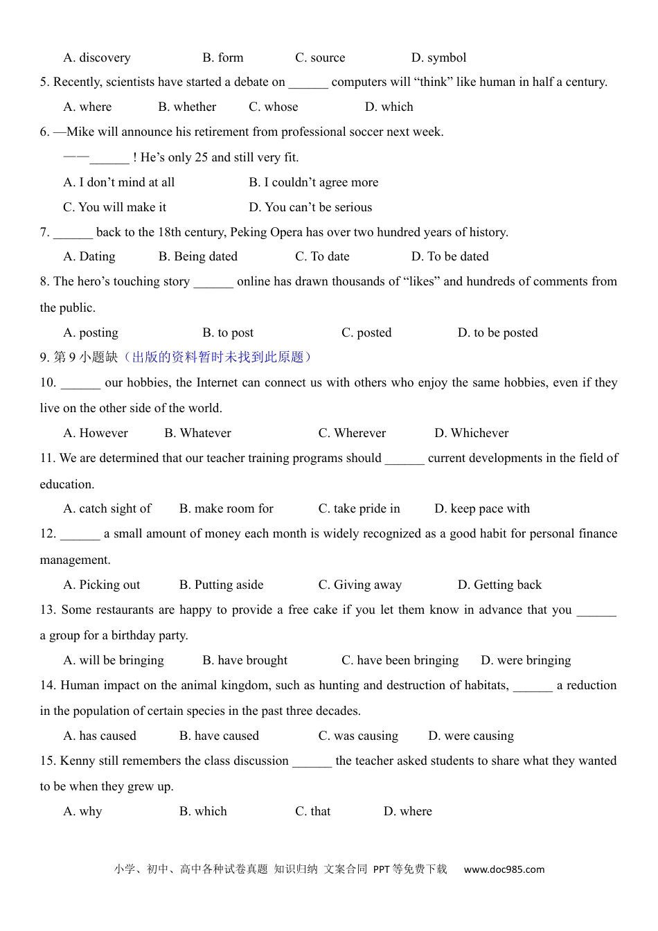 小学、初中、高中各种试卷真题知识归纳文案合同PPT等免费下载www.doc985.com绝密★启用前2023年普通高等学校招生全国统一考试(天津卷)英语笔试(第一次)本试卷分为第Ⅰ卷(选择题)和第Ⅱ卷(非选择题)两部分,共130分,考试用时100分钟。第Ⅰ卷1至11页,第Ⅱ卷12至13页。答卷前,考生务必将自己的姓名、考生号填写在答题卡上,并在规定位置粘贴考试用条形码。答卷时,考生务必将答案涂写在答题卡上,答在试卷上的无效。考试结束后,将本试卷和答题卡一并交回。祝各位考生考试顺利!第Ⅰ卷注意事项:1.每小题选出答案后,用铅笔将答题卡上对应题目的答案标号涂黑。如需改动,用橡皮擦干净后,再选涂其他答案标号。2.本卷共55小题,共95分。第一部分:英语知识运用(共两节,满分45分)第一节:单项填空(共15小题;每小题1分,满分15分)从A、B、C、D四个选项中,选出可以填入空白处的最佳选项。例:Standoverthere________you’llbeabletoseeitbetter.A.orB.andC.butD.while答案是B。1.DragonBoatFestivalisheld______QuYuan,awell-knownpoetinancientChina.A.inhonorofB.insearchofC.inthehopeofD.inthefaceof2.第2小题缺(出版的资料暂时未找到此原题)3.WhenLisamovedtoanewcity,shehadahardtime______tohernewsurroundings.A.addingB.adjustingC.applyingD.attending4.TheBritishromanticpoetWilliamWordsworthgrewupintheLakeDistrict,whichwasagreat______ofinspirationforhispoems.小学、初中、高中各种试卷真题知识归纳文案合同PPT等免费下载www.doc985.comA.discoveryB.formC.sourceD.symbol5.Recently,scientistshavestartedadebateon______computerswill“think”likehumaninhalfacentury.A.whereB.whetherC.whoseD.which6.—Mikewillannouncehisretirementfromprofessionalsoccernextweek.——______!He’sonly25andstillveryfit.A.Idon’tmindatallB.Icouldn’tagreemoreC.YouwillmakeitD.Youcan’tbeserious7.______backtothe18thcentury,PekingOperahasovertwohundredyearsofhistory.A.DatingB.BeingdatedC.TodateD.Tobedated8.Thehero’stouchingstory______onlinehasdrawnthousandsof“likes”andhundredsofcommentsfromthepublic.A.postingB.topostC.postedD.tobeposted9.第9小题缺(出版的资料暂时未找到此原题)10.______ourhobbies,theInternetcanconnectuswithotherswhoenjoythesamehobbies,eveniftheyliveontheothersideoftheworld.A.HoweverB.WhateverC.WhereverD.Whichever11.Wearedeterminedthatourteachertrainingprogramsshould______currentdevelopmentsinthefieldofeducation.A.catchsightofB.makeroomforC.takeprideinD.keeppacewith12.______asmallamountofmoneyeachmonthiswidelyrecognizedasagoodhabitforpersonalfinancemanagement.A.PickingoutB.PuttingasideC.GivingawayD.Gettingback13.Somerestaurantsarehappytoprovideafreecakeifyouletthemknowinadvancethatyou______agroupforabirthdayparty.A.willbebringingB.havebroughtC.havebeenbringingD.werebringing14.Humanimpactontheanimalkingdom,suchashuntinganddestructionofhabitats,______areductioninthepopulationofcertainspeciesinthepastthreedecades.A.hascausedB.havecausedC.wascausingD.werecausing15.Kennystillrememberstheclassdiscussion______theteacheraskedstudentstosharewhattheywantedtobewhentheygrewup.A.whyB.whichC.thatD.where小学、初中、高中各种试卷真题知识归纳文案合同PPT等免费下载www.doc985.com第二节:完形填空(共20小题;每小题1.5分,满分30分)阅读下面短文,掌握其大意,然后从16~35各题所给的A、B、C、D四个选项中,选出最佳选项。Inmyearlythirties,IdecidedtoclimbMountKilimanjaro,thehighestmountaininAfricaat5,895metersabovesealevel.Aftermonthsofpreparation,Istartedmygreat16.Atthebaseofthemountain,ImetMik,alocalporter,whowarmly17me.Mik’sjobwastocarrymyequipmentupthemountain,setupthetent(帐篷),andcarryeverything...