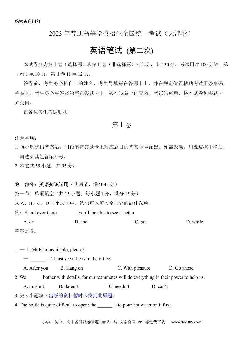 小学、初中、高中各种试卷真题知识归纳文案合同PPT等免费下载www.doc985.com绝密★启用前2023年普通高等学校招生全国统一考试(天津卷)英语笔试(第二次)本试卷分为第Ⅰ卷(选择题)和第Ⅱ卷(非选择题)两部分,共130分,考试用时100分钟。第Ⅰ卷1至10页,第Ⅱ卷11至12页。答卷前,考生务必将自己的姓名、考生号填写在答题卡上,并在规定位置粘贴考试用条形码。答卷时,考生务必将答案涂写在答题卡上,答在试卷上的无效。考试结束后,将本试卷和答题卡一并交回。祝各位考生考试顺利!第Ⅰ卷注意事项:1.每小题选出答案后,用铅笔将答题卡上对应题目的答案标号涂黑。如需改动,用橡皮擦干净后,再选涂其他答案标号。2.本卷共55小题,共95分。第一部分:英语知识运用(共两节,满分45分)第一节:单项填空(共15小题;每小题1分,满分15分)从A、B、C、D四个选项中,选出可以填入空白处的最佳选项。例:Standoverthere________you’llbeabletoseeitbetter.A.orB.andC.butD.while答案是B。1.—IsMr.Pearlavailable,please?—______.I’lljustseeifheisintheoffice.A.AfteryouB.HangonC.WithpleasureD.Goahead2.We______botherwithdetails,forourteammateswilldoeverythingintheirpowertohelpus.A.mustn’tB.daren’tC.needn’tD.can’t3.第3小题缺(出版的资料暂时未找到此原题)4.Thebottleisquitedifficulttoopen;the______istopourhotwateronitfirst.小学、初中、高中各种试卷真题知识归纳文案合同PPT等免费下载www.doc985.comA.focusB.targetC.functionD.trick5.—IsitallrightifIleaveabitearlier?—______.Icanfinishthereportonmyown.A.SurethingB.HelpyourselfC.ForgetitD.Thatdepends6.Athletesshouldmake______preparation,bothphysicalandpsychological,beforeenteringabigrace.A.adequateB.slightC.identicalD.rough7.Ireallywanttogotoaplaceforthesummervacation,especially______withbeautifulsceneryanduniqueculture.A.itB.thatC.thisD.one8.Thewoodentowerthat______willbeopentotouristssoon,andtheworkisalmostfinished.A.isbeingrestoredB.isrestoredC.isrestoringD.restores9.______youareoldenoughtomakeyourownjudgement,youshouldstarttopursueyourcareer.A.EvenifB.AsthoughC.EversinceD.Nowthat10.______severaladjustmentstothedesignfortwomonths,theengineereventuallysucceededinbuildingahighlyefficientsystem.A.TryingB.TriedC.HavingtriedD.Havingbeentried11.OnApril22everyyear,peoplearoundtheworldmarkEarthDayby______theenvironment.A.adaptingtoB.benefitingfromC.caringforD.relyingon12.Peoplewhovaluetheirprivacyareconcernedabout______Googlemightdowiththeinformationitisgathering.A.thatB.whatC.whyD.how13.Chinaisashiningexamplefortheglobalcommunitytofollow______developinggreenindustrytofightclimatechange.A.inadditiontoB.inreturnforC.intermsofD.inagreementwith14.第14小题缺(出版的资料暂时未找到此原题)15.ThePalaceMuseumhasthemostremarkablecollectionoffineclocksintheworld,mainly______fromEuropeandChina.A.originatingB.originatedC.beingoriginatedD.havingoriginated第二节:完形填空(共20小题;每小题1.5分,满分30分)阅读下面短文,掌握其大意,然后从16~35各题所给的A、B、C、D四个选项中,选出最佳选项。小学、初中、高中各种试卷真题知识归纳文案合同PPT等免费下载www.doc985.comTherearemomentswhenstrangers’livescollide(碰撞)byaccident,andeventhoughtheymayneverseeeachotheragain,they’rechangedforever.Thesecanbemomentswhentruecharacteris16,oftenthroughactsofkindnessandgenerosityofunlikelyheroes.Notlongago,Iwasa(n)17tothatkindofmoment.Onasummermidnight,myparentsandIhadjust18alongflightandstartedtowalkthroughtheemptyairportwhenIsawapassengersuddenlyfalltotheground.We19rantowardhim.Myparents,whoaredoctors,droppedeverythingandbegantryingto20whathadha...